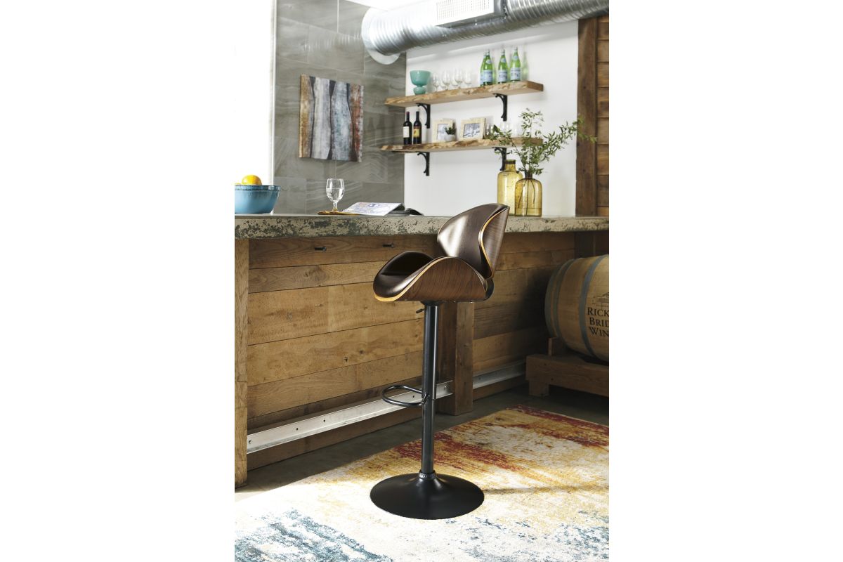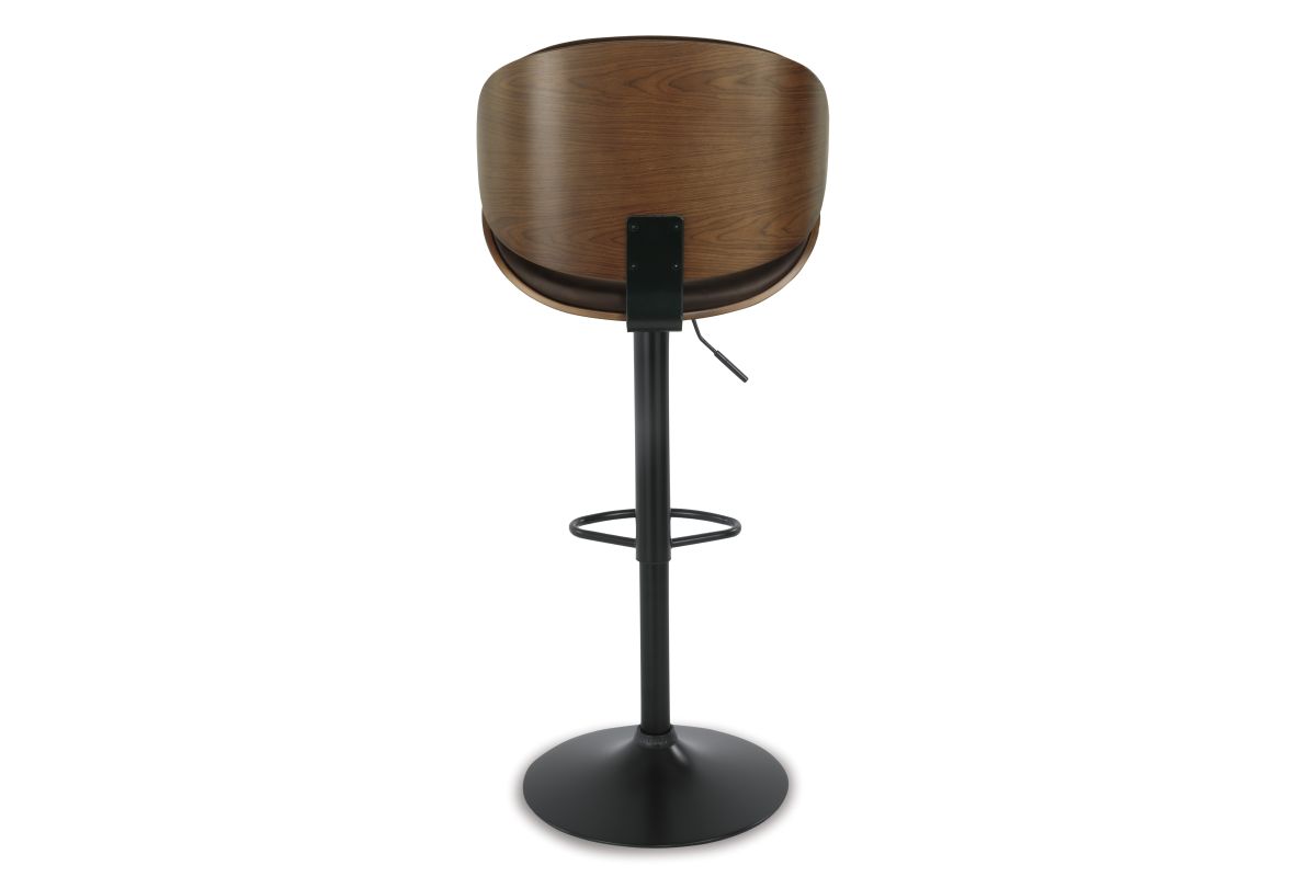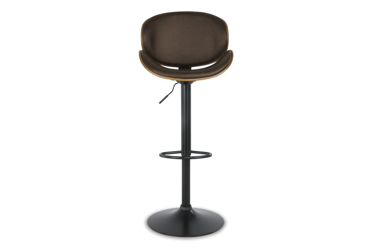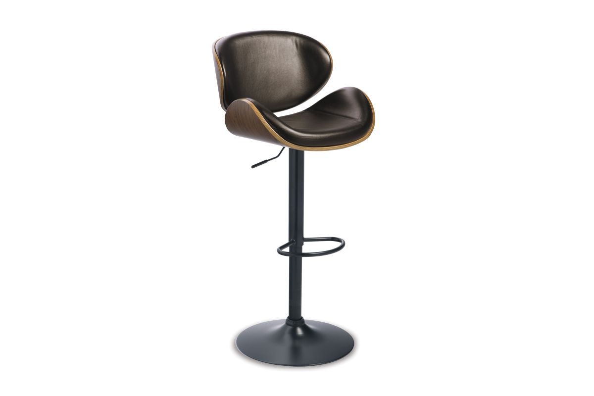 Style takes quite a modern turn. Sporting a distinctively contoured back and seat design, this upholstered swivel bar stool is sure to bring an elevated look to your living space. Wrapped in a brown faux leather upholstery, the seating area’s artful contours are accentuated with a faux wood finish.