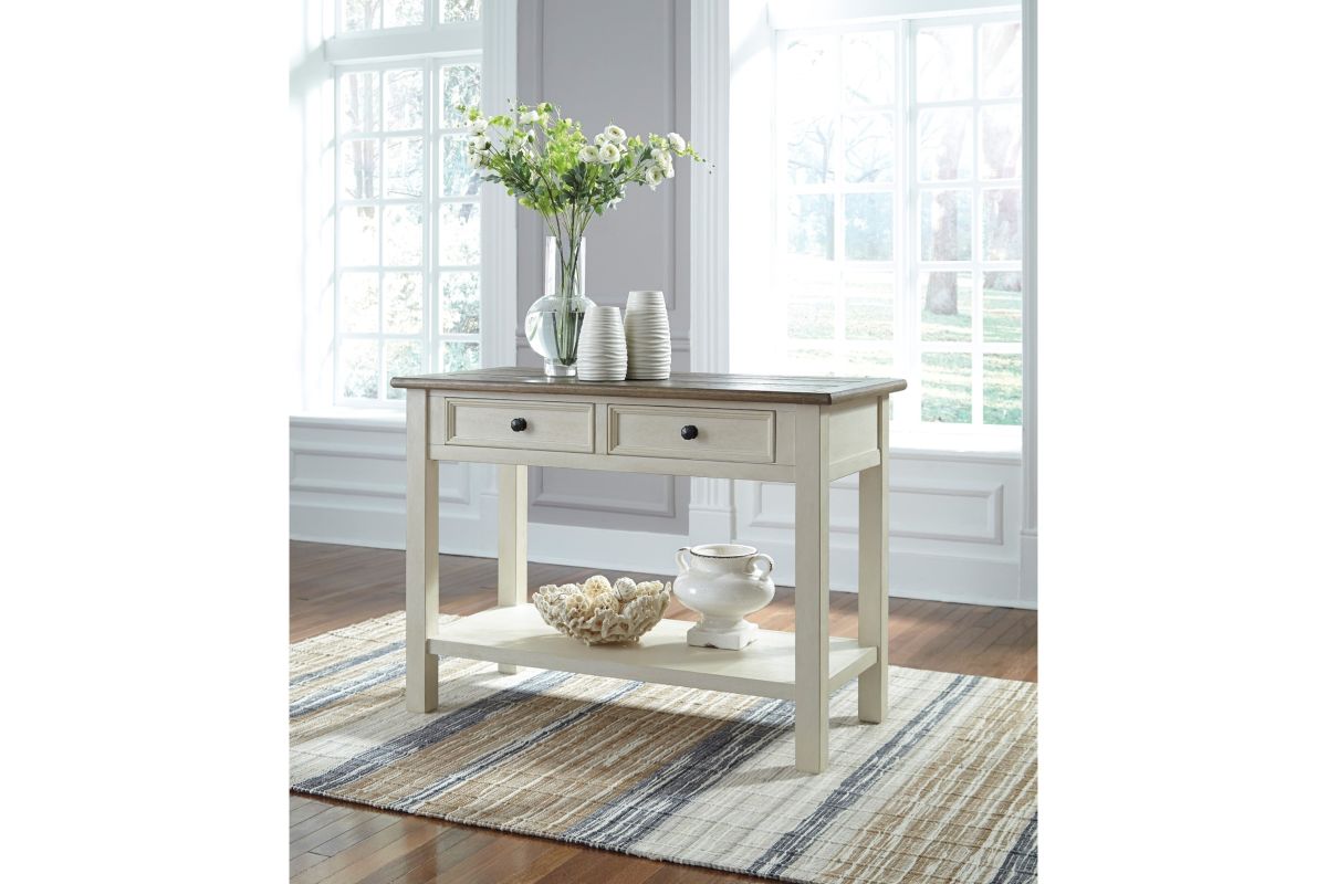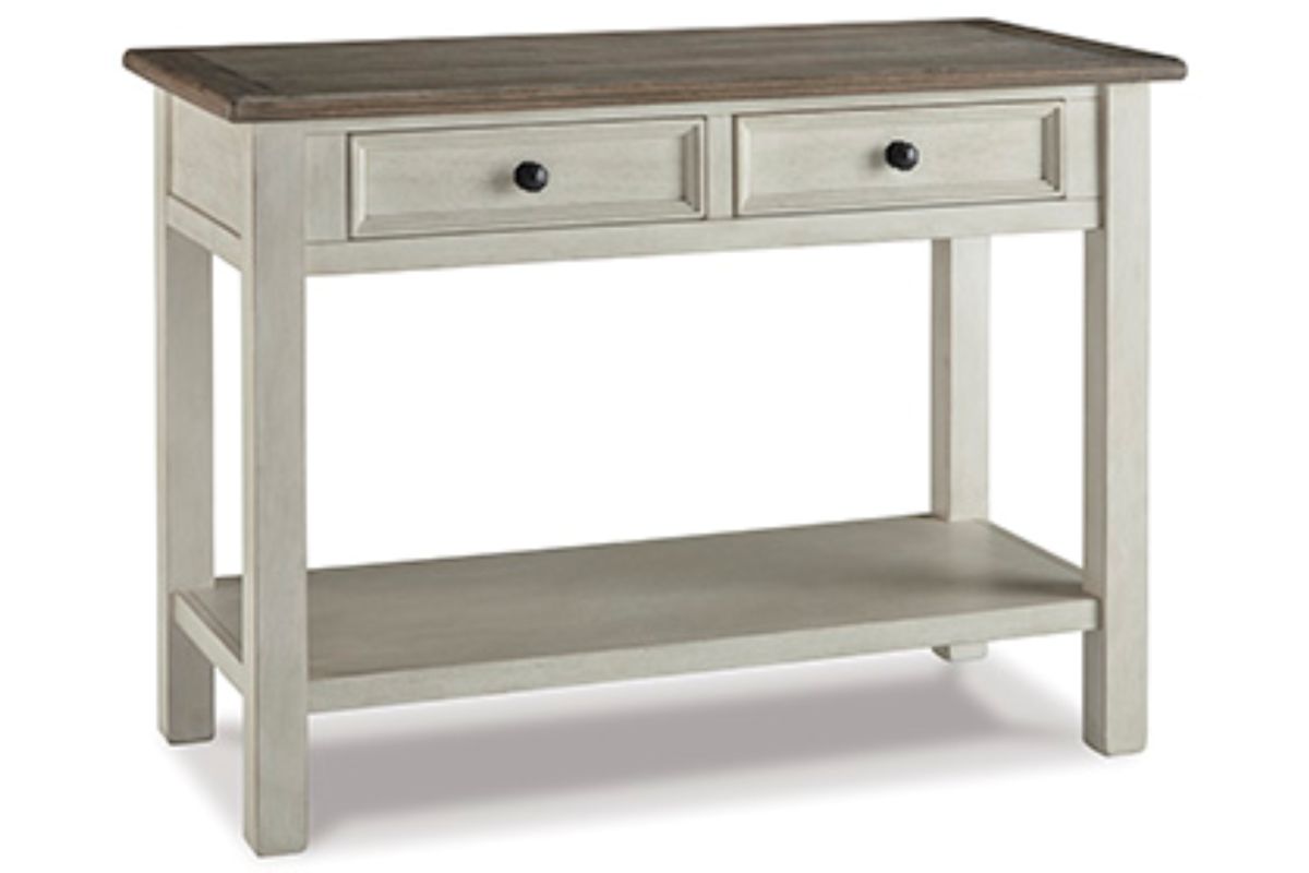Store and showcase your favorite things with this sofa table. Its textured antique white finish creates a vintage two-tone look that will endure for years.