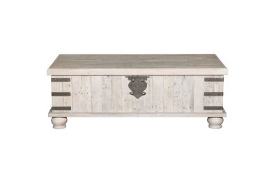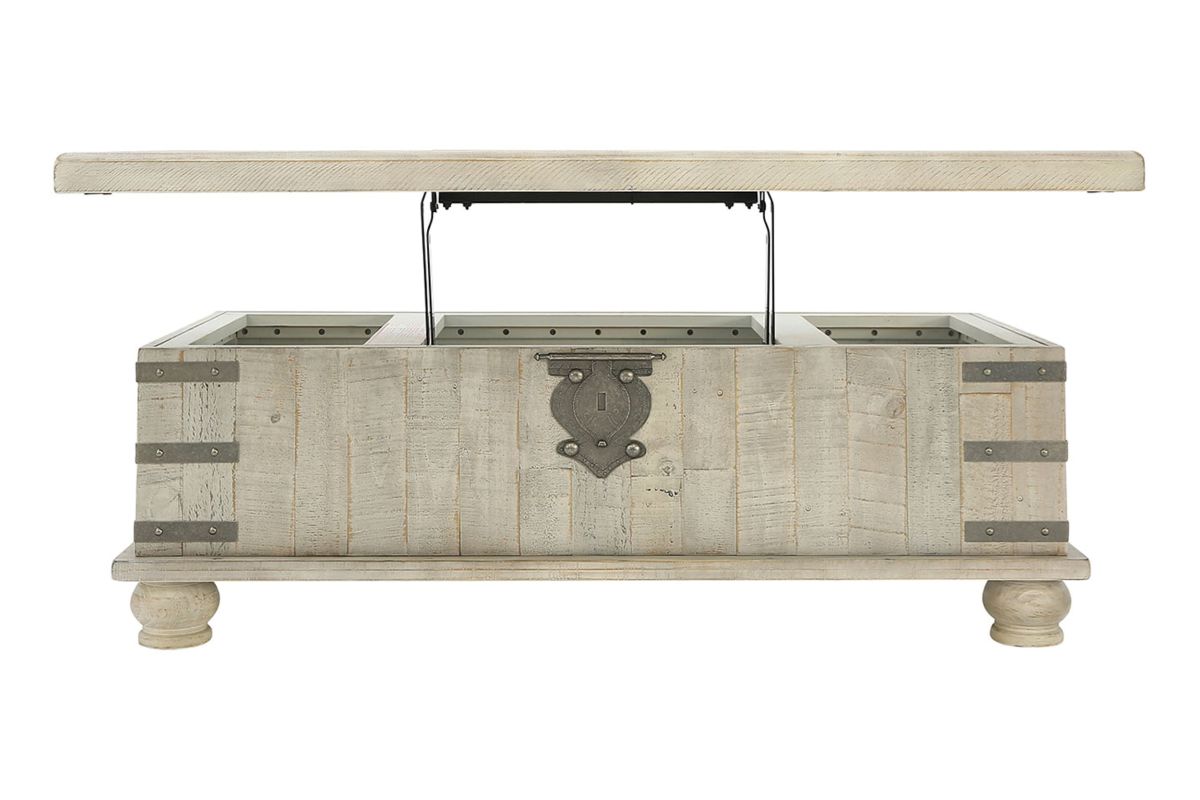 Unlock a quaint touch of farmhouse style and convenience in your living area with this lift top coffee table. Its design is inspired by the rugged looks of an antique storage trunk. Metal keyhole and bracket accents with rivets, a planked effect and large recessed bun feet dress up this charming piece. The distressed light gray finish enhances the reclaimed wood's natural grain, which delivers a naturally aged feel. You'll love its generous scale, offering a roomy top that's ideal for displaying accents and more. Lift the top and enjoy the accommodating work or dining surface. Under the lift top, there's a fully finished storage area—deeply spacious for organization.