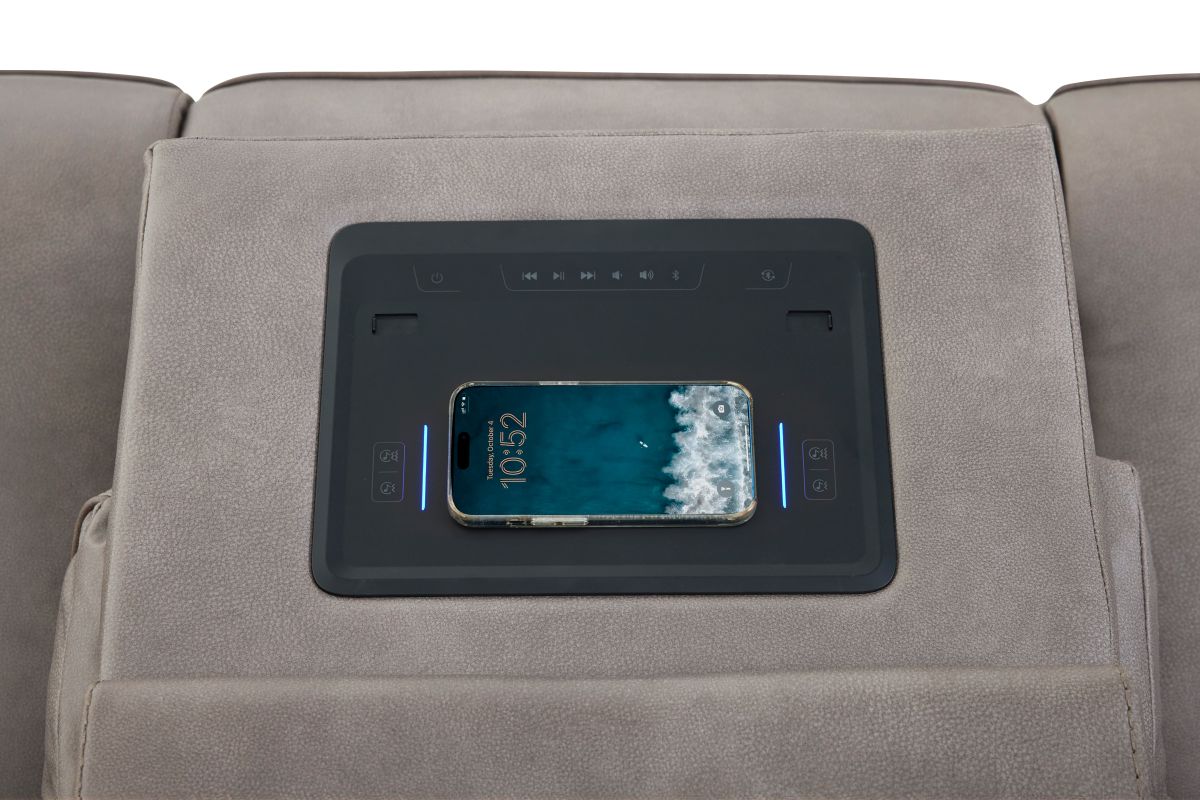 At the center of the sofa, the Okin drop-down audio table delivers seamless convenience and next-level entertainment. Equipped with immersive audio through built-in Bluetooth speakers, it brings a theater-like sound experience right to your living room. The table also features mass vibration, wireless charging, and versatile USB-A and USB-C ports so your devices stay powered and accessible.