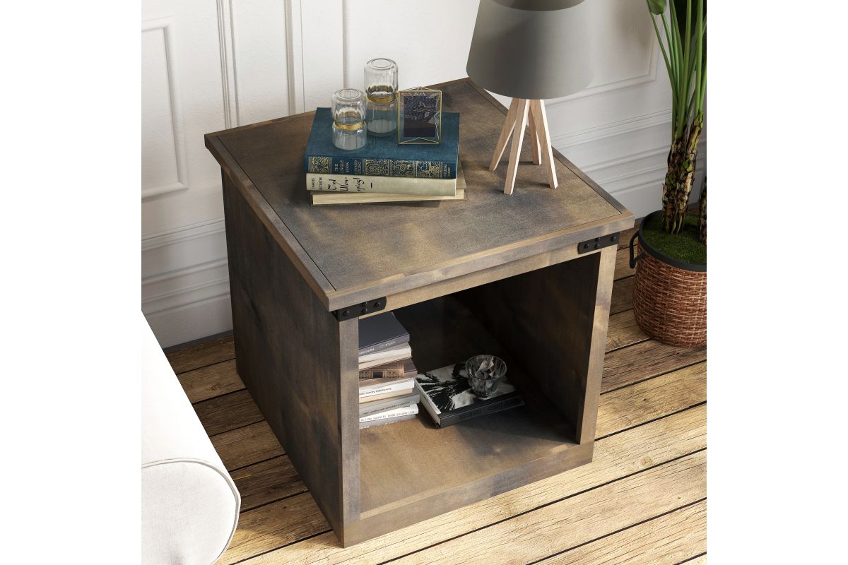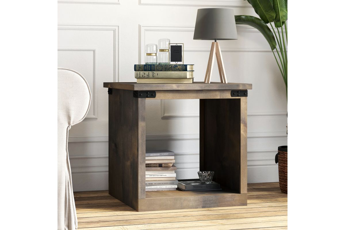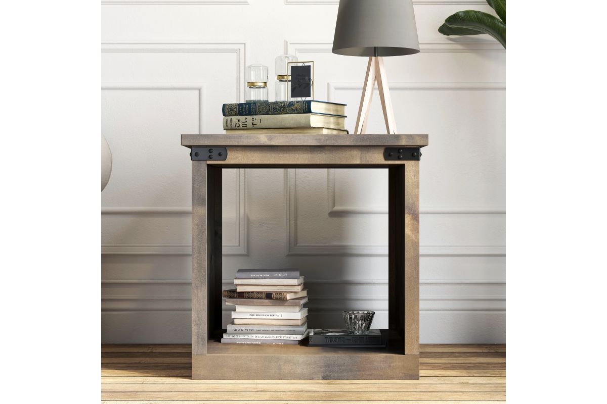 Enhance your living space with the Farmhouse End Table, a perfect match for modern farmhouse decor. This end table combines open storage with chic metal accents, ensuring both style and functionality. Coordinate it seamlessly with our Farmhouse TV and Fireplace Stands for a complete look.