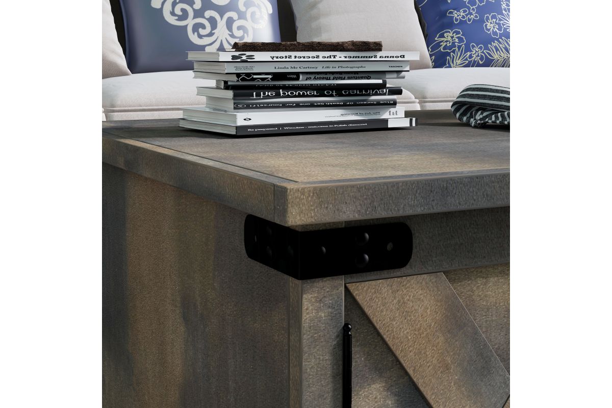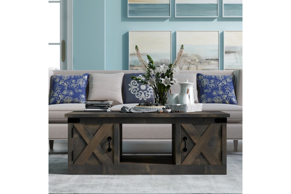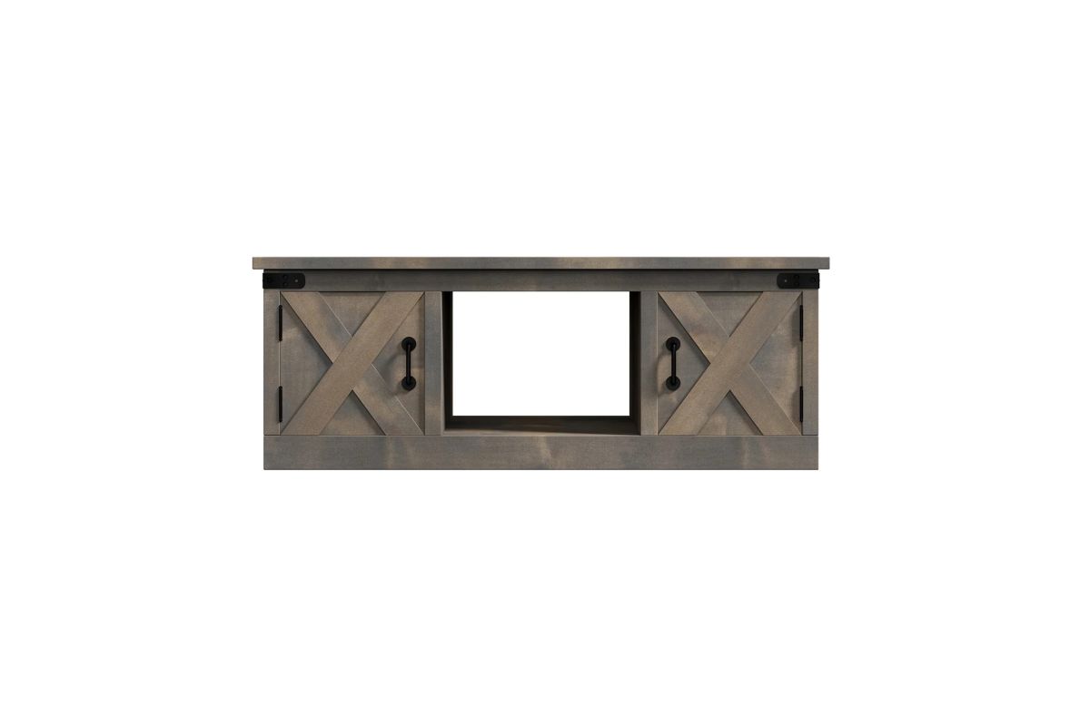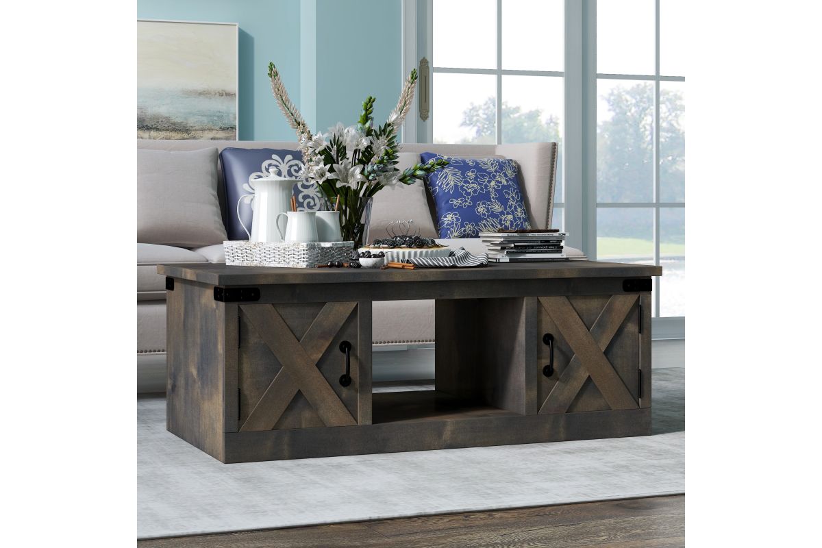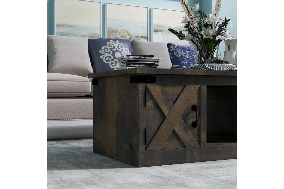 Enhance your living space with the Farmhouse Coffee Table, a key piece in achieving a modern farmhouse aesthetic. This coffee table boasts four barn-style doors and open storage, accented with metal details for a rustic touch. Perfectly complements our Farmhouse TV and Fireplace Stands, ensuring a cohesive and stylish look in your living room.