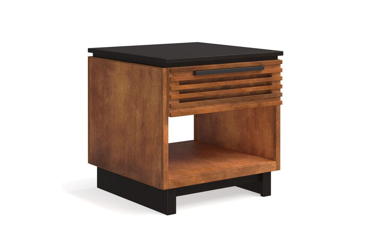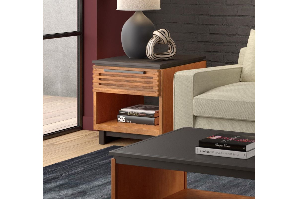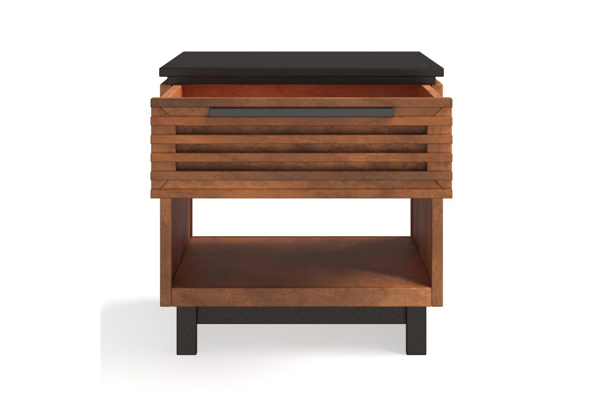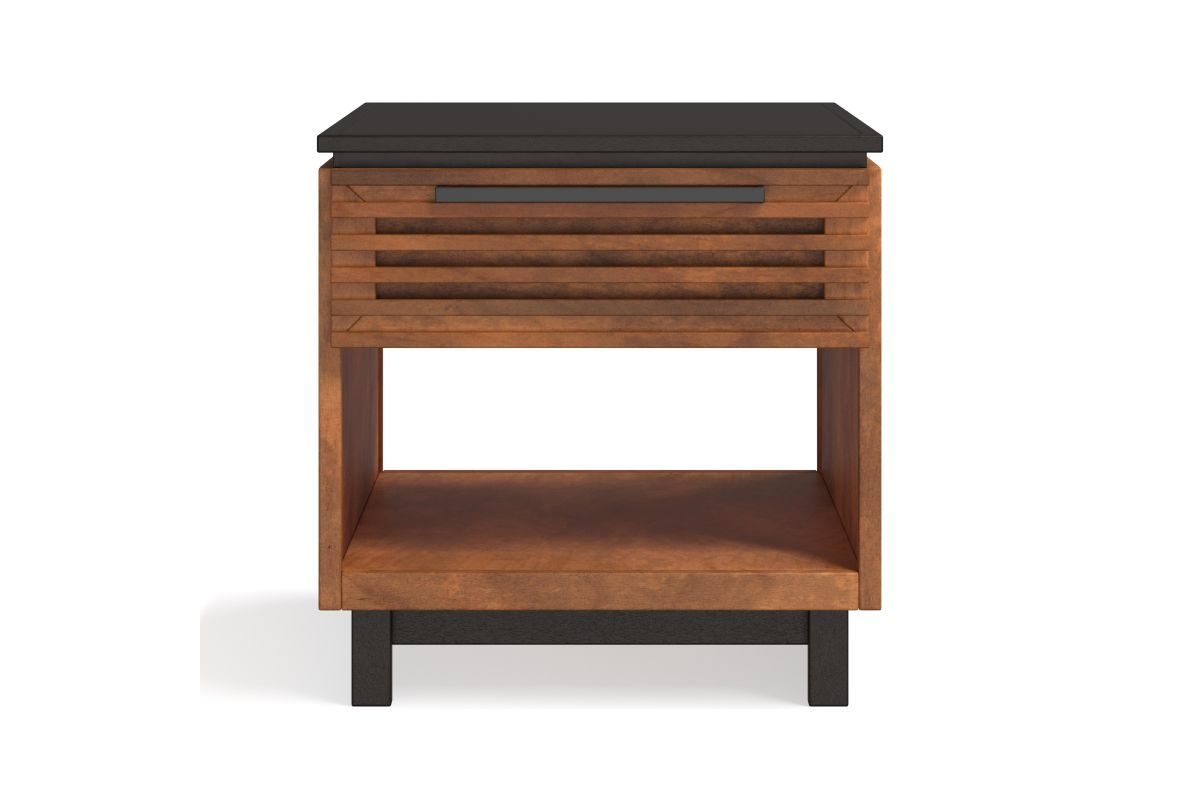 The Graceland End Table seamlessly enhances your living space with its contemporary two-toned design and slatted doors, matching perfectly with our Graceland TV and Fireplace Stands. This chic end table features a spacious drawer and an open shelf, providing ample storage to keep your living area both stylish and organized. Elevate your home decor with this striking and functional piece.