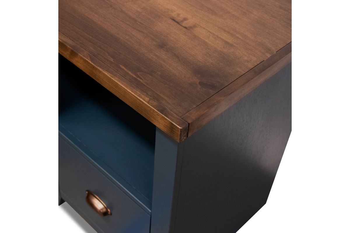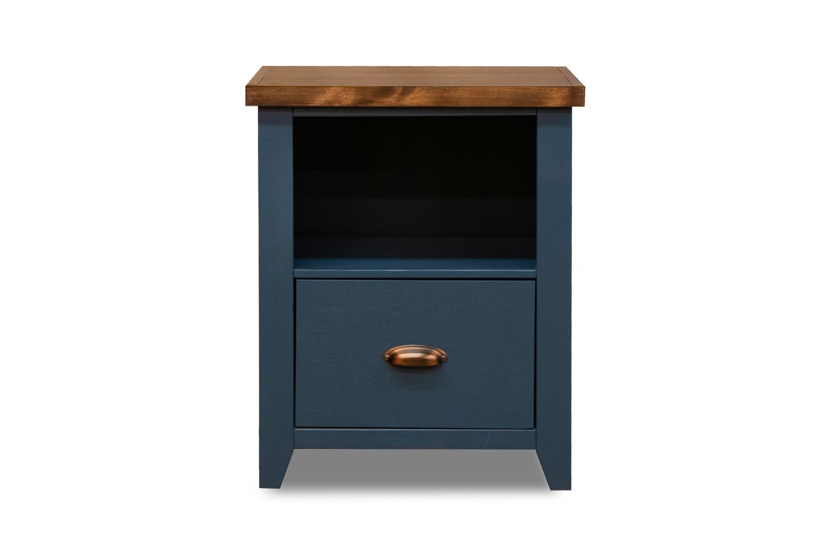 The Nantucket One Drawer File Cabinet combines the charm of coastal cottage aesthetics with the simplicity of modern farmhouse design. Finished in an eye-catching Blue Denim and Whiskey, this piece features oil-rubbed bronze hardware, a storage drawer, and a shelf, complementing any home office or study area. It pairs perfectly with the matching writing desk for a cohesive look.