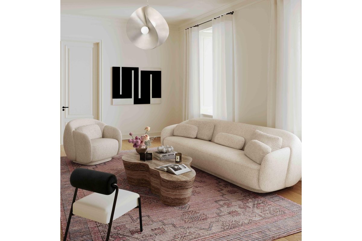 Introducing Misty: This textural set, sofa and accent chair, is a welcome addition to any home. It doesn't get cozier than this mid-century inspired design, topped with coordinating pill-shaped pillows and upholstered in a delicious cream or brown boucle!