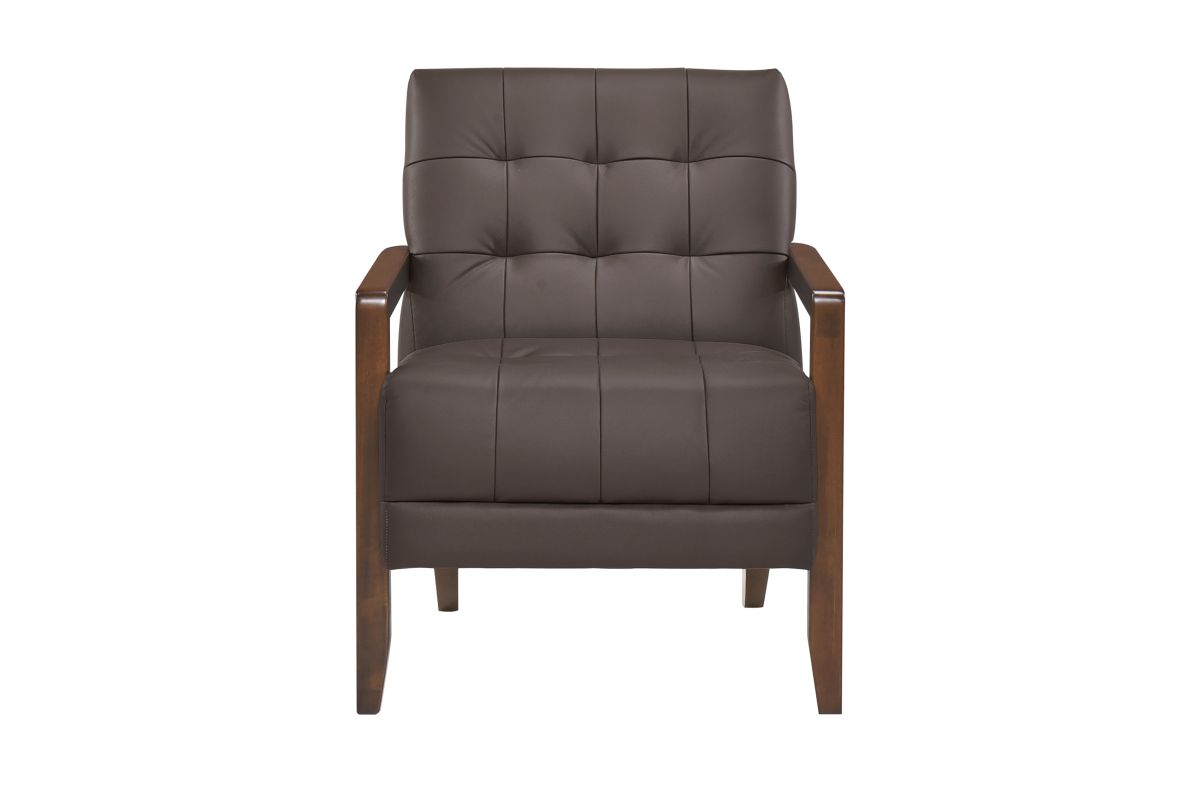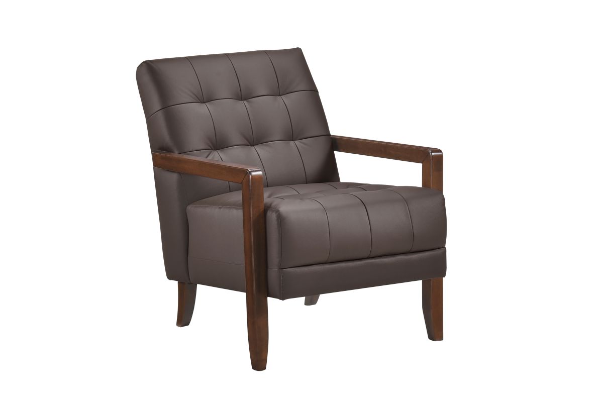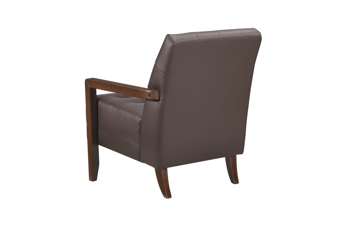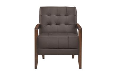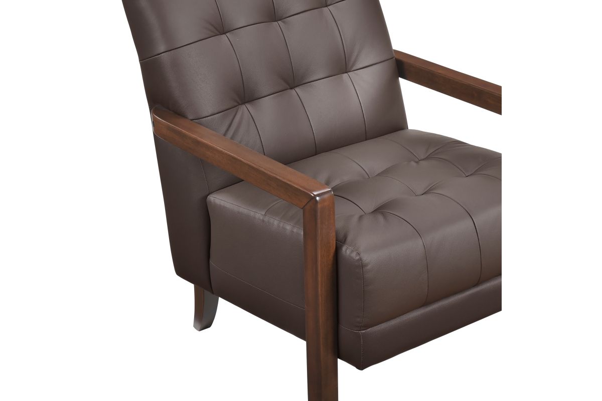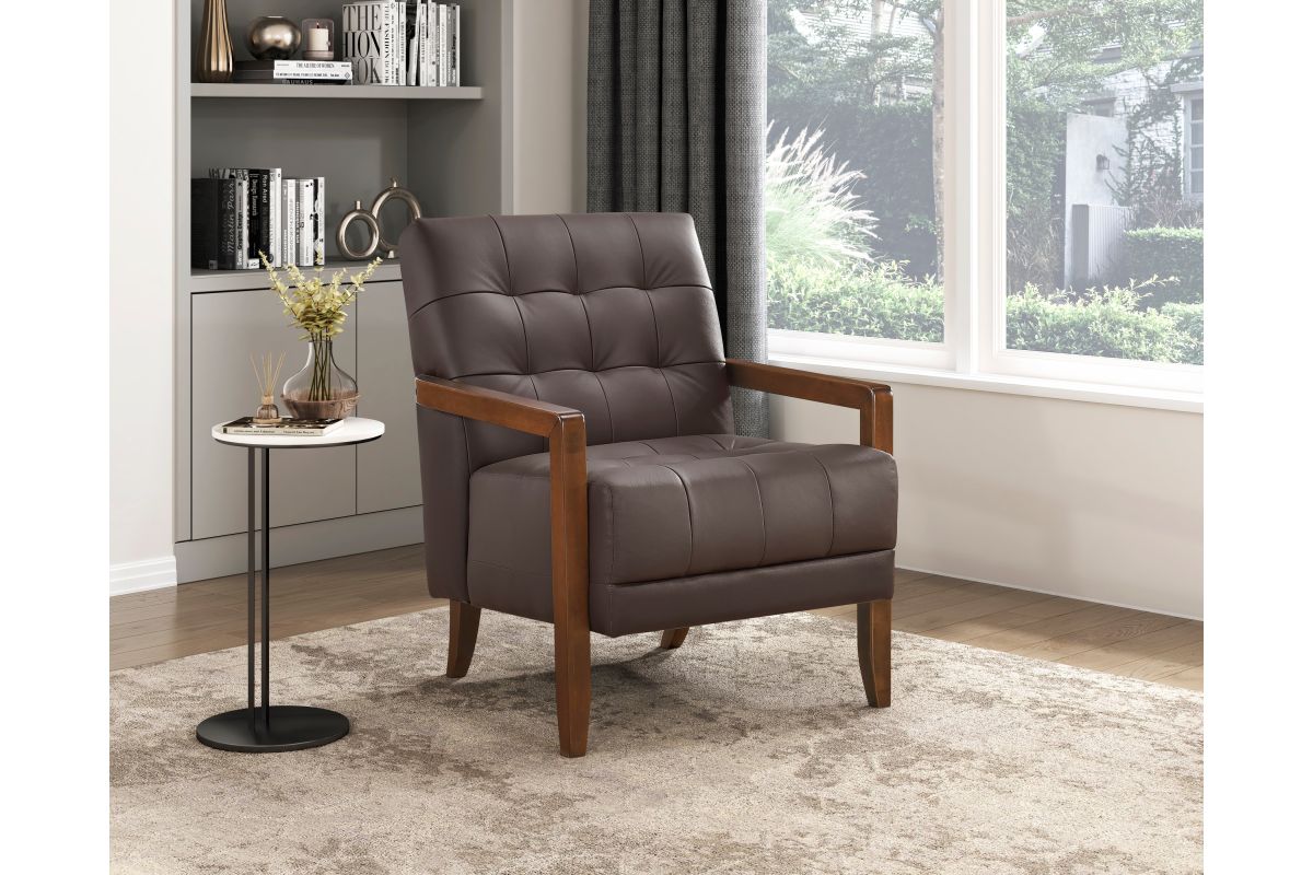 Elevate your living space with this top grain leather match accent chair, designed for timeless elegance, premium comfort, and lasting durability. Featuring a mid-century modern silhouette, deep tufted detailing, and a solid wood frame with sleek armrests, this chair blends sophisticated style with everyday functionality. The plush, high-density foam cushioning provides exceptional support, while the top grain leather match upholstery offers a luxurious look and soft, supple feel. Built with sturdy wooden legs and reinforced construction, this accent chair is perfect for living rooms, home offices, reading nooks, or bedroom seating, adding a touch of refined charm to any decor.