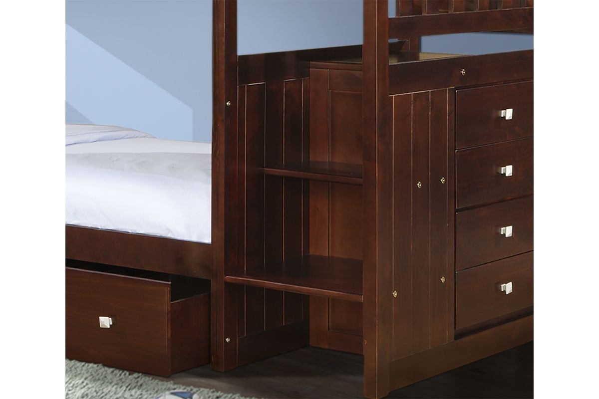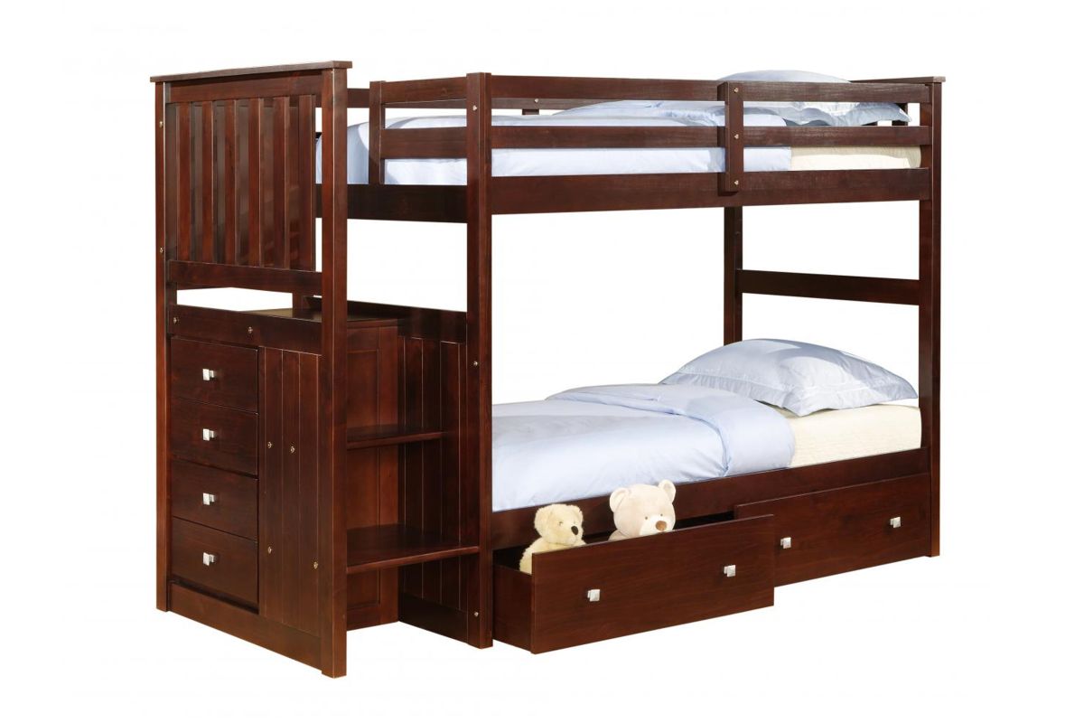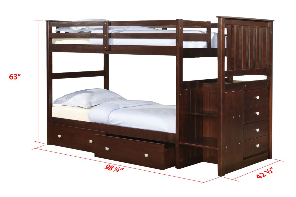 Transform bedtime into a charming adventure with our Donco Kids Mission Cappuccino Twin over Twin Stairway Bunk Bed. Crafted with love and precision, this bunk bed not only adds a touch of warmth to your child's heaven but also elevates functionality. The Mission headboard panels exude timeless elegance, while the rich cappuccino finish creates a cozy ambiance. As your little ones ascend the stairway to dreams, the 4-drawer chest whispers of secret treasures and clever space-saving. Embrace the joy of bedtime stories and laughter, making every night a tale of shared dreams and enduring comfort.