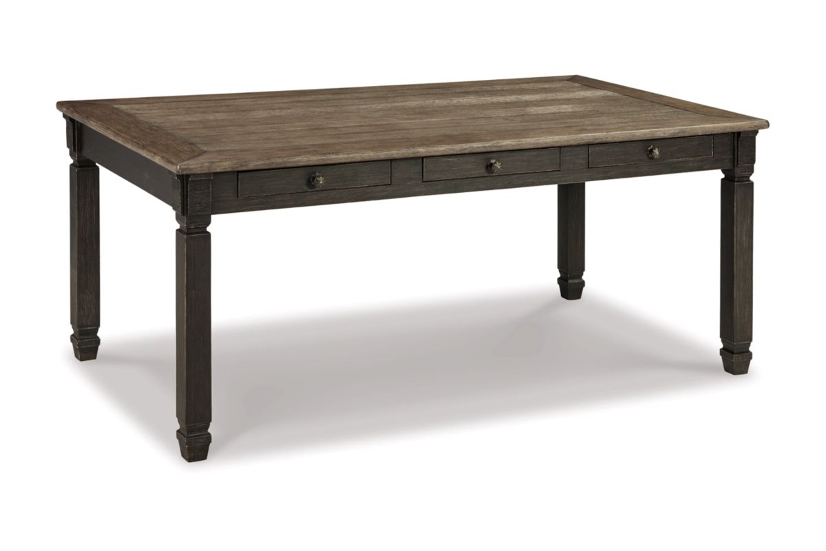 Invite your family into the heart of your home with the Tyler Creek rectangular dining room table. Its tapered legs, in a beautifully textured black finish, provide a sturdy foundation. A timeworn planked oak top creates a unique two-tone contrast, while drawers offer plenty of storage space for smaller items. This is trend-right urban farmhouse style.