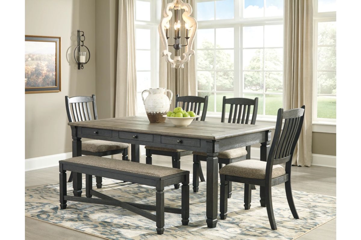 Invite your family into the heart of your home with the Tyler Creek rectangular dining table set. Tapered legs, in a beautifully textured black finish, provide a sturdy foundation. The heavily woven fabric on the chairs and bench has a quality feel-good touch. A timeworn planked oak tabletop creates a unique two-tone contrast. And drawers offer storage space for smaller items. This is trend-right urban farmhouse style. Assembly required.