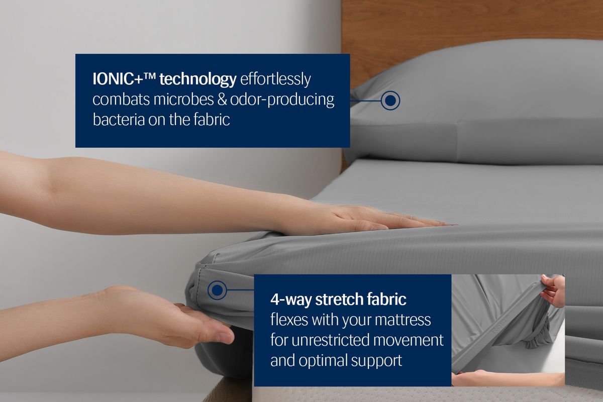 • Cool to the touch while maintaining an ideal and regulated temperature all night long. • Flexible 4-way stretch prevents hard spots, while an ideal balance of softness and smoothness ensures all-night comfort. • Ionic+® technology inhibits bacterial growth, preventing odors and stains to maintain a cleaner, fresher surface over time. • Machine washable
