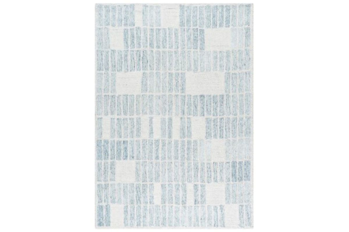 - Hand-tufted high-low geometric design in blue and ivory for a modern, eye-catching look
