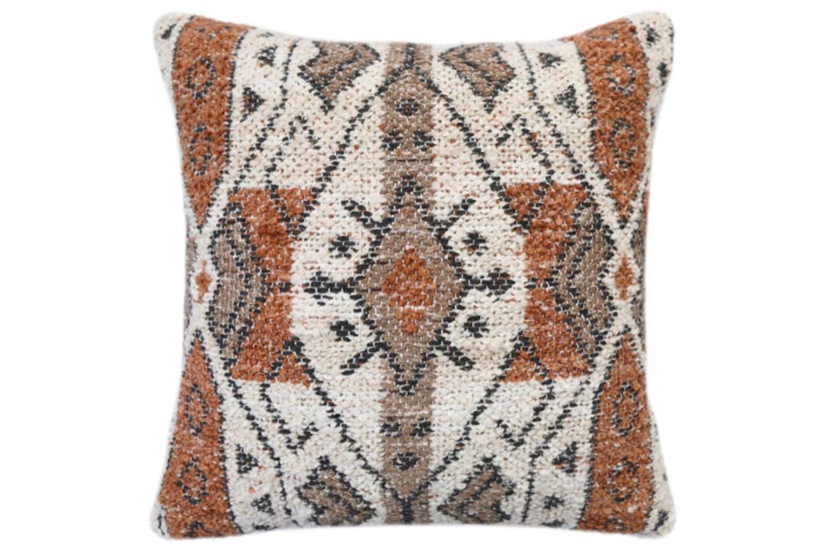 This set features a machine-woven Aztec-inspired design in rich sienna, beige, black, and brown tones, offering a dynamic and modern look. Each pillow has a solid white reverse for versatile styling, a durable polyester cover, and a convenient zipper closure. The fiber filling ensures plush comfort, making these pillows both stylish and practical for everyday use. Ideal for adding a pop of pattern and color to sofas, beds, or accent chairs.