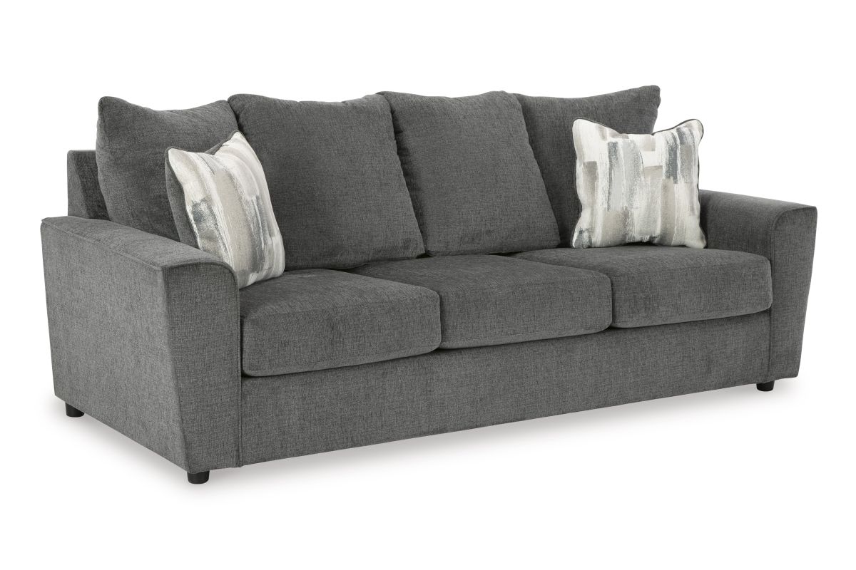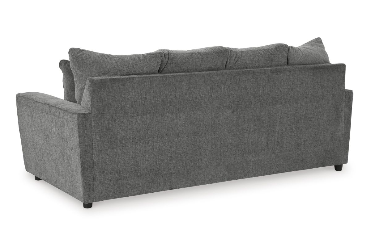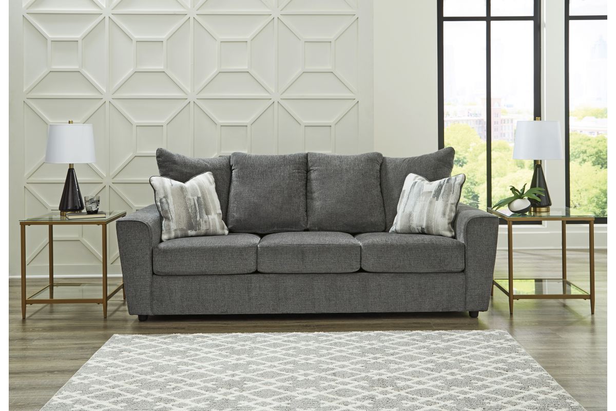 What's new in neutrals? Shades of gray, of course. Embrace the sophisticated design trend with this gorgeous sofa, which offers a clean-lined, contemporary style at a comfortably cool price. Sure to lift your spirits, the plush chenille fabric is fabulously neutral. Modern flared arms give it a distinctive flair. This sofa also arrives with two cool brushstroke accent pillows to elevate the taste and comfort level.