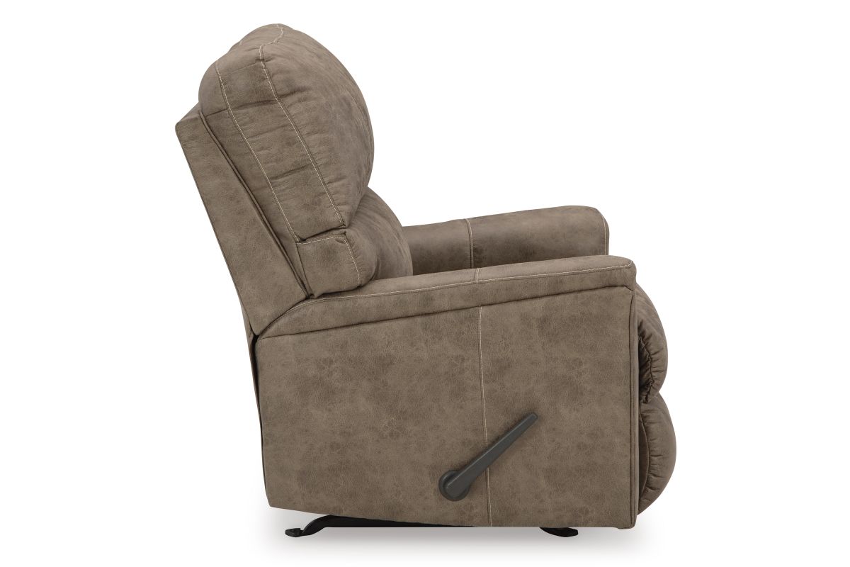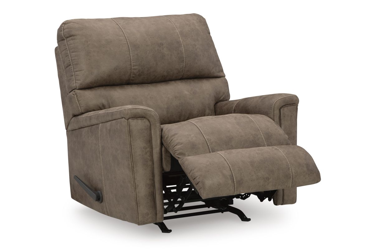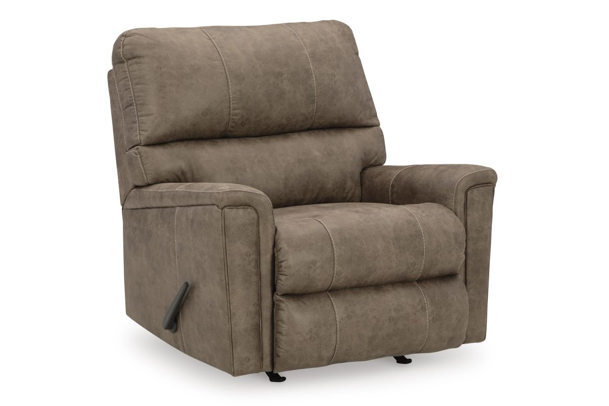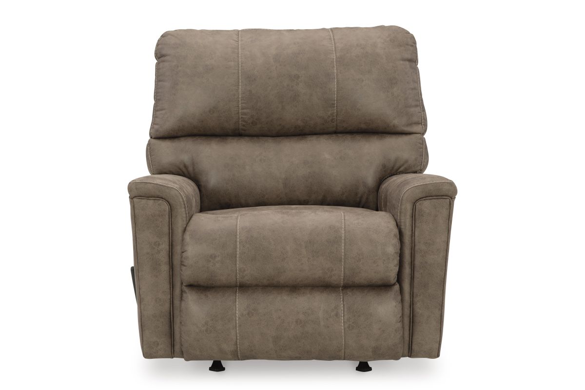 If you love the cool look of leather but long for the warm feel of fabric, you can take comfort in this rocker recliner. Wrapped in a fabulous faux leather with a weathered hue and hint of pebbly texture to resemble the real deal, this decidedly modern recliner proves less is more. Elements include angled side profiling and track armrests wrapped with a layer of pillowy softness for that little something extra. Prominent jumbo stitching and clean-lined divided back styling lend fashion-forward flair.
