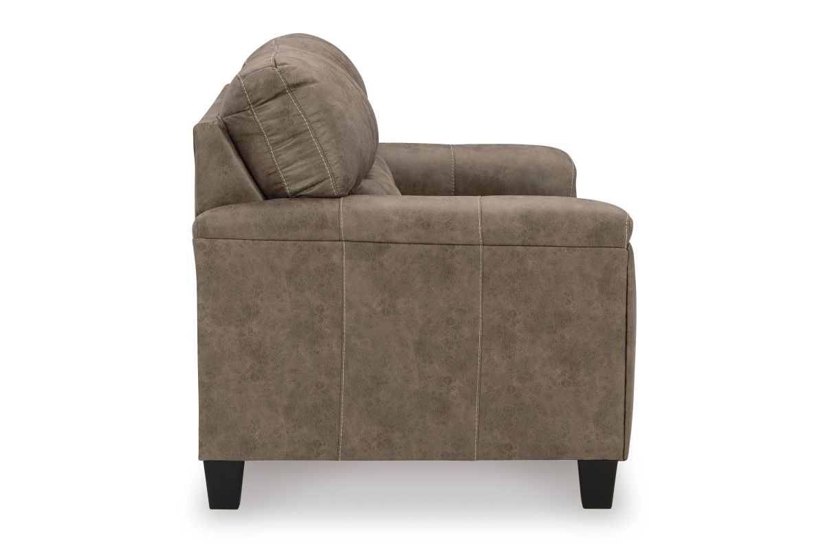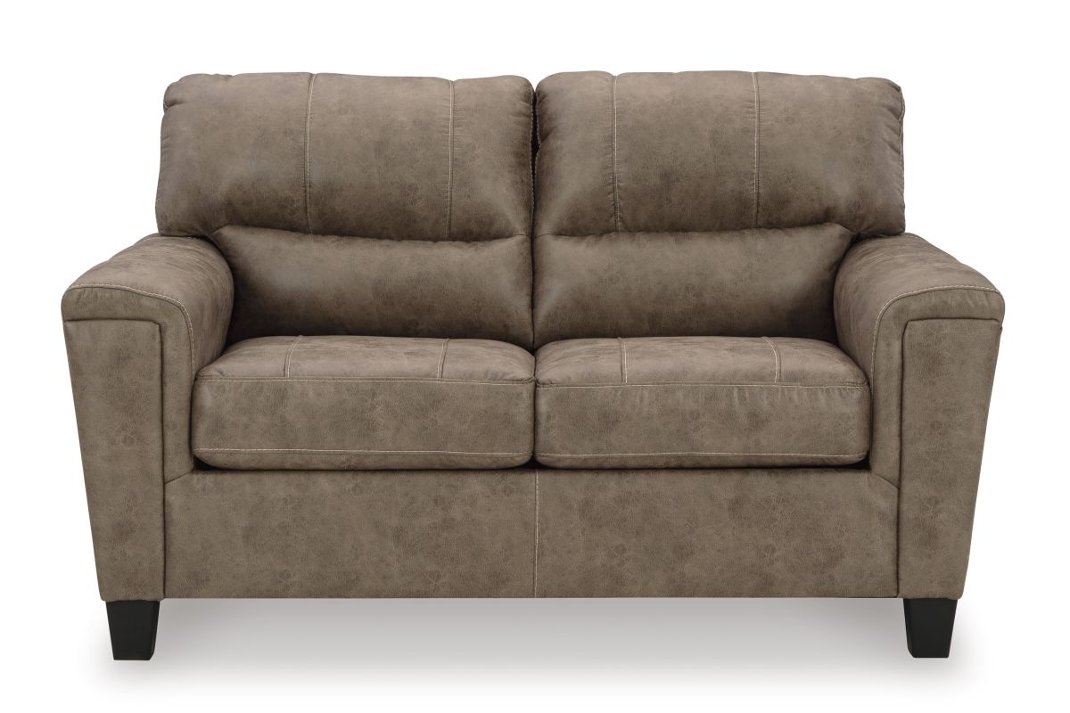 If you love the cool look of leather but long for the warm feel of fabric, you can take comfort in this loveseat. Wrapped in a fabulous faux leather with a weathered hue and hint of pebbly texture to resemble the real deal, this decidedly modern loveseat proves less is more. Elements include angled side profiling and track armrests wrapped with a layer of pillowy softness for that little something extra. Prominent jumbo stitching and clean-lined divided back styling lend fashion-forward flair.