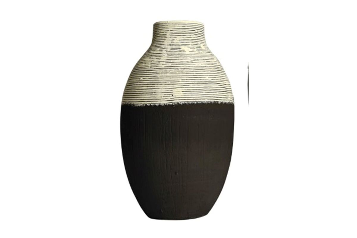 The Girtha Vase by Ashley Furniture is a decorative accent crafted from poly resin with an antique white and black finish. Due to its unique finishing process, each vase features subtle variations in appearance, adding to its character. The vase is not watertight, making it best suited for displaying dried or faux botanicals. Its contemporary color palette and durable construction make it a versatile choice for shelves, mantels, or tabletops in a variety of decor settings.