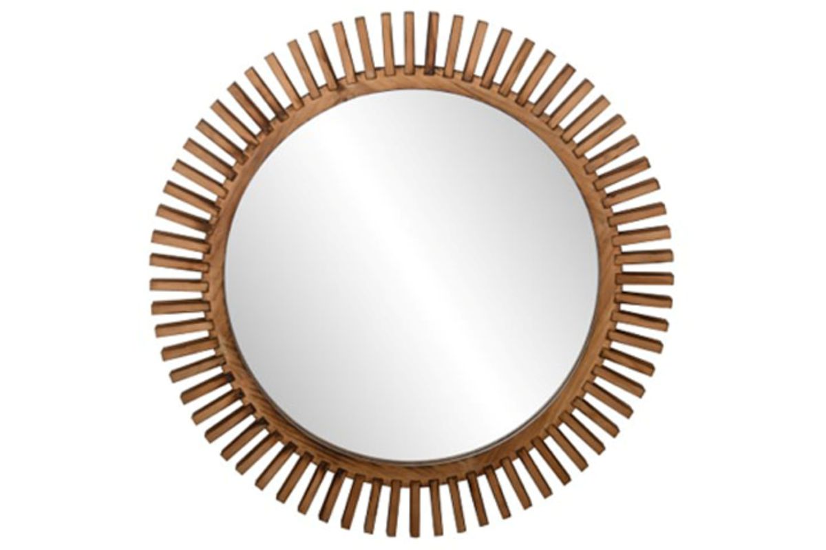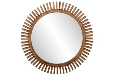 The Tedwell Accent Mirror features a distinctive sunburst design crafted from brown-finished wood, making it a statement piece for any room. Its round silhouette (approximately 32" in diameter) and use of natural materials bring warmth and visual interest to your space. The sawtooth bracket makes it easy to hang, and the unique pattern ensures each piece has subtle variations, adding to its artisanal appeal. This mirror is ideal for those seeking a decorative accent that blends rustic charm with modern flair.