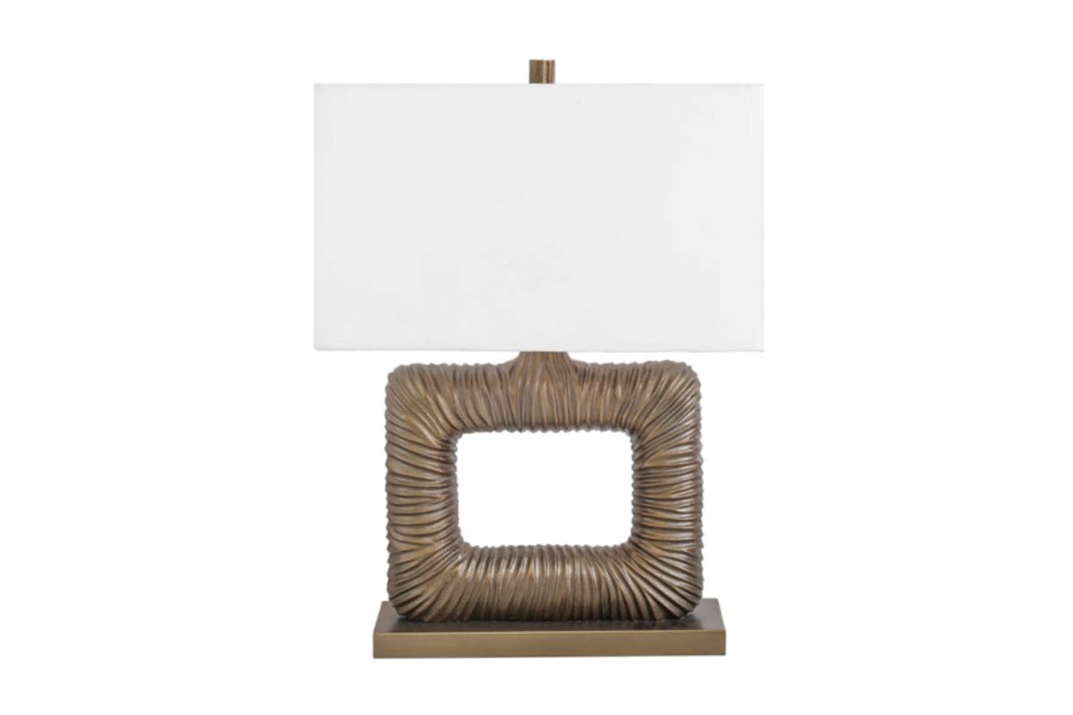 - Antique brass finished cast aluminum table lamp