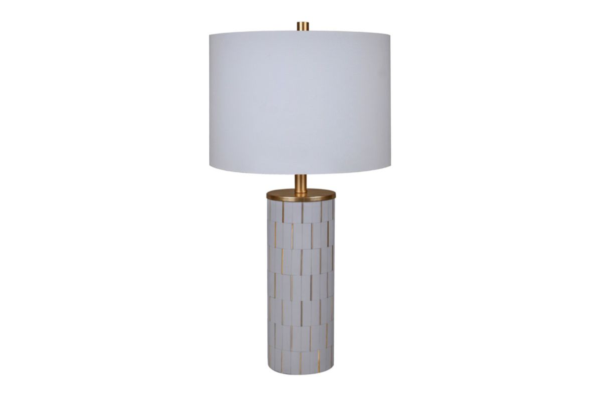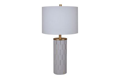 The Faridworth Table Lamp enchants with its white resin mosaic base and gleaming brass accents, creating a luminous centerpiece for any room. Its drum hardback shade and three-way switch invite you to set the perfect mood, whether you're sharing quiet moments or lighting up the night. With every soft glow, this lamp turns ordinary evenings into romantic memories, bathing your space in warmth and sophistication.