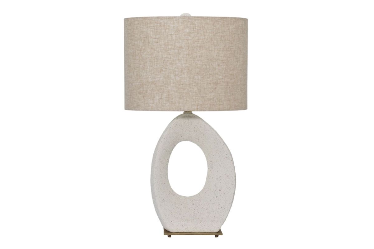 This lamp features a cream speckle finished paper composite base paired with gold-finished aluminum accents, creating a sophisticated yet approachable look. Its oval drum hardback shade provides a soft, diffused light, ideal for cozy or ambient settings. The 3-way switch allows for customizable lighting levels, enhancing its versatility. The combination of the tactile, speckled base and metallic detailing gives the lamp a unique visual appeal that distinguishes it from more conventional designs, making it a perfect accent for contemporary or transitional interiors.