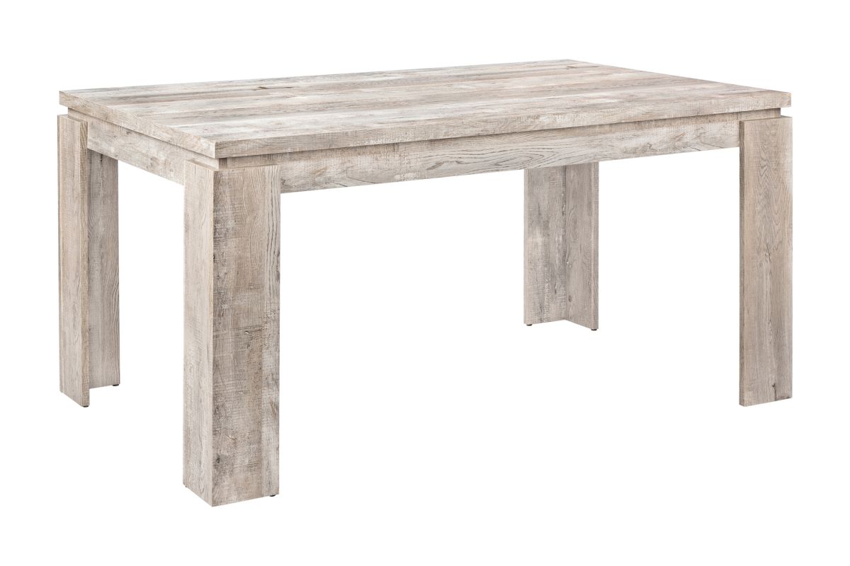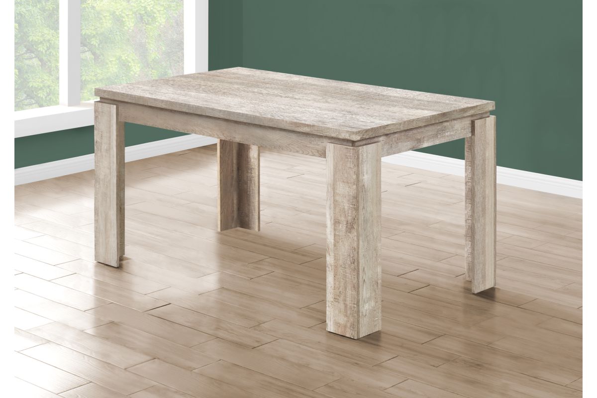 Looking for rustic? Looking for contemporary? How about both? This taupe thick-paneled kitchen table features a unique reclaimed wood look surface to offer the perfect unique style for your new place. The modern dining table also features thick, open block shaped legs to keep everything nice and sturdy. When it's time to make a statement in your home, count on this kitchen table to do the trick in a casual or formal dining setting. Chairs sold separately.