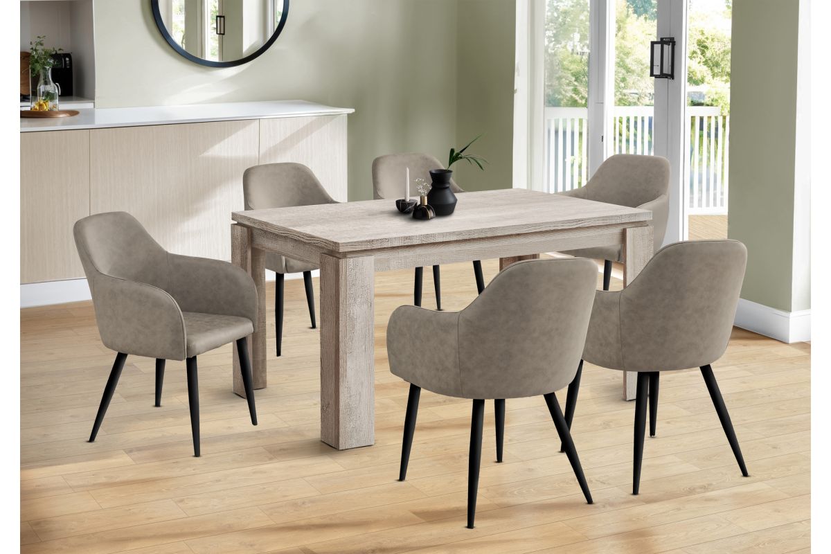 - Dining table in a trending taupe reclaimed wood look finish with thick, block-style legs to keep everything in its place during your large gatherings