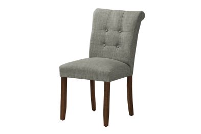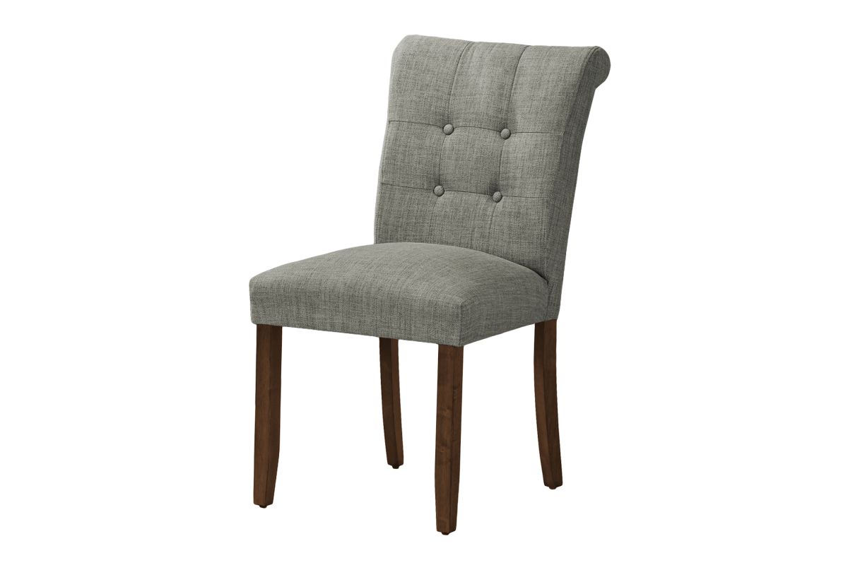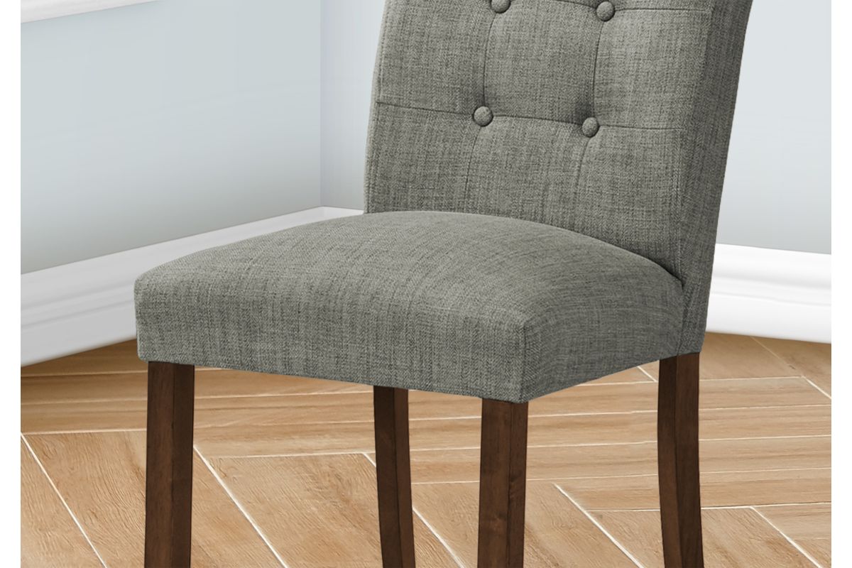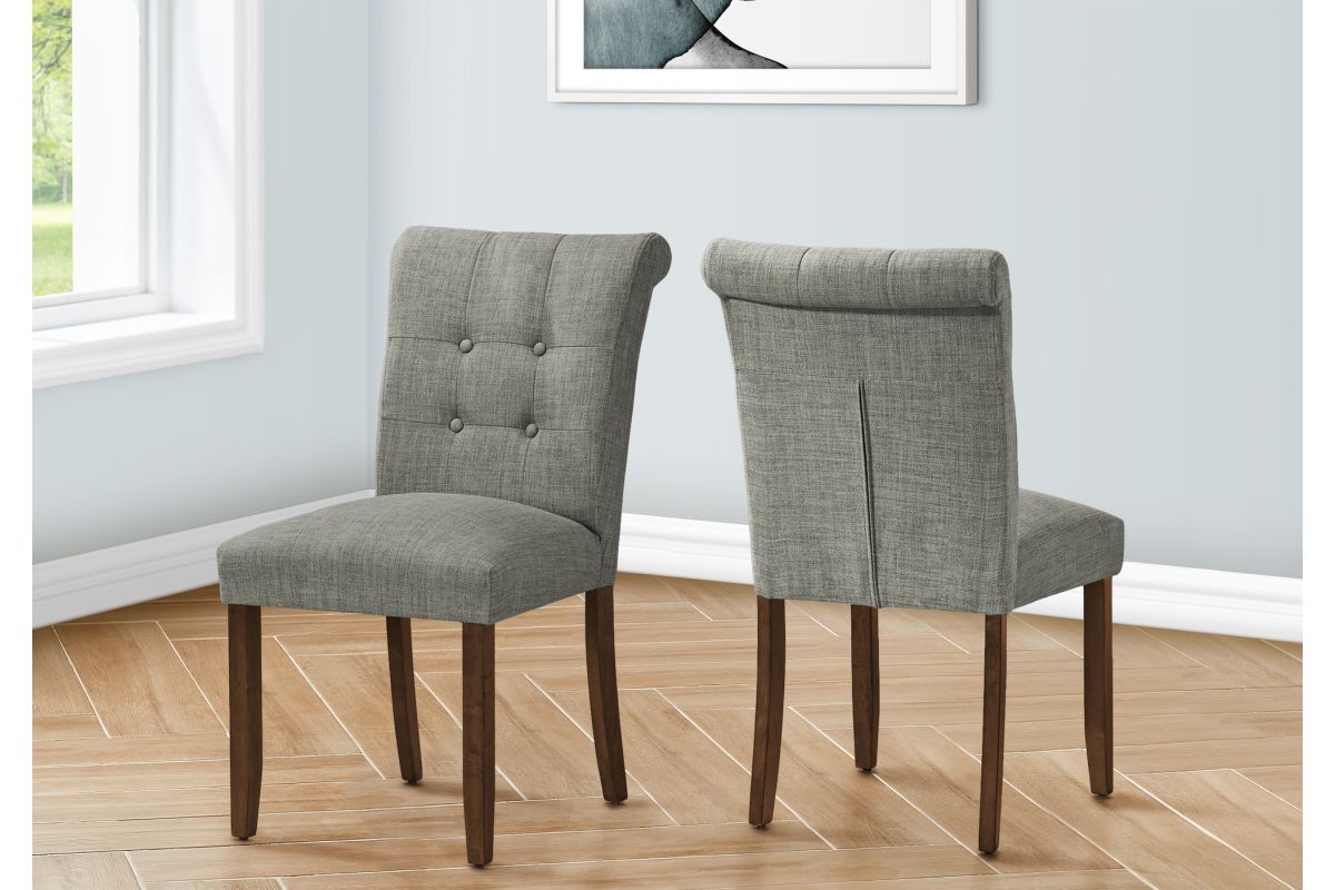 Add comfort and style to your casual family dining experience with this set of 2 upholstered, linen-look grey fabric dining chairs. Standing at a 38" height, these side chairs offer sturdy construction with the solid, brown walnut wood legs and thick foam padding on the seat and tufted, curved back, bringing some fashionable style to your dining room or kitchen. The illustrated instructions that are included makes these chairs easy to assemble and use right away. Backed by a 2 year limited warranty against any defects, these modern and comfortable dining chairs are a must-have for the trendiest of homes. Pair these with a chic dining table (sold separately) to create an inviting dining space.