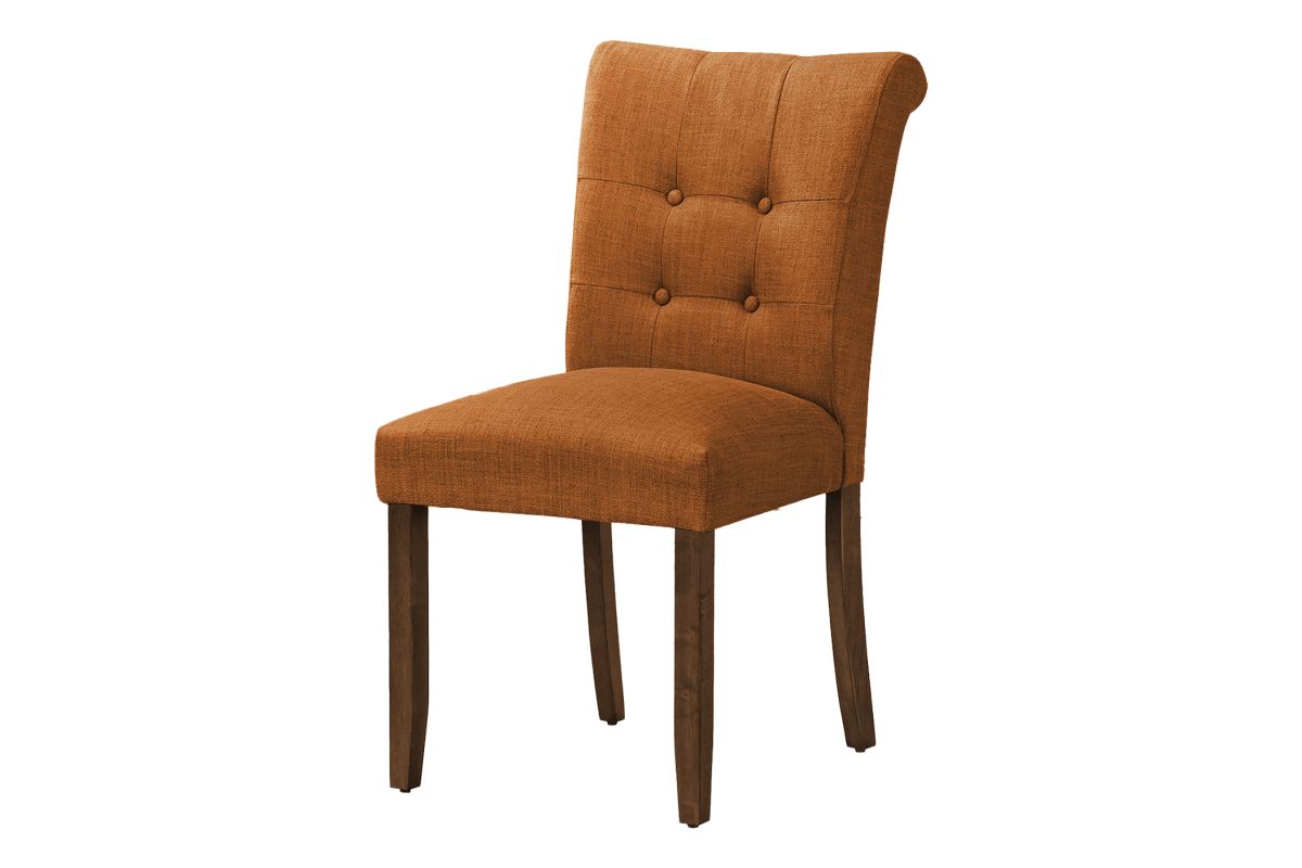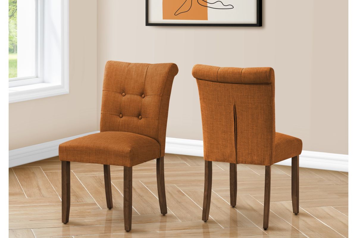 Add comfort and style to your casual family dining experience with this set of 2 upholstered, linen-look orange fabric dining chairs. Standing at a 38" height, these side chairs offer sturdy construction with the solid, brown walnut wood legs and thick foam padding on the seat and tufted, curved back, bringing some fashionable style to your dining room or kitchen. The illustrated instructions that are included makes these chairs easy to assemble and use right away. Backed by a 2 year limited warranty against any defects, these modern and comfortable dining chairs are a must-have for the trendiest of homes. Pair these with a chic dining table (sold separately) to create an inviting dining space.