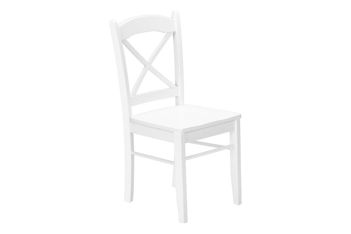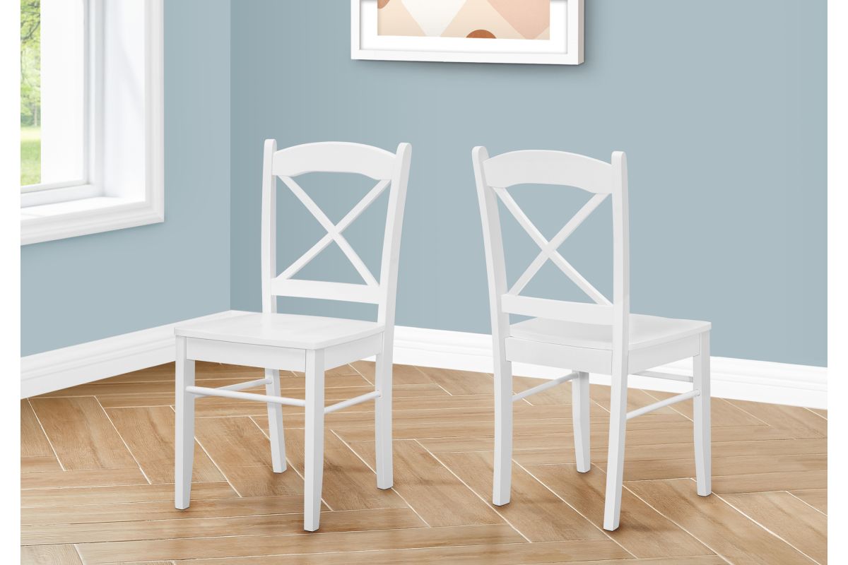 Get ready to re-fresh your dining room or kitchen with this set of 2, solid wood transitional style dining chairs. Finished in a high-quality, smooth satin white finish with a cross back design, these armless chairs perfectly accompany a casual dining area without compromising style. The scooped wooden seats on these versatile side chairs are subtly contoured for comfort with a sturdy frame and wood legs for support. The timeless design of these chairs makes them effortless to place at a kitchen or dining table for everyday use or as accent chairs in a family room, bedroom, library, or study. Easy to assemble, spruce up your home with this set of 2 chairs to provide years of lasting use. These chairs come with a 2 year limited warranty for manufacturer's defect.