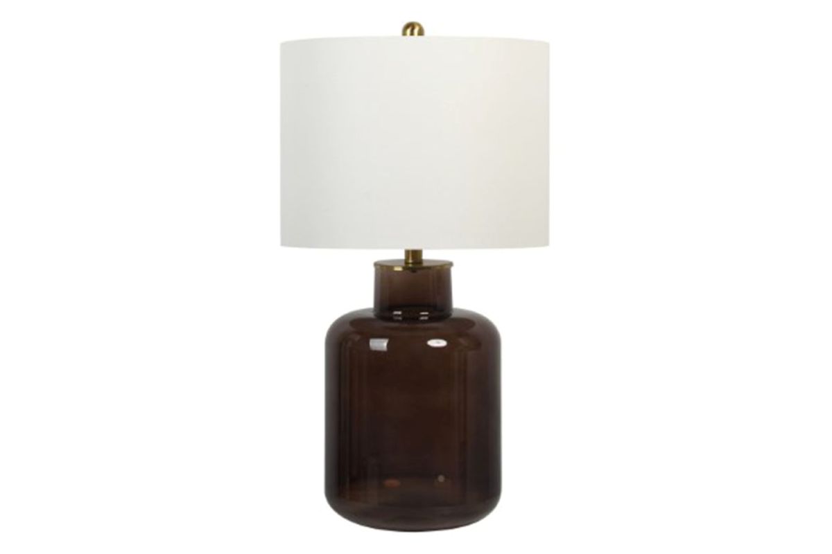 The Ashley Furniture Mette Table Lamp features a brown finished glass base paired with gold finished metal accents, creating a warm, contemporary look. Its drum hardback shade provides soft, ambient light, while the 3-way switch allows for adjustable brightness to suit different moods and tasks. Designed with a single E26 socket and compatible with a type A bulb up to 150 watts, this lamp is both functional and stylish—ideal for living rooms, bedrooms, or offices seeking a touch of modern elegance.