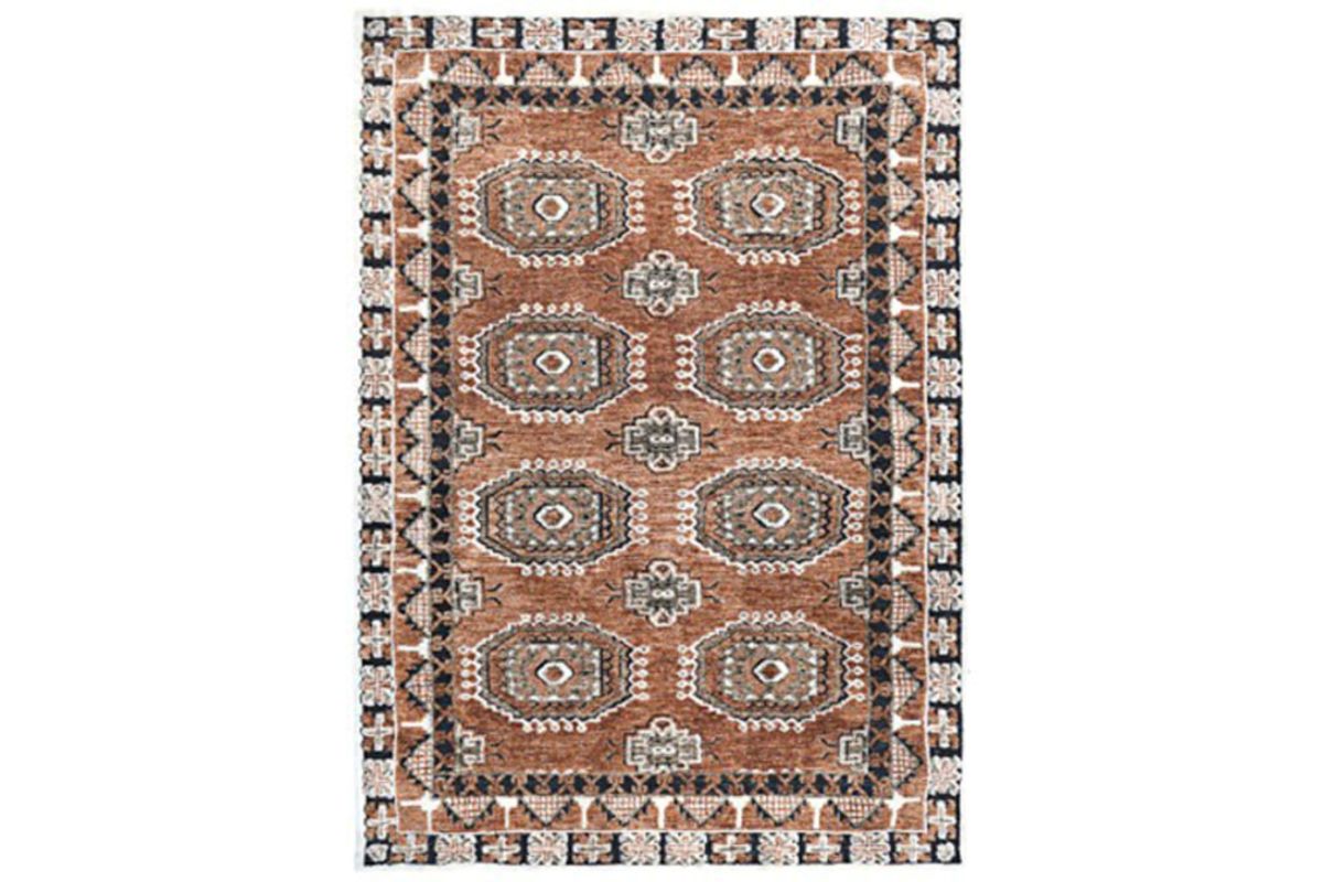 - Machine woven high-low, Aztec style design in sienna, ivory, black and brown