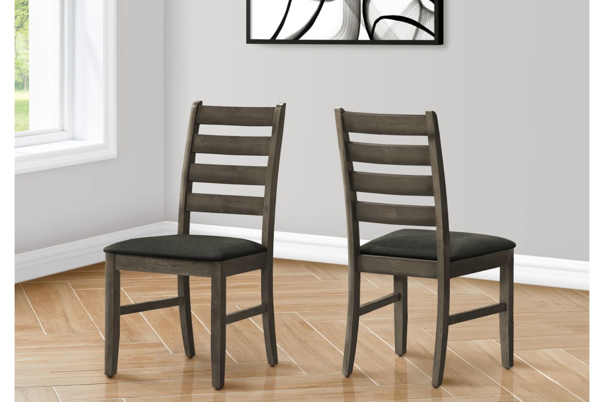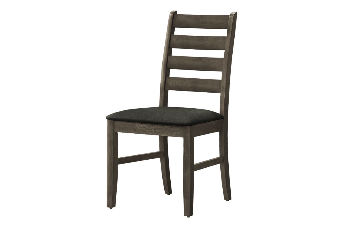 Introducing the ultimate dining chair set for your casual family dining experience. This set of 2 dining chairs with a warm antique grey finish and upholstered in grey fabric, is not only comfortable with foam cushioning, but the solid wood legs are durable with sturdy construction for long, lingering conversations at the dinner table. The ladder back design brings solid back support while adding a touch of fashionable style to your dining room or kitchen. With a 38" height, these transitional style side chairs are the perfect addition for a chic dining table (sold separately). Easy to assemble with illustrated instructions included, these chairs are backed by a 2 year limited warranty against manufacturer defects, so you can rest assured these chairs are built to last.