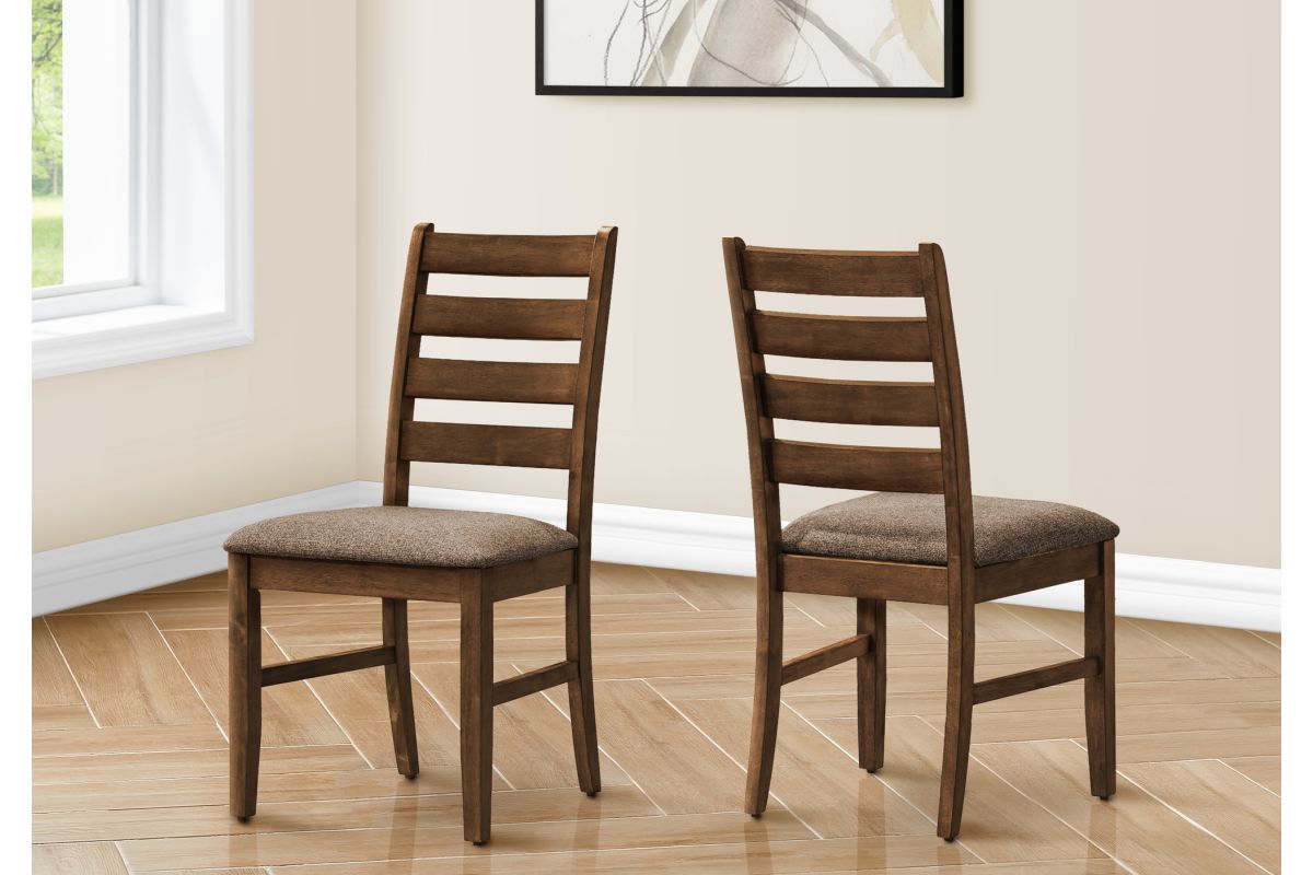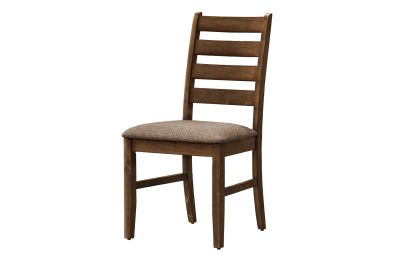 - These durable side chairs are elegantly upholstered in a brown fabric with solid wood legs and a ladder back design for support with fashionable style.