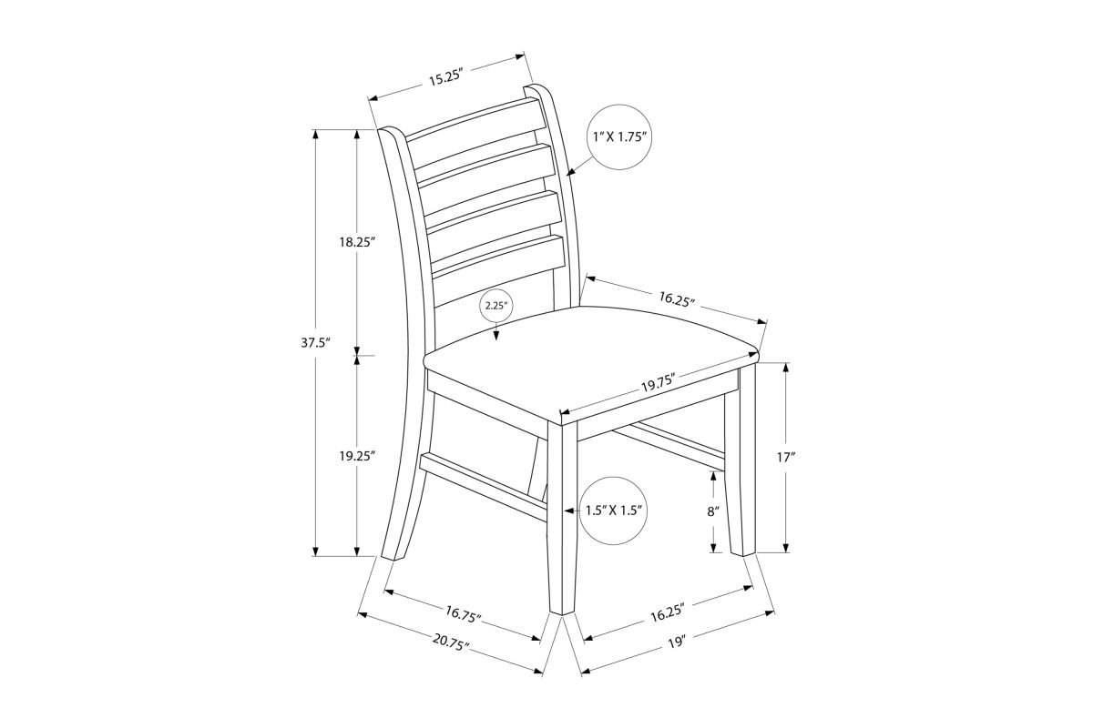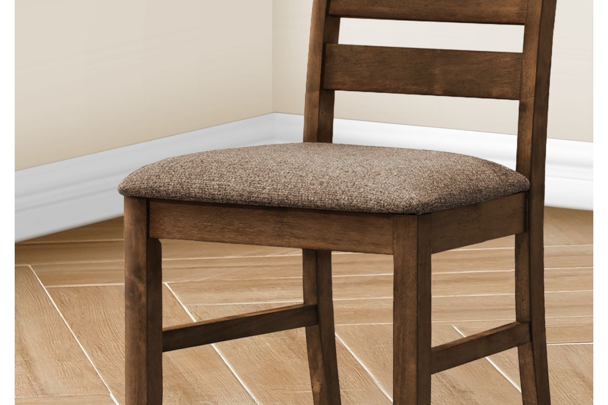 Introducing the ultimate dining chair set for your casual family dining experience. This set of 2 dining chairs with a warm antique cherry finish and upholstered in brown fabric, is not only comfortable with foam cushioning, but the solid wood legs are durable with sturdy construction for long, lingering conversations at the dinner table. The ladder back design brings solid back support while adding a touch of fashionable style to your dining room or kitchen. With a 38" height, these transitional style side chairs are the perfect addition for a chic dining table (sold separately). Easy to assemble with illustrated instructions included, these chairs are backed by a 2 year limited warranty against manufacturer defects, so you can rest assured that these chairs are built to last.