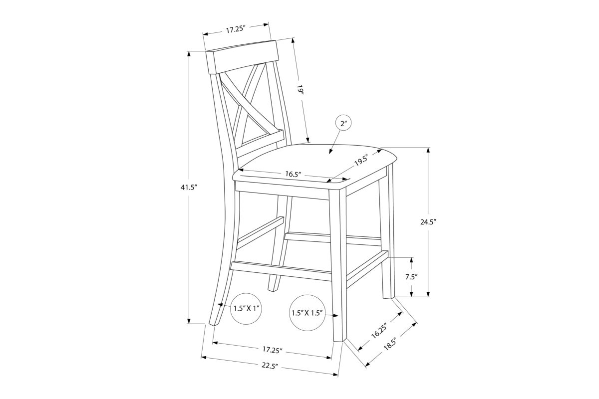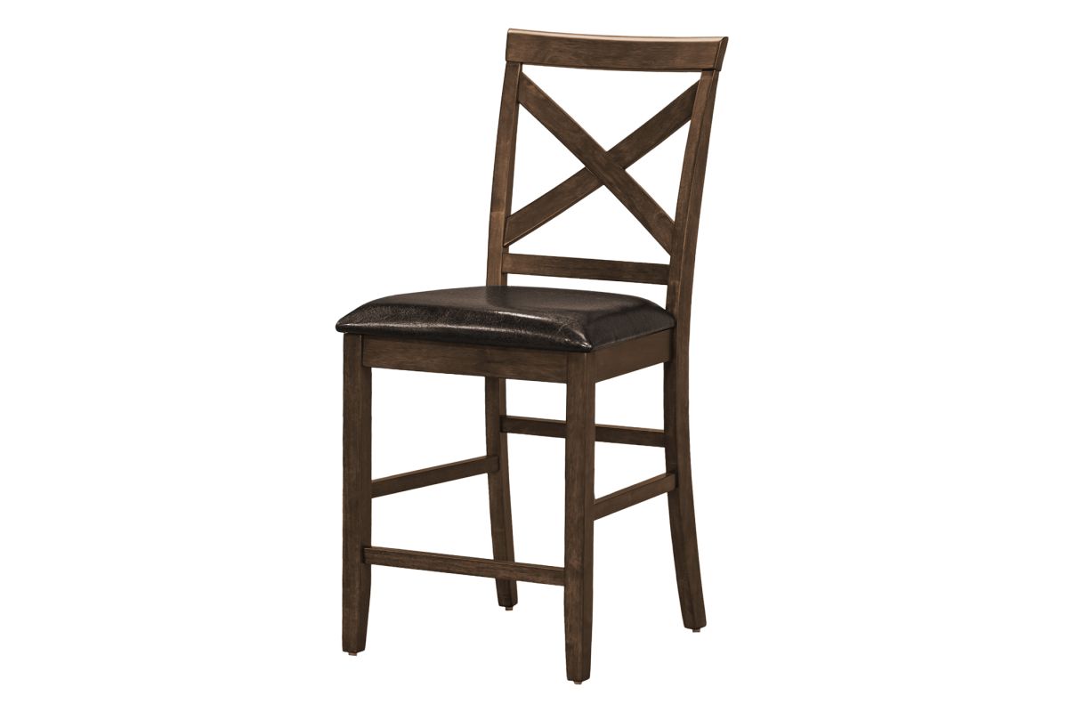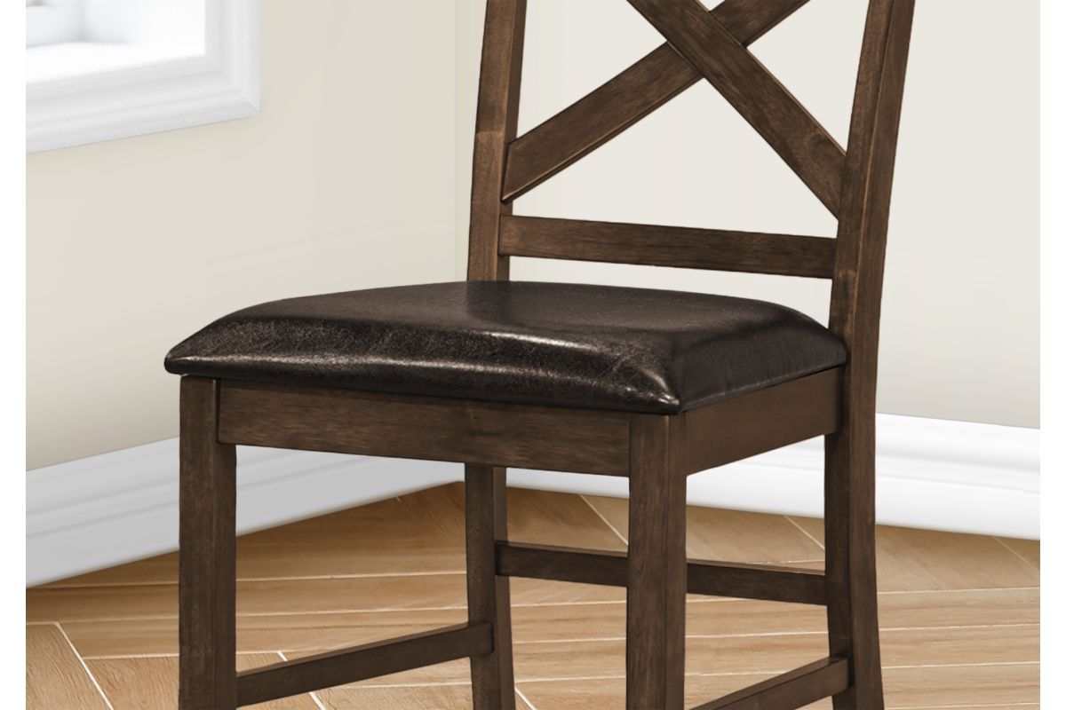 Transform your dining room or kitchen with these trendy 42"h dark walnut counter height dining chairs. This comfortable set of 2 fashionable style chairs features solid wood legs and a sturdy construction that is designed to last. The foam cushioning and padded, brown leather look upholstered seat provides both durability and comfort. The cross back design and footrest add to the firm support of these durable side chairs, great for casual family dining. Quick and easy to assemble with illustrated instructions included, these solid back chairs come with a 2 year limited warranty against manufacturer defects, ensuring your satisfaction. Pair these transitional style chairs with a matching counter height dining table (sold separately) to elevate your dining space.