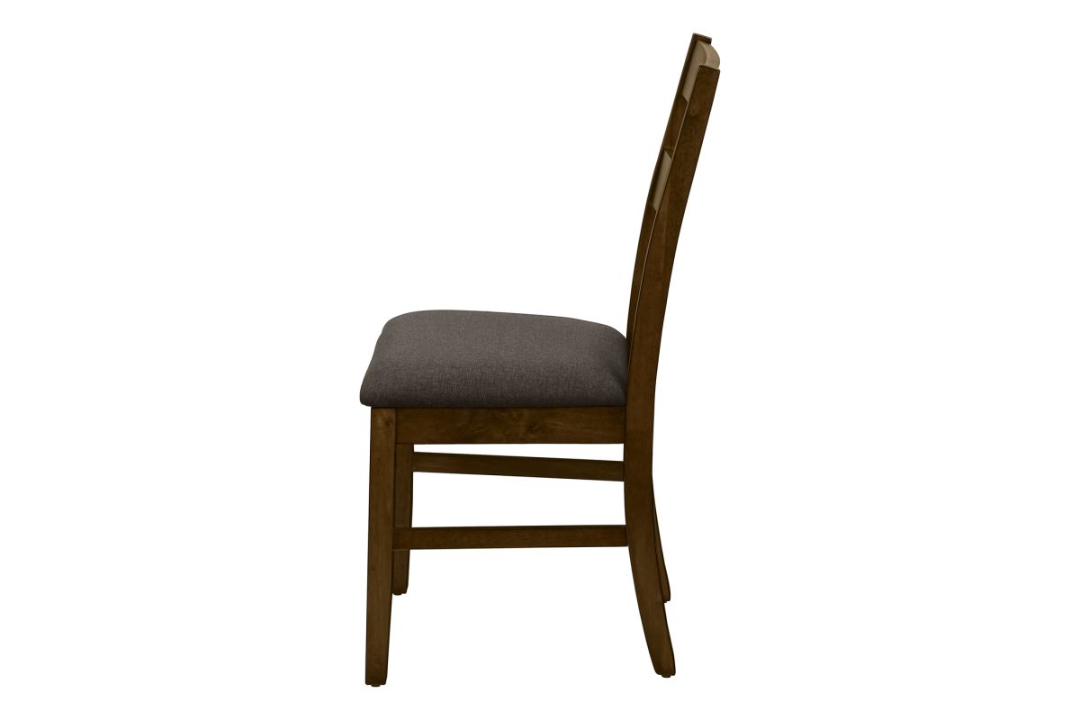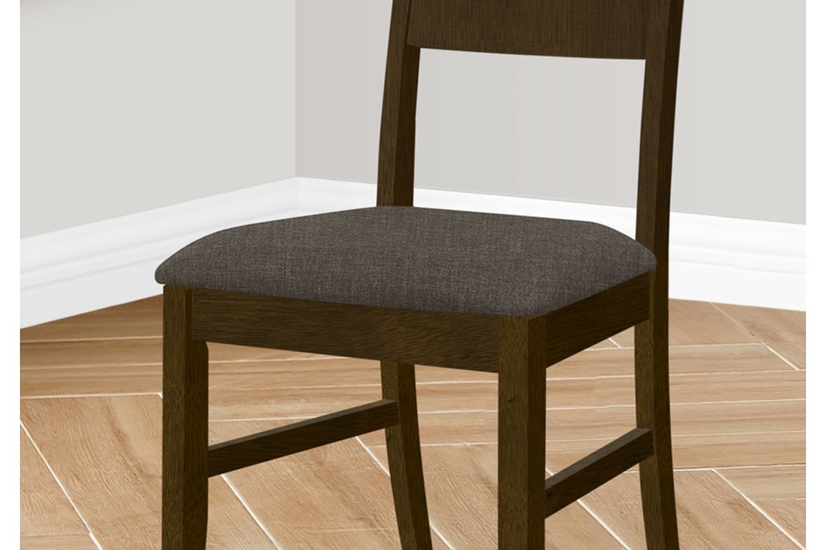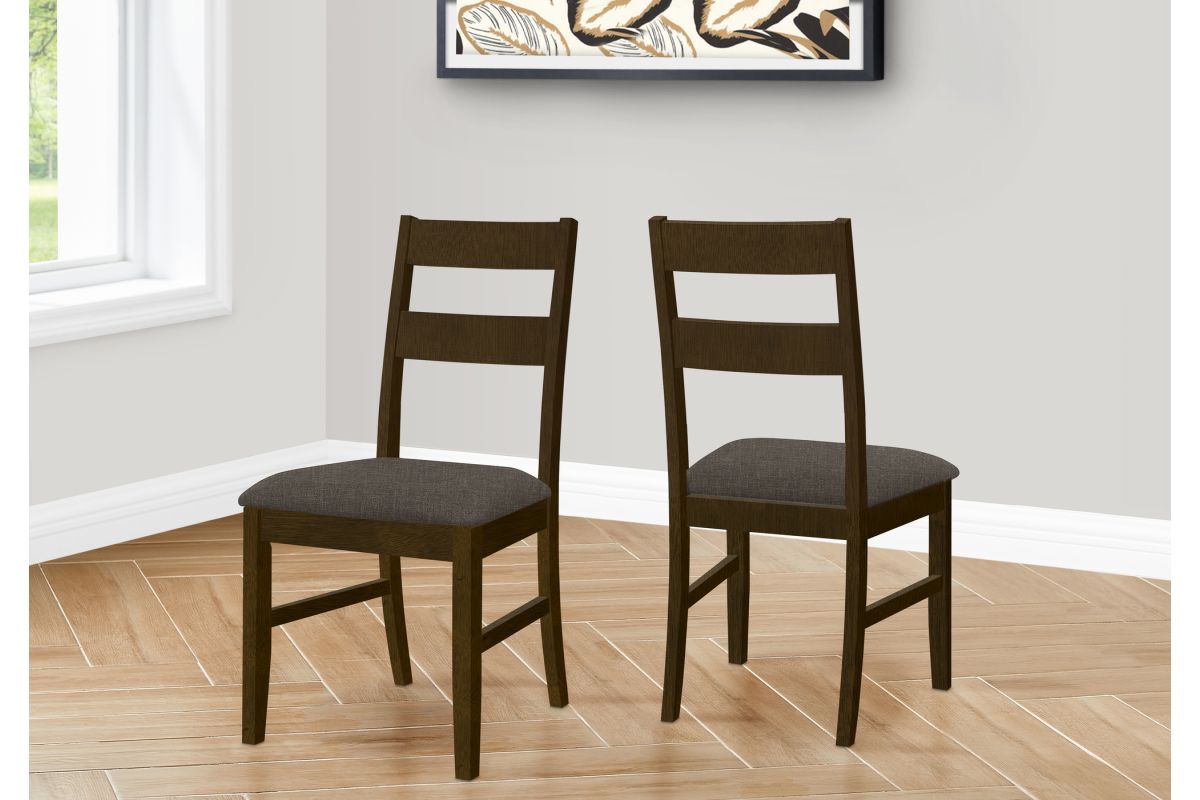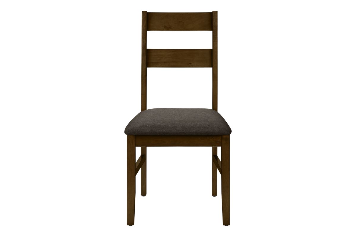 Take your dining space to the next level with this fashionable and comfortable set of 2 dining chairs in a warm brown walnut finish. Featuring a transitional design, these 37" high ladder-back side chairs combine a classic look with contemporary elements to create a stylish addition to your kitchen or dining room. These chairs are constructed with a solid wood frame to be sturdy and reliable, and the upholstered brown fabric seat with foam cushioning adds a soft touch of comfort. Quick and easy to assemble, these chairs include full illustrated instructions so you can have these setup and ready to use in time for your next meal. Each chair comes with a 2 year limited warranty against manufacturer's defects for your peace of mind. Pair these chairs with a matching dining table (sold separately) for timeless style and comfort in your formal or casual dining room.