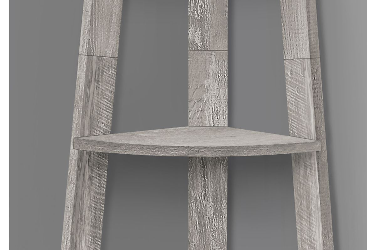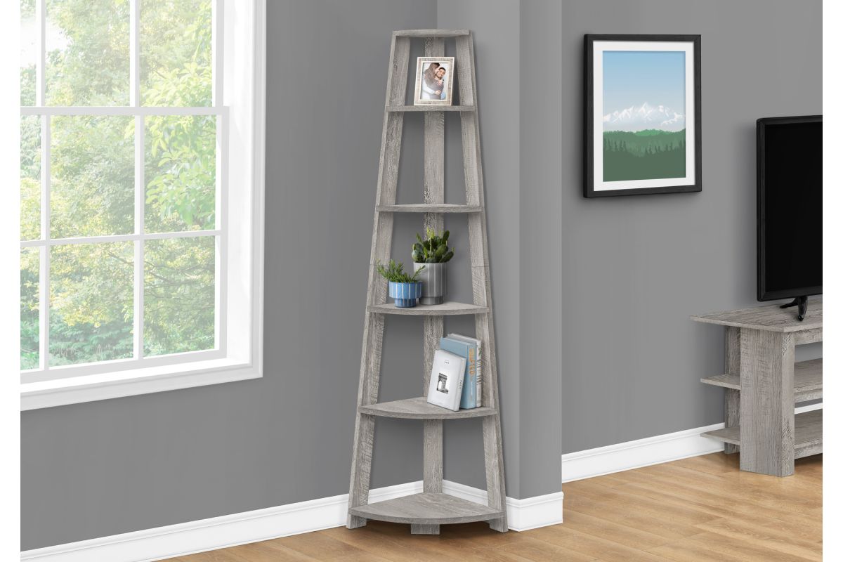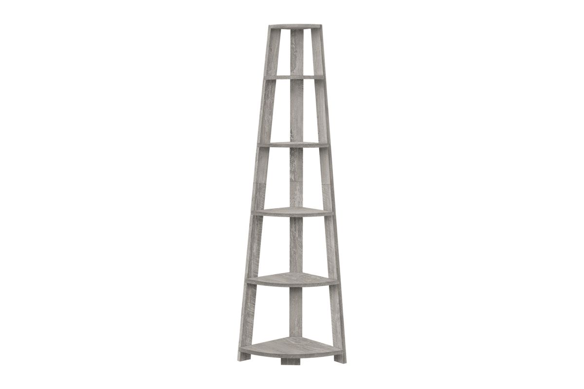 Set up this etagere bookcase easily and let it do its thing! Look how nice the bookcase fits in a corner of your living room, office or bedroom, allowing you to showcase books and all types of decor easily. Make use of a spot that is often tough to work with: the corner. Maximize storage and display with a modern piece that will be sure to help you utilize all the space available to you thanks to 5 fixed tray style shelves. Three sturdy beam legs ensure structural integrity to this corner ladder shelf in industrial grey finished wood look texture. Anti-tipping hardware is included for further stability.