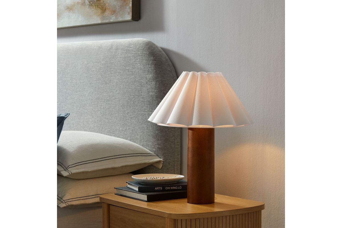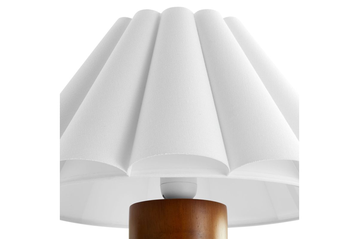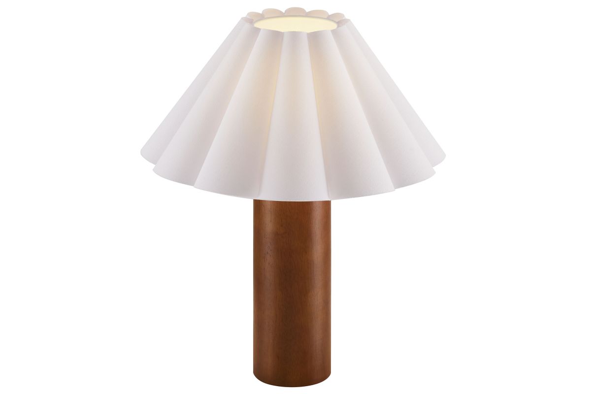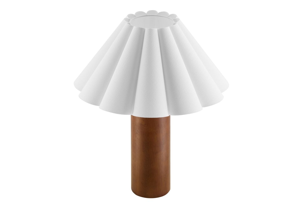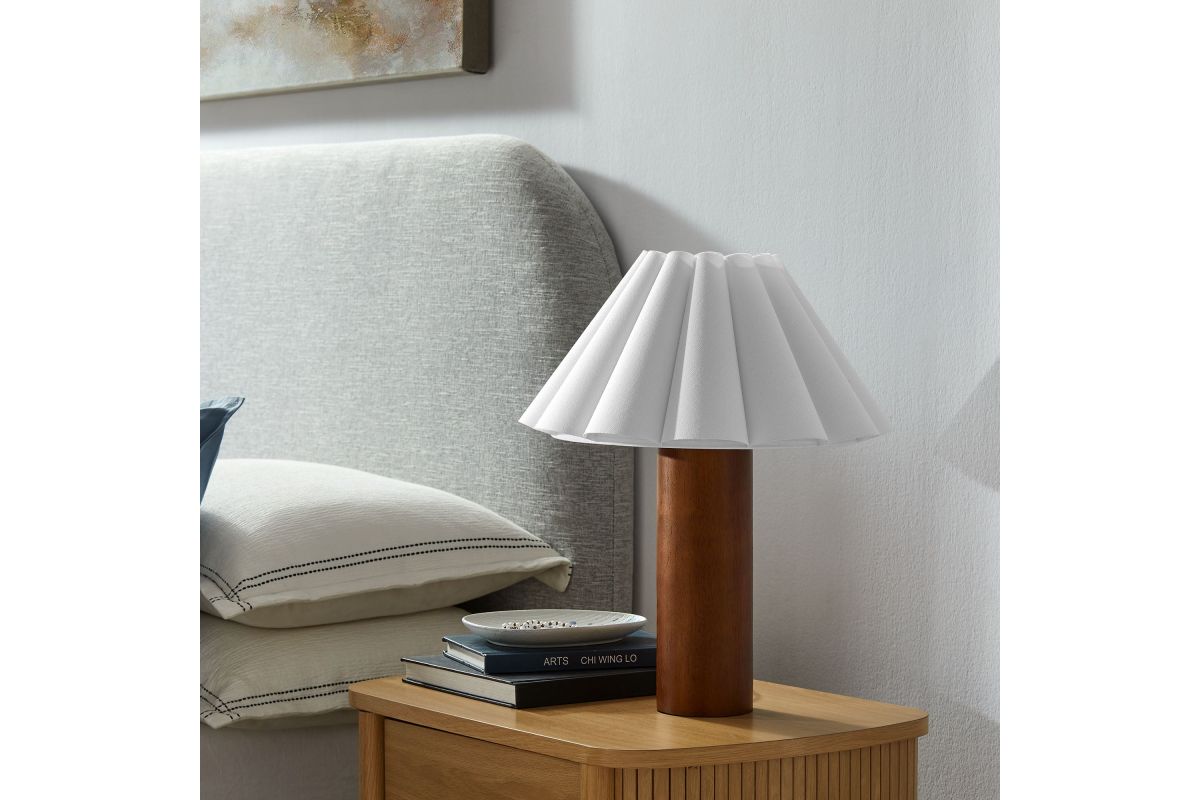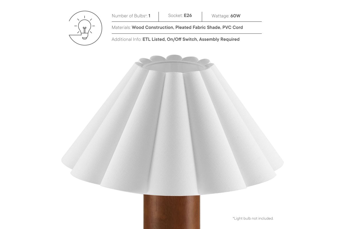 Bringing soft elegance and modern charm to your space, the Flora Petal Table Lamp features a beautifully pleated fabric lampshade shaped like delicate petals or fluted waves. This sculptural shade diffuses light for a warm, ambient glow, making it an inviting accent lamp in bedrooms, living rooms, or entryways. The solid wood pillar base lends a natural warmth and subtle Scandinavian appeal, while the compact design ensures it fits seamlessly on nightstands, side tables, or console tables. A convenient inline on/off switch makes this table lamp with pleated shade easy to use. Designed to complement mid-century modern, retro, and contemporary interiors, the Flora Modern Lamp adds texture and visual interest to any space. Requires one A19 E26 60W bulb (not included). Wire length: 70 inches.