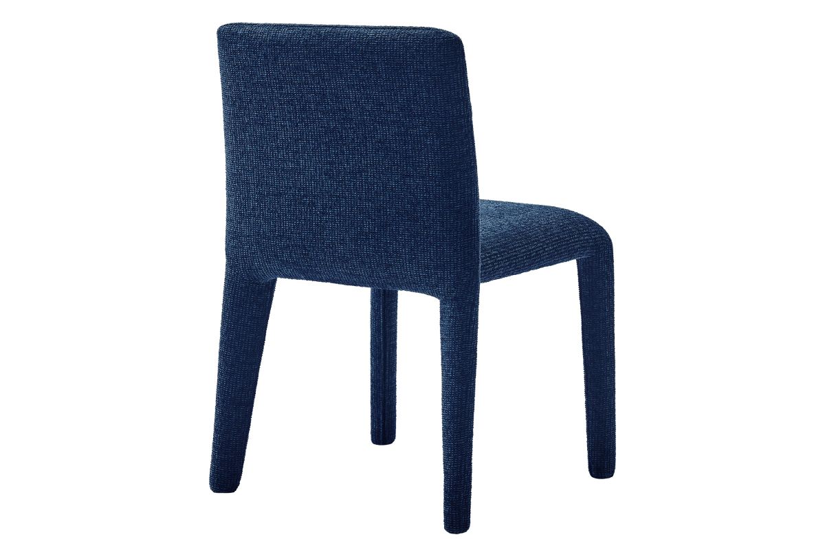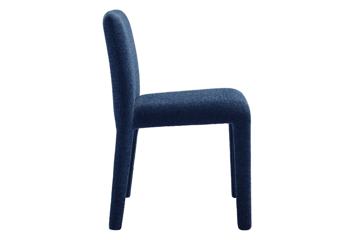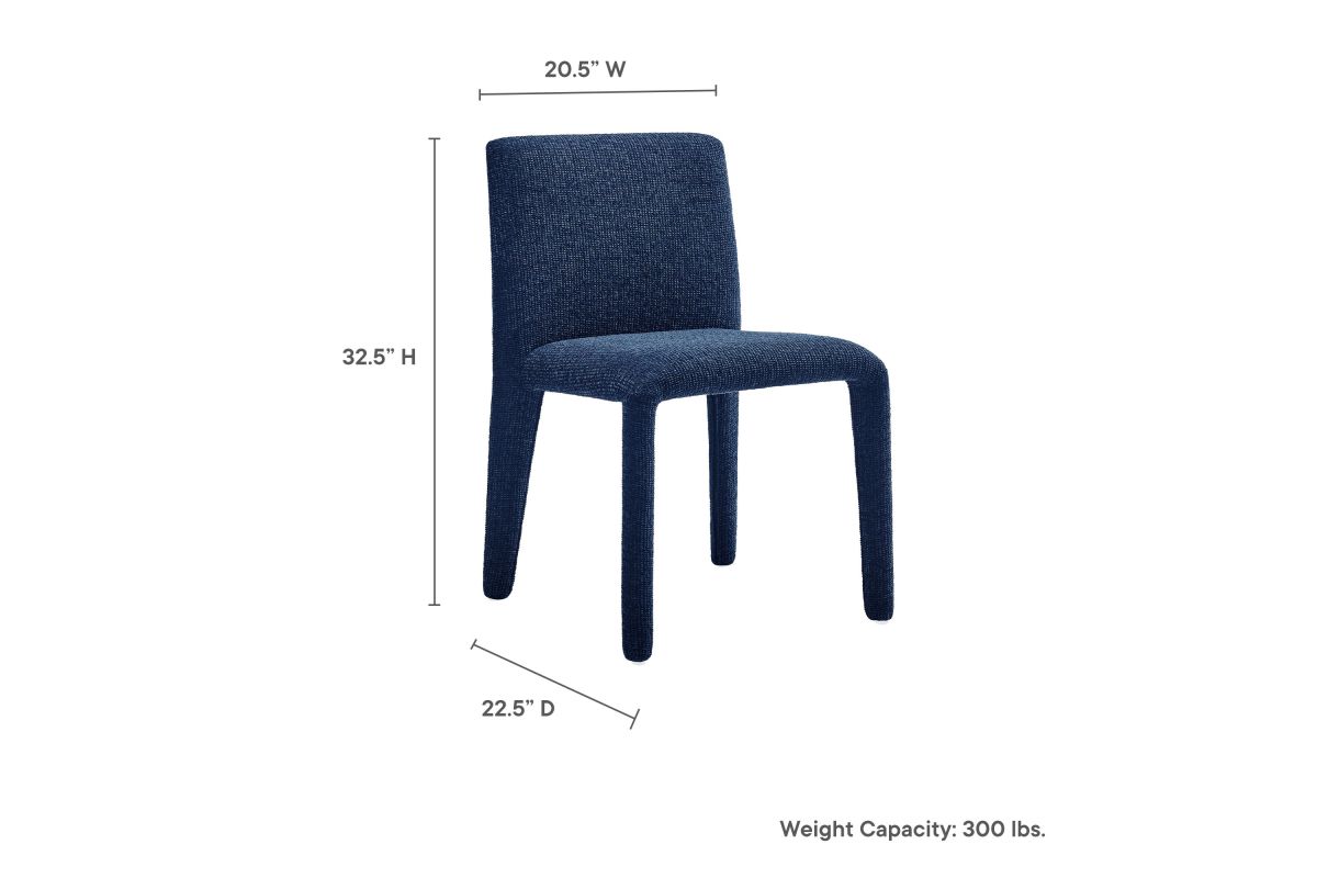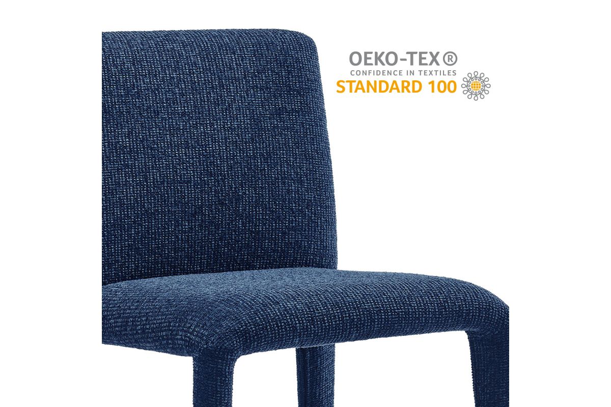 Bring an understated sophistication to your dining or living space with the Rhodes Dining Chair. Fully wrapped in soft, textured chenille fabric, including the legs, this modern accent chair exudes sleek elegance. The dining side chair's fully upholstered minimalist design features a high square backrest with subtly rounded edges and a padded seat for exceptional comfort. Made from recycled plastic bottles, the upholstery fabric is also OEKO-TEX® STANDARD 100 Certified. Perfectly suited as a side chair, desk chair, or as a living room accent chair, Rhodes complements a variety of interiors, from contemporary to mid-century modern. Non-marking floor glides protect your floors, and this upholstered dining chair arrives fully assembled for effortless setup. Weight Capacity: 300 lbs.