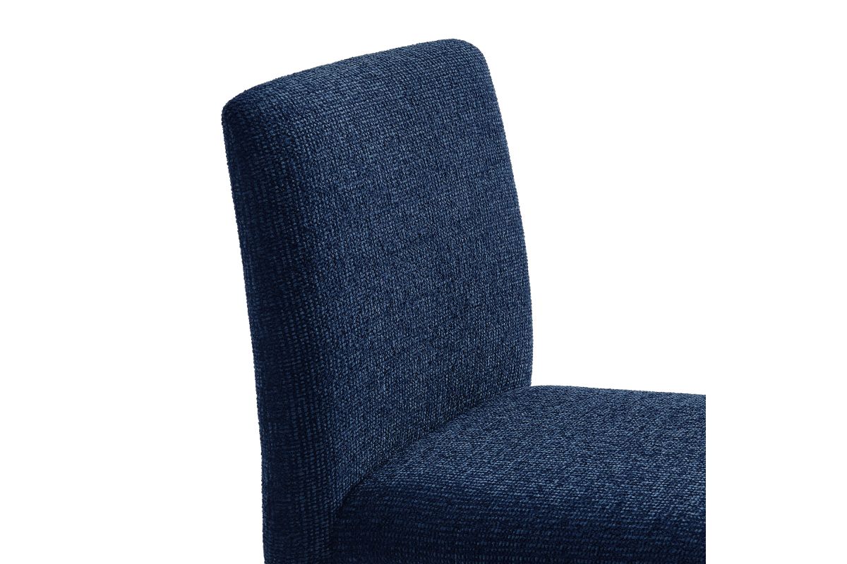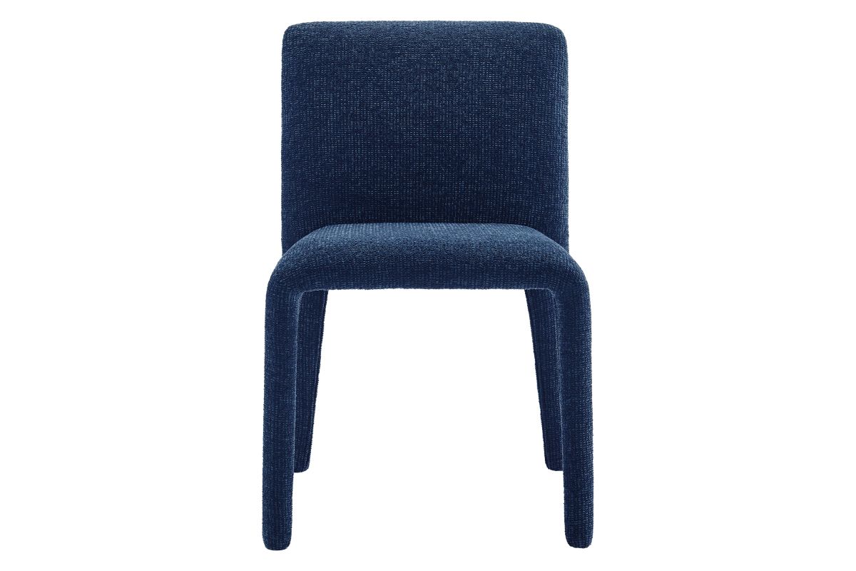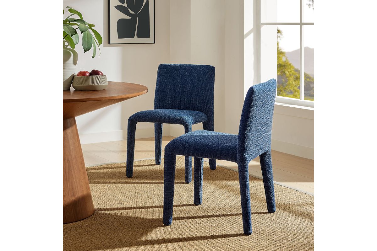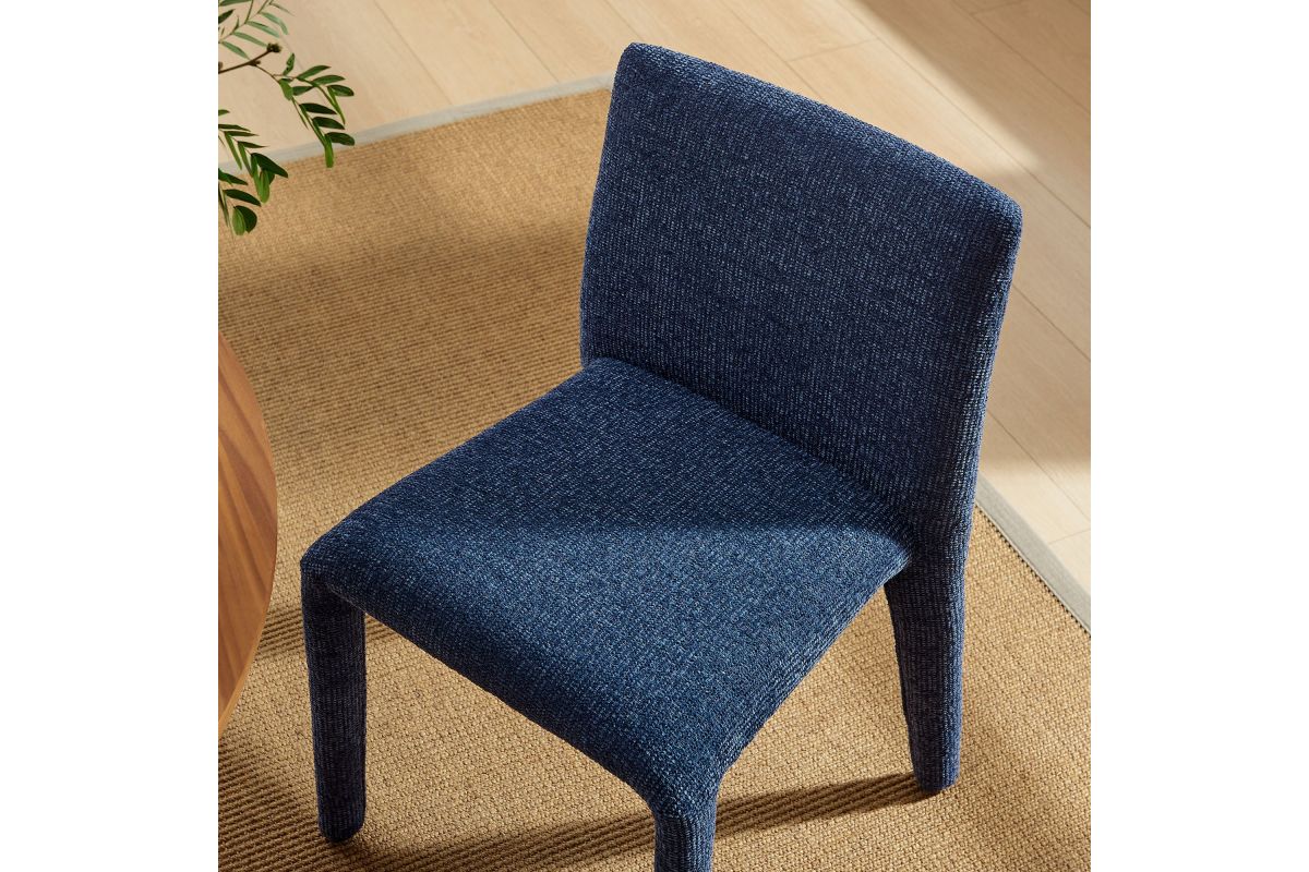 Bring an understated sophistication to your dining or living space with the Rhodes Dining Chair. Fully wrapped in soft, textured chenille fabric, including the legs, this modern accent chair exudes sleek elegance. The dining side chair's fully upholstered minimalist design features a high square backrest with subtly rounded edges and a padded seat for exceptional comfort. Made from recycled plastic bottles, the upholstery fabric is also OEKO-TEX® STANDARD 100 Certified. Perfectly suited as a side chair, desk chair, or as a living room accent chair, Rhodes complements a variety of interiors, from contemporary to mid-century modern. Non-marking floor glides protect your floors, and this upholstered dining chair arrives fully assembled for effortless setup. Weight Capacity: 300 lbs.