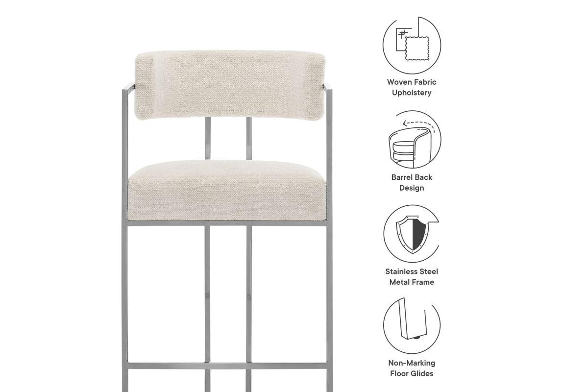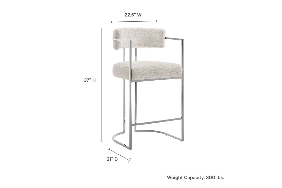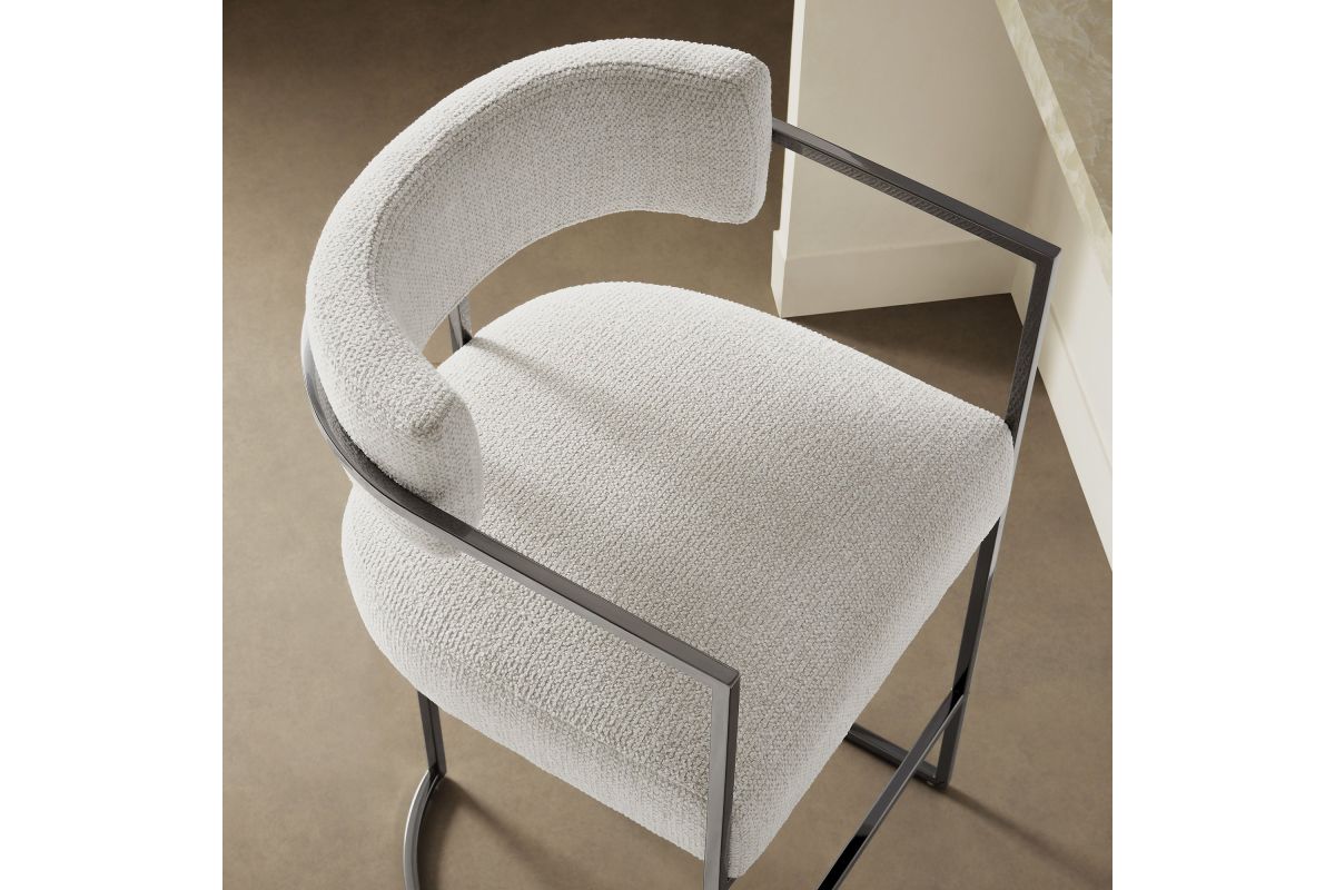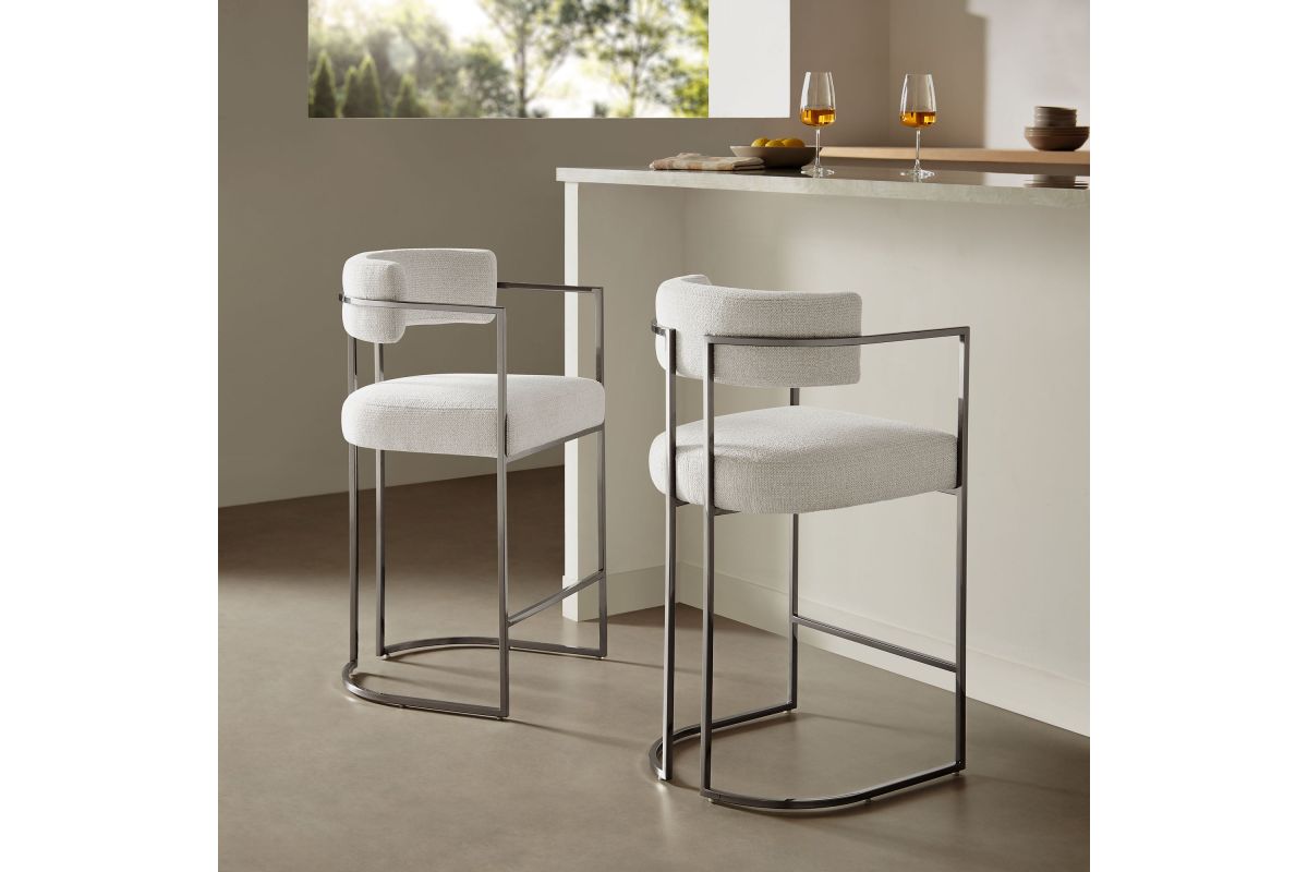 Elevate your kitchen or dining area with the Huron Counter-Height Stool, a masterpiece of modern design. The inspired barrel stool features a graceful metal frame with integrated arms and a unique sled base that creates a bold, architectural silhouette, blending retro style and stability. Upholstered in a luxe woven fabric with textured depth, the seat and backrest on this padded counter stool offer exceptional comfort while adding a tactile sophistication to your space. The rounded back and supportive arms provide a perfect balance of elegance and function. Better for you and the environment, the upholstery fabric is also OEKO-TEX® STANDARD 100 Certified. Designed to complement kitchen islands, counter-height tables, and contemporary interiors, the Huron Curved Back Stool is both versatile and statement-making 70's flair. Equipped with adjustable non-marking floor glides for stability and floor protection, this counter stool arrives fully assembled for immediate use. Weight Capacity: 300 lbs.