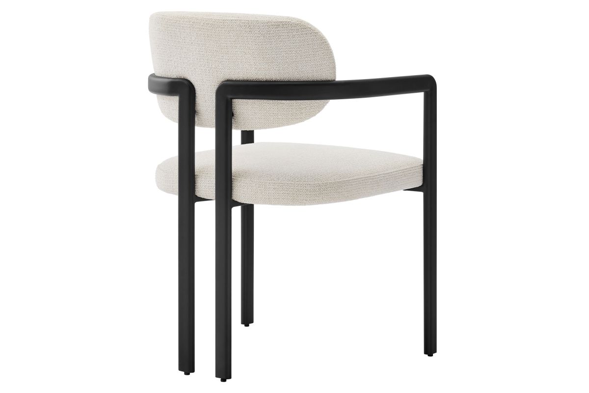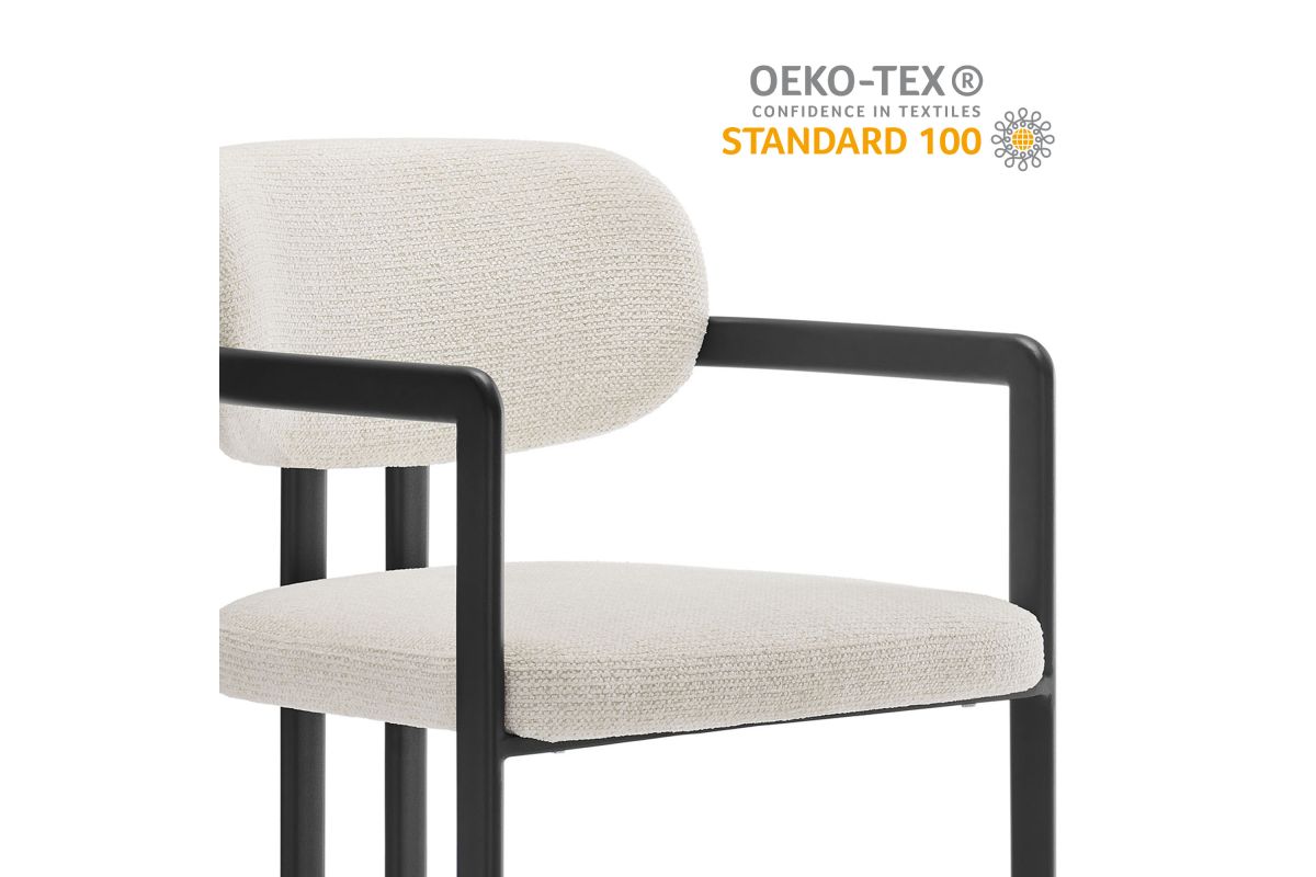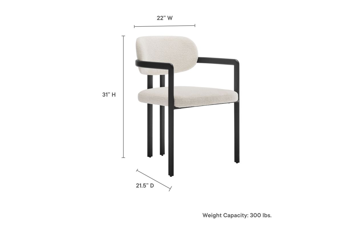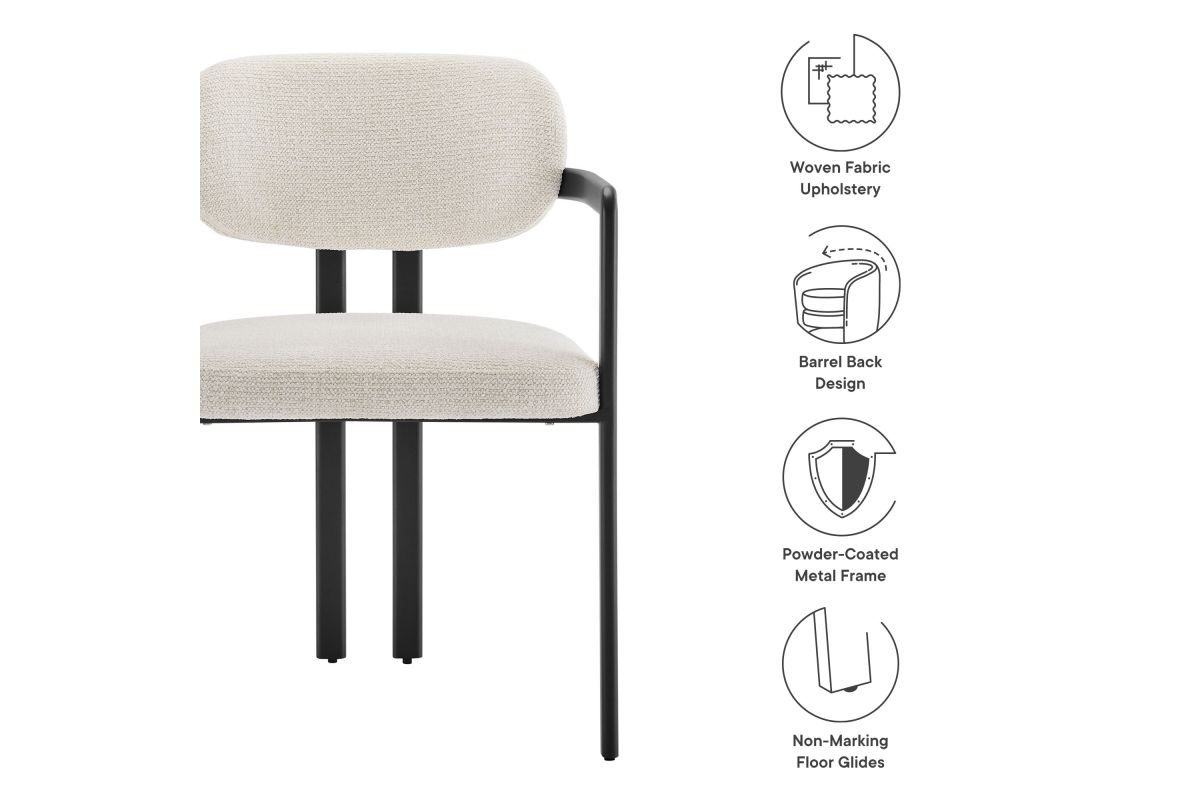 Infuse your dining or living space with the modern sophistication of the Elio Dining Chair. Combining angular metal framing with a rounded barrel chair design, this open back dining chair is a harmonious balance of geometry and softness. Its powder-coated metal frame features clean lines and a sculptural silhouette, while the padded seat and backrest of this upholstered chair are covered in a richly textured woven fabric for a tactile, cozy feel. Better for you and the environment, the upholstery fabric is also OEKO-TEX® STANDARD 100 certified. The open-back design adds an airy elegance, making Elio equally suited as a dining chair, accent chair, or office chair. Fully assembled and equipped with adjustable non-marking floor glides, this modern barrel chair ensures hassle-free setup and floor protection. Whether placed in a contemporary dining room, a cozy breakfast nook, or a stylish workspace, the Elio Dining Chair makes a statement with its modern charm and versatile design. Weight Capacity: 300 lbs.