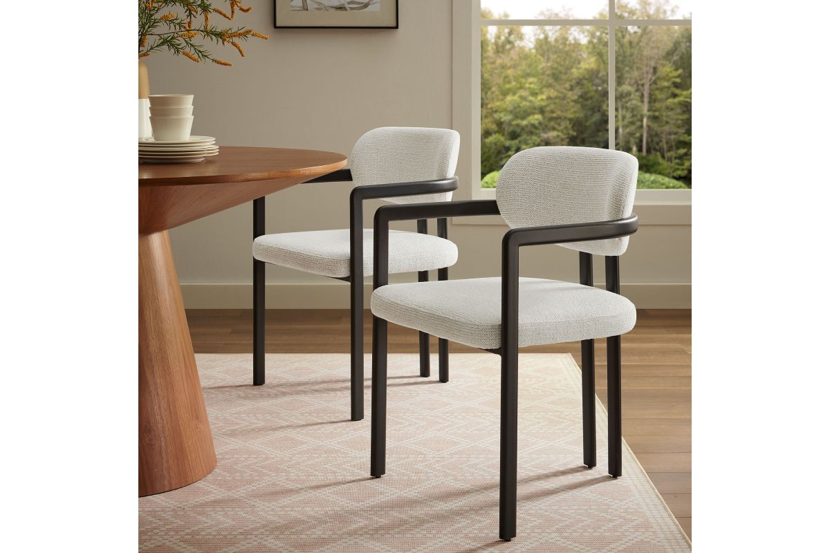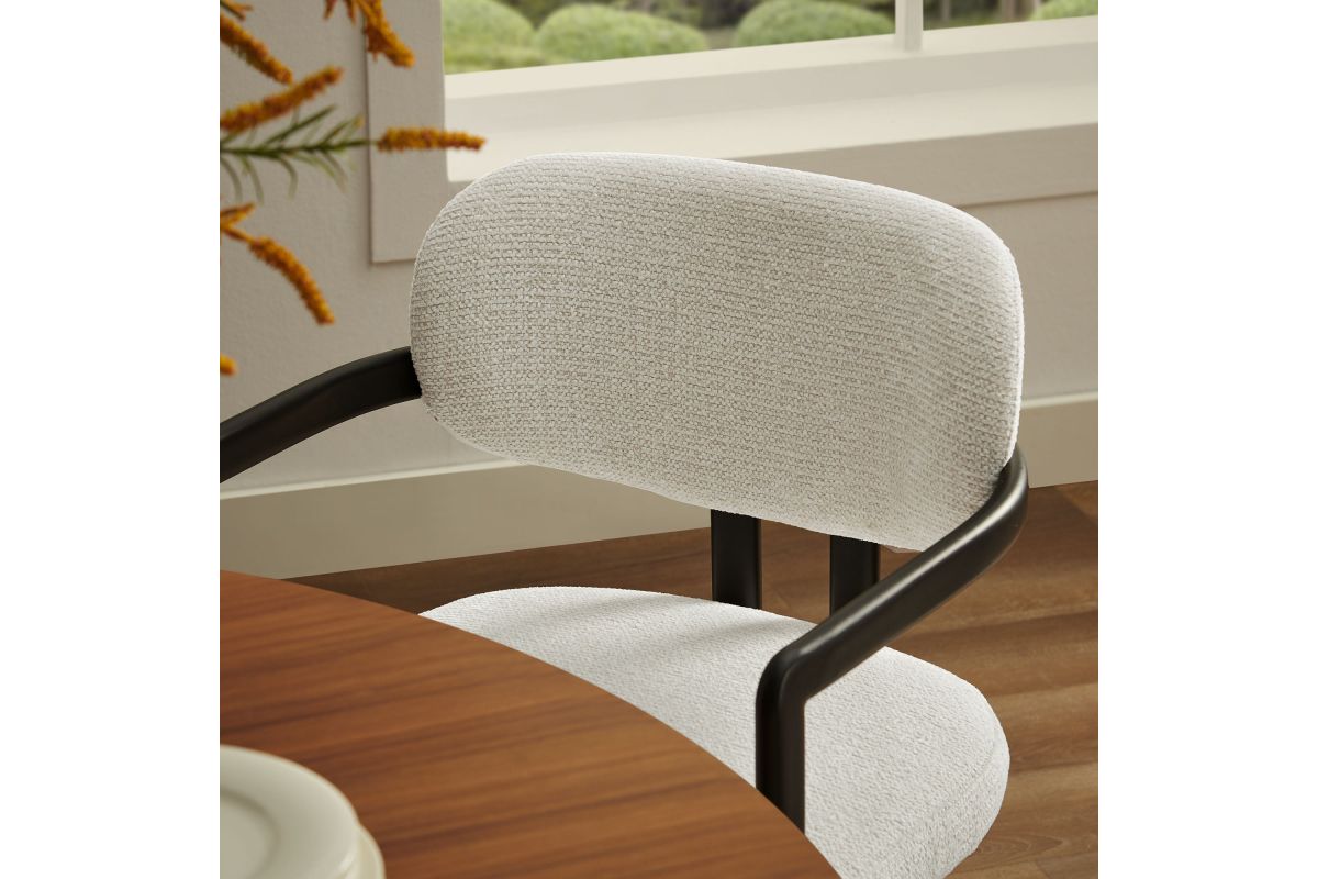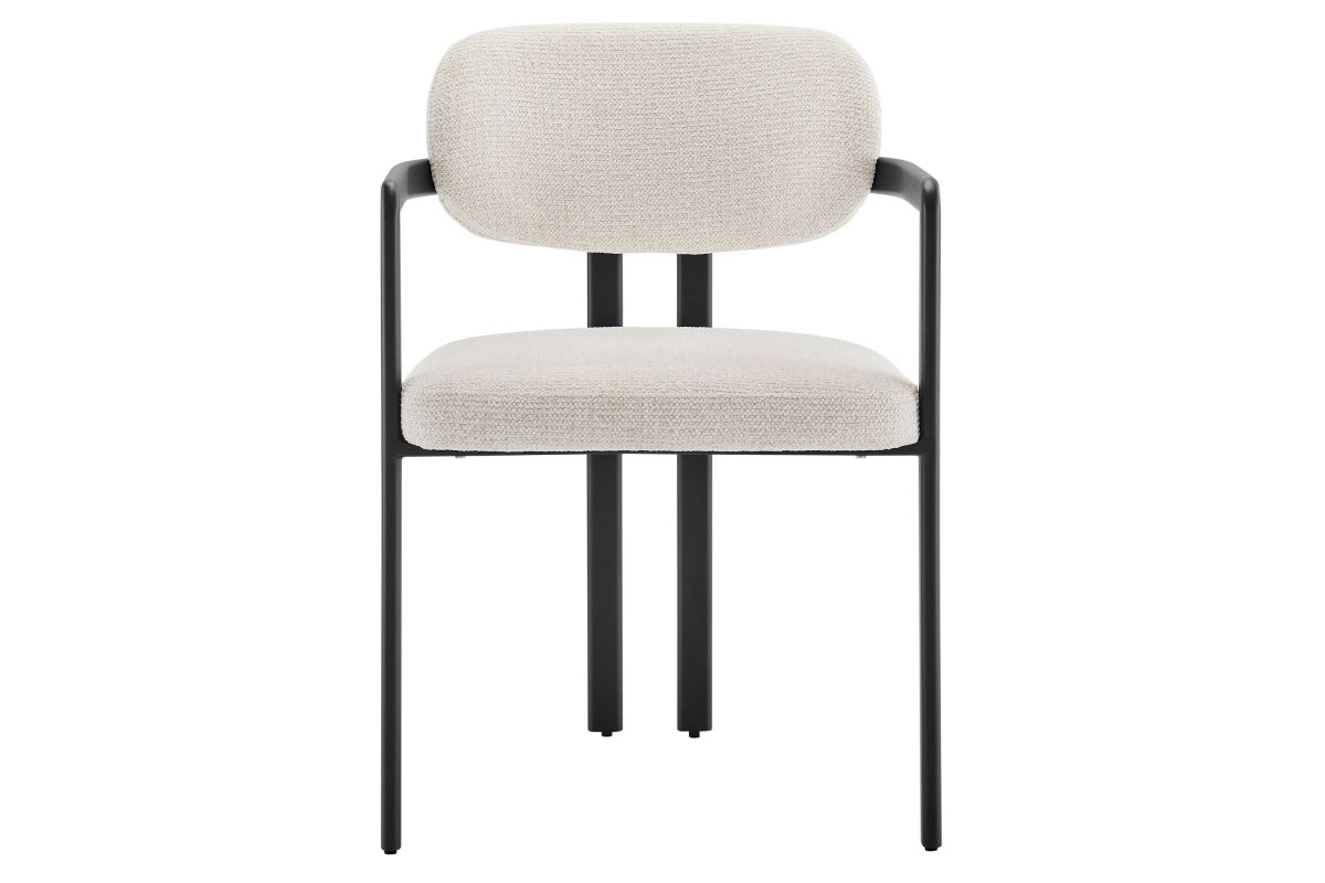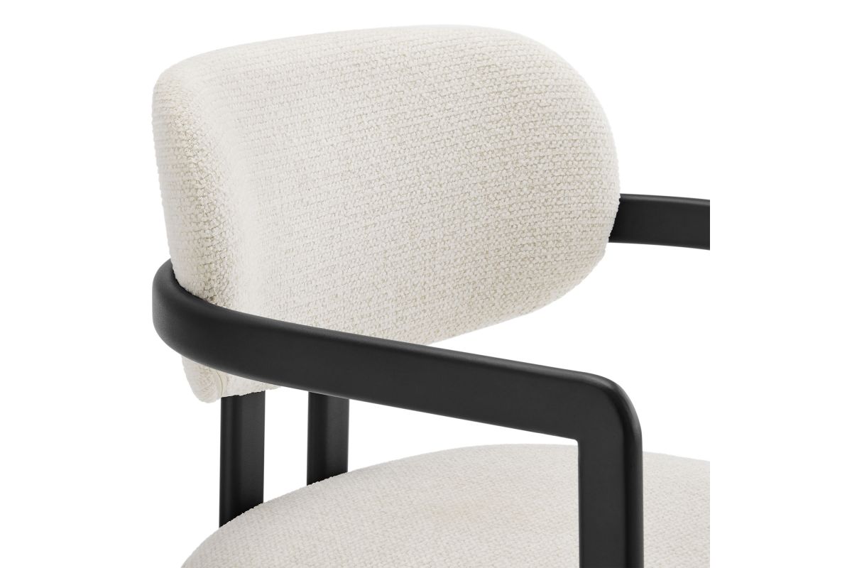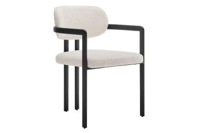 Infuse your dining or living space with the modern sophistication of the Elio Dining Chair. Combining angular metal framing with a rounded barrel chair design, this open back dining chair is a harmonious balance of geometry and softness. Its powder-coated metal frame features clean lines and a sculptural silhouette, while the padded seat and backrest of this upholstered chair are covered in a richly textured woven fabric for a tactile, cozy feel. Better for you and the environment, the upholstery fabric is also OEKO-TEX® STANDARD 100 certified. The open-back design adds an airy elegance, making Elio equally suited as a dining chair, accent chair, or office chair. Fully assembled and equipped with adjustable non-marking floor glides, this modern barrel chair ensures hassle-free setup and floor protection. Whether placed in a contemporary dining room, a cozy breakfast nook, or a stylish workspace, the Elio Dining Chair makes a statement with its modern charm and versatile design. Weight Capacity: 300 lbs.