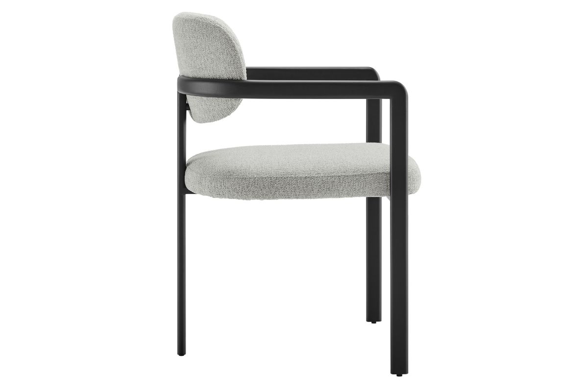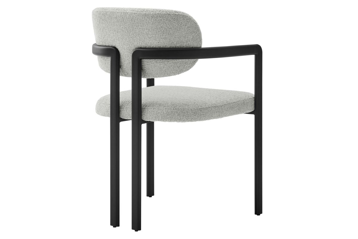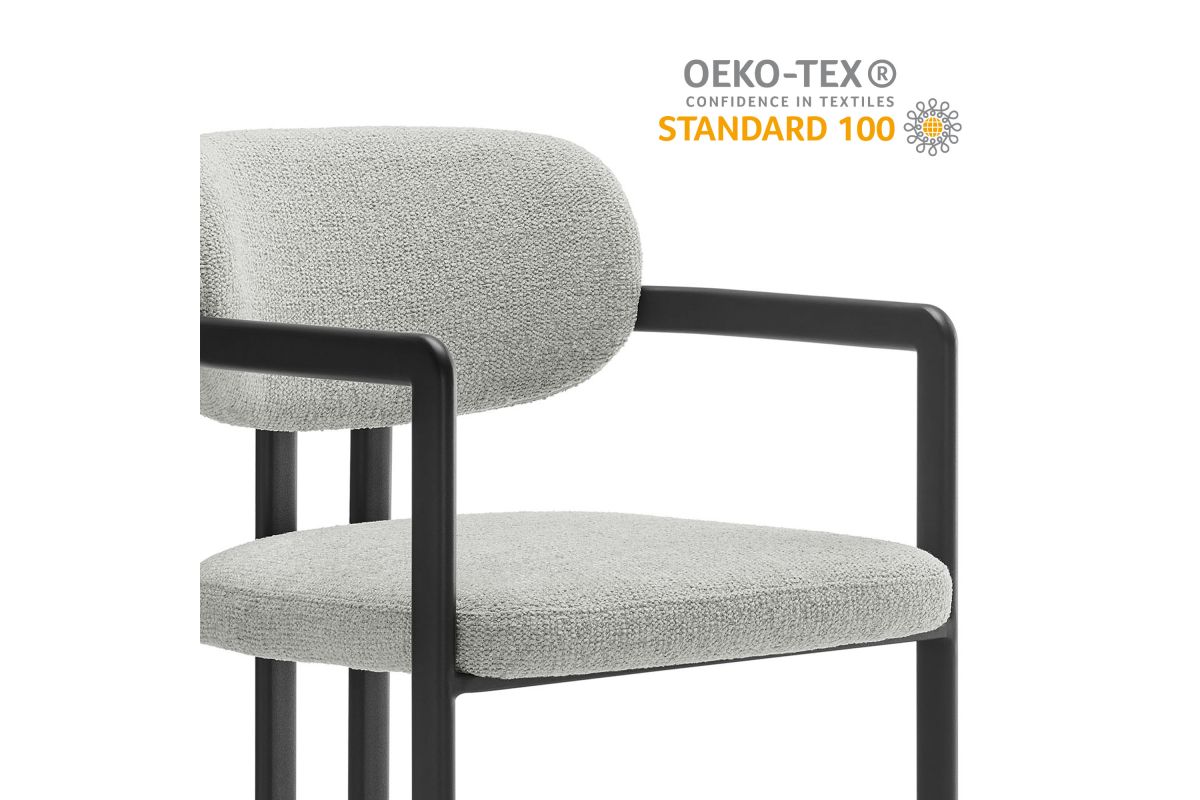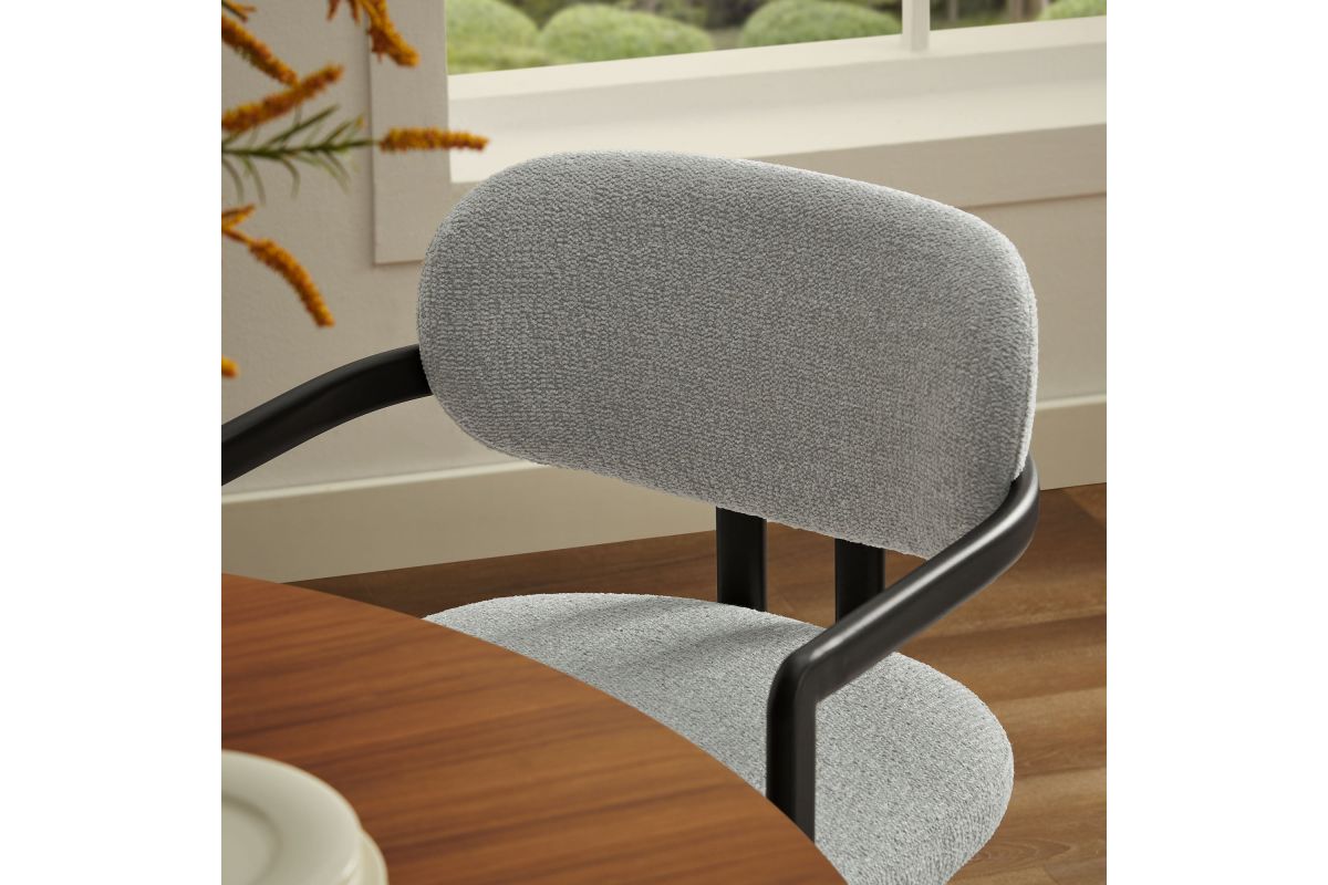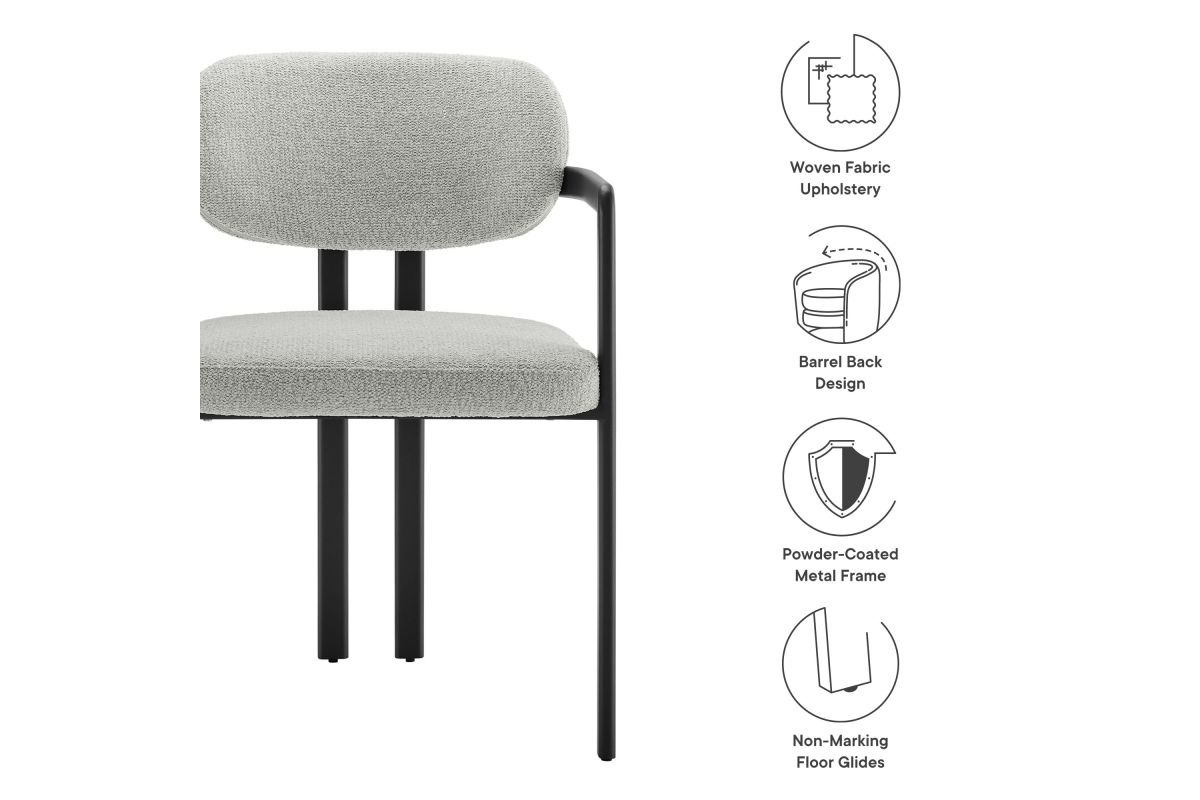 Infuse your dining or living space with the modern sophistication of the Elio Dining Chair. Combining angular metal framing with a rounded barrel chair design, this open back dining chair is a harmonious balance of geometry and softness. Its powder-coated metal frame features clean lines and a sculptural silhouette, while the padded seat and backrest of this upholstered chair are covered in a richly textured woven fabric for a tactile, cozy feel. Better for you and the environment, the upholstery fabric is also OEKO-TEX® STANDARD 100 certified. The open-back design adds an airy elegance, making Elio equally suited as a dining chair, accent chair, or office chair. Fully assembled and equipped with adjustable non-marking floor glides, this modern barrel chair ensures hassle-free setup and floor protection. Whether placed in a contemporary dining room, a cozy breakfast nook, or a stylish workspace, the Elio Dining Chair makes a statement with its modern charm and versatile design. Weight Capacity: 300 lbs.