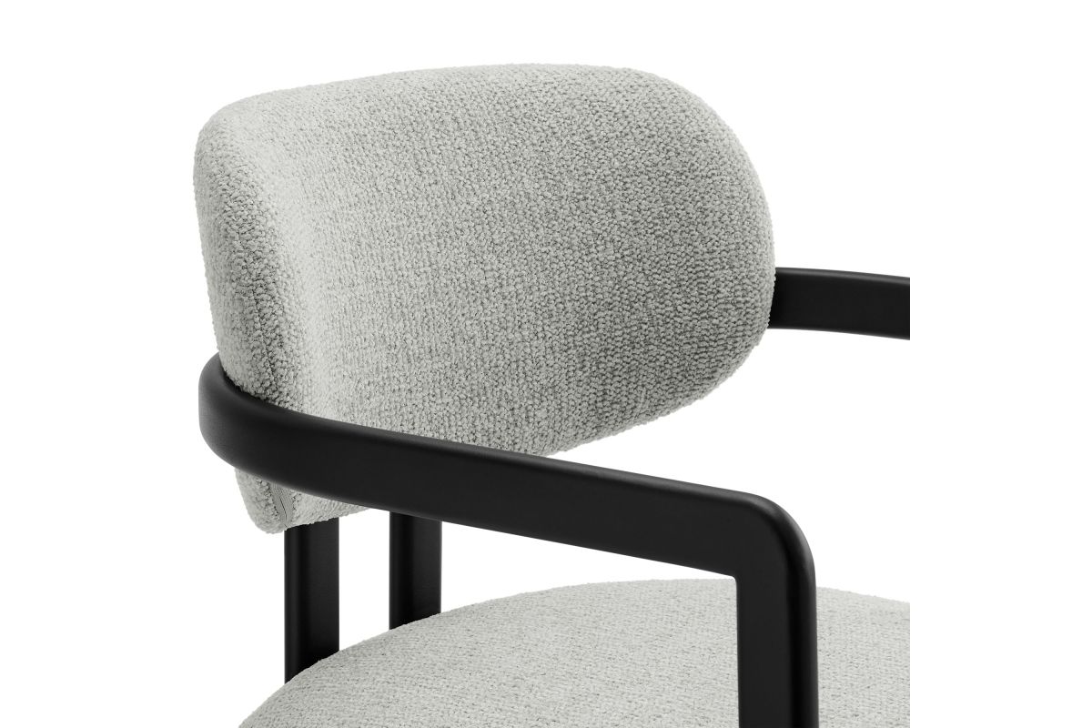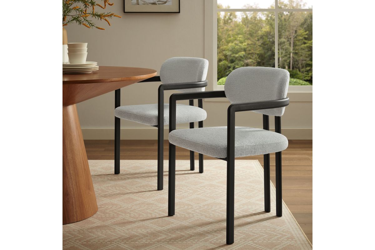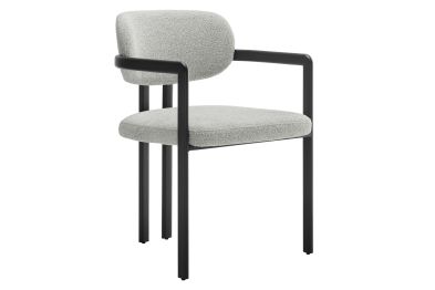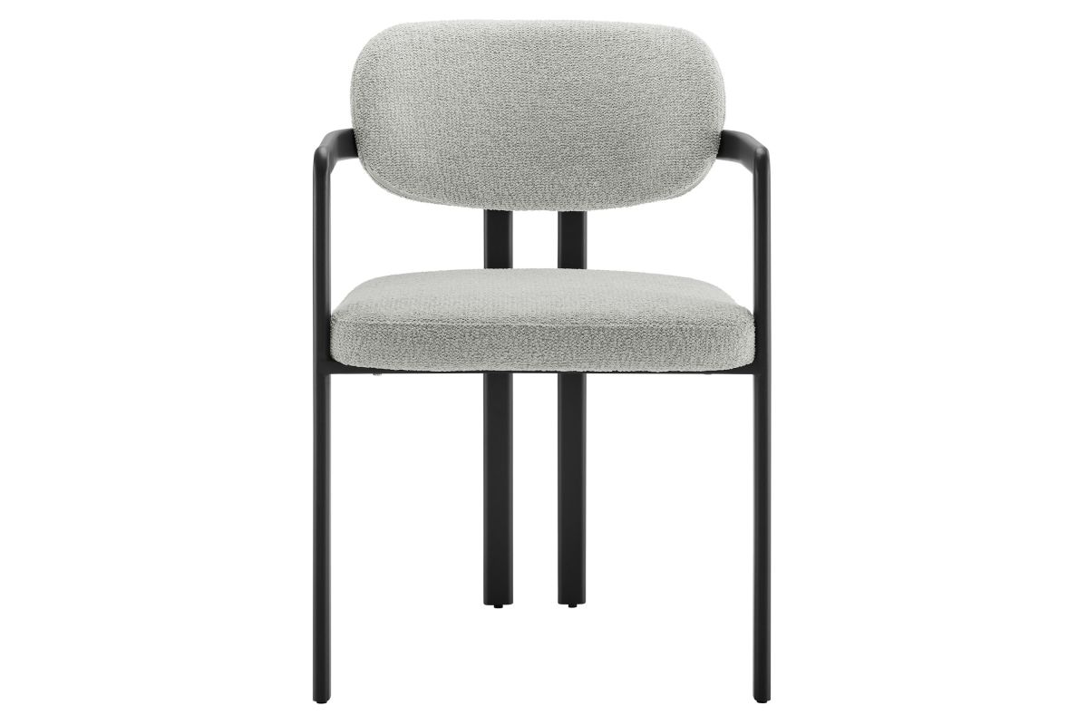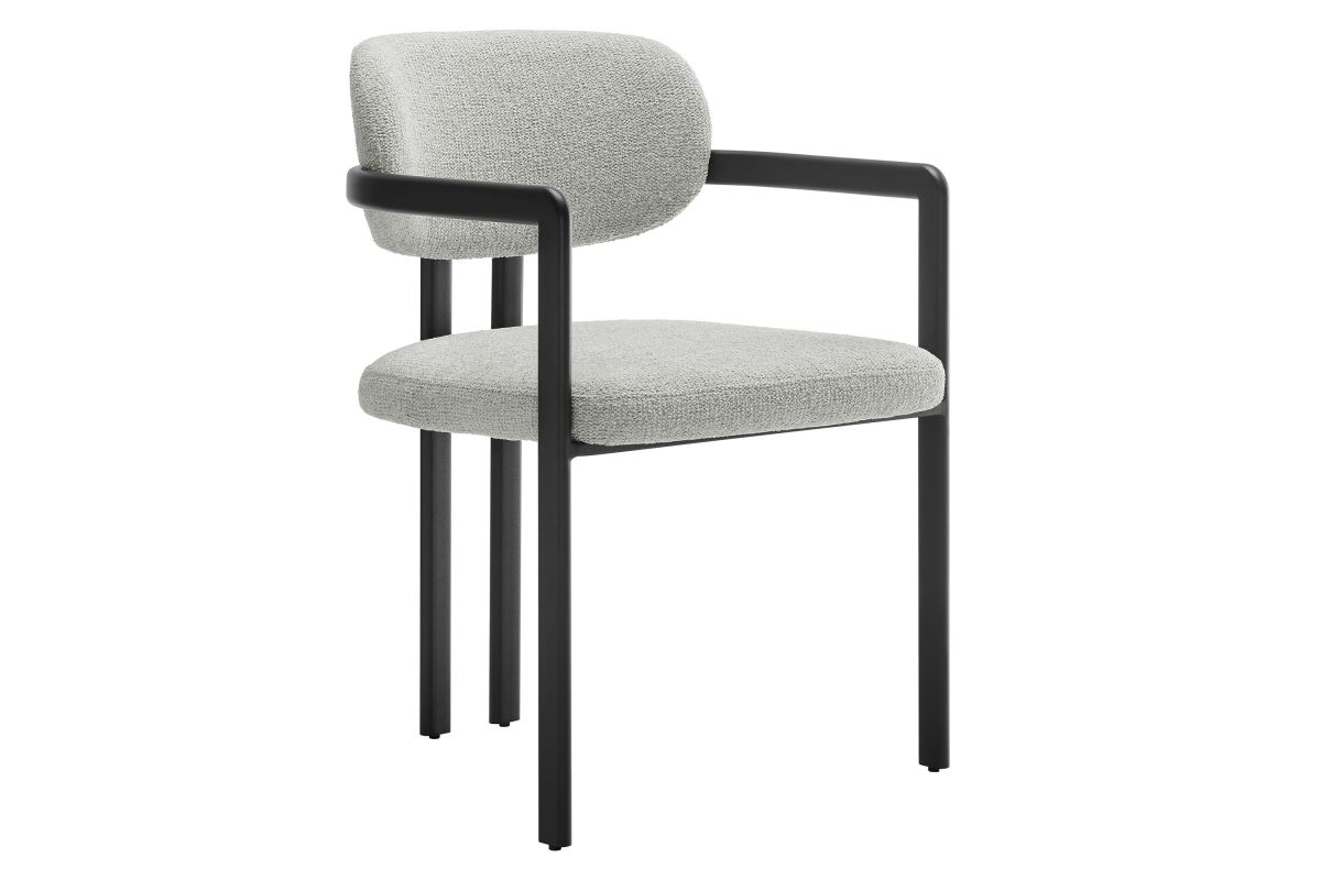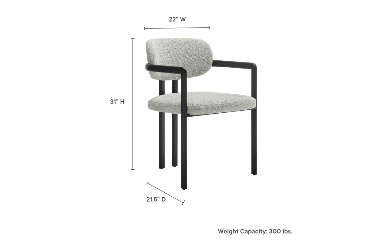 Infuse your dining or living space with the modern sophistication of the Elio Dining Chair. Combining angular metal framing with a rounded barrel chair design, this open back dining chair is a harmonious balance of geometry and softness. Its powder-coated metal frame features clean lines and a sculptural silhouette, while the padded seat and backrest of this upholstered chair are covered in a richly textured woven fabric for a tactile, cozy feel. Better for you and the environment, the upholstery fabric is also OEKO-TEX® STANDARD 100 certified. The open-back design adds an airy elegance, making Elio equally suited as a dining chair, accent chair, or office chair. Fully assembled and equipped with adjustable non-marking floor glides, this modern barrel chair ensures hassle-free setup and floor protection. Whether placed in a contemporary dining room, a cozy breakfast nook, or a stylish workspace, the Elio Dining Chair makes a statement with its modern charm and versatile design. Weight Capacity: 300 lbs.