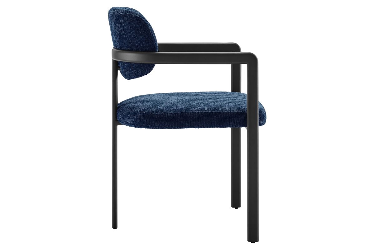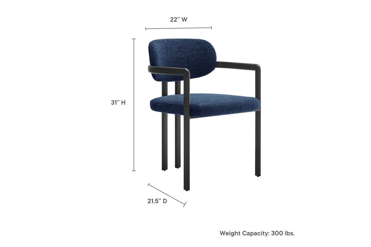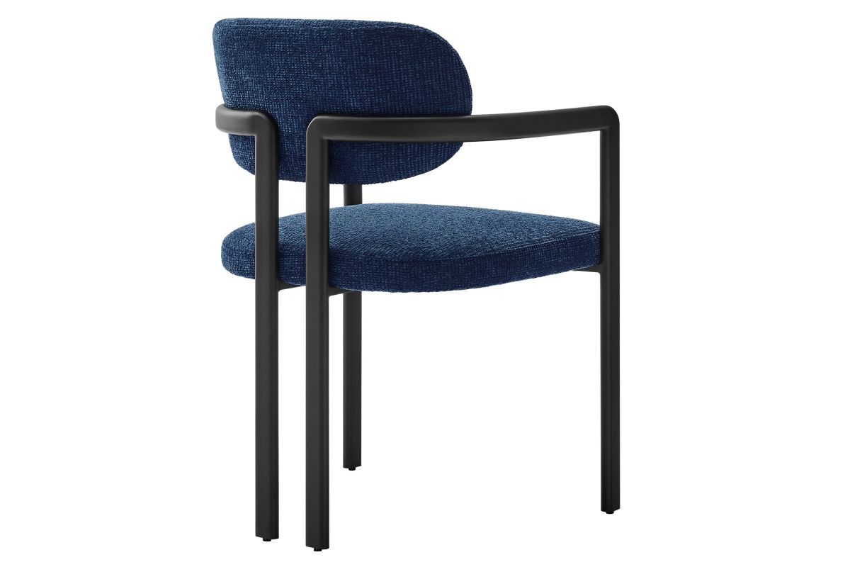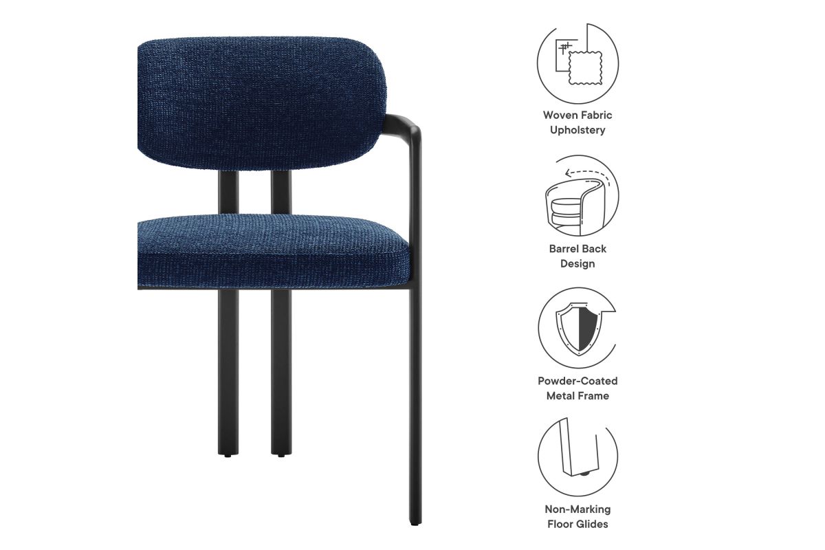 Infuse your dining or living space with the modern sophistication of the Elio Dining Chair. Combining angular metal framing with a rounded barrel chair design, this open back dining chair is a harmonious balance of geometry and softness. Its powder-coated metal frame features clean lines and a sculptural silhouette, while the padded seat and backrest of this upholstered chair are covered in a richly textured woven fabric for a tactile, cozy feel. Better for you and the environment, the upholstery fabric is also OEKO-TEX� STANDARD 100 certified. The open-back design adds an airy elegance, making Elio equally suited as a dining chair, accent chair, or office chair. Fully assembled and equipped with adjustable non-marking floor glides, this modern barrel chair ensures hassle-free setup and floor protection. Whether placed in a contemporary dining room, a cozy breakfast nook, or a stylish workspace, the Elio Dining Chair makes a statement with its modern charm and versatile design. Weight Capacity: 300 lbs.