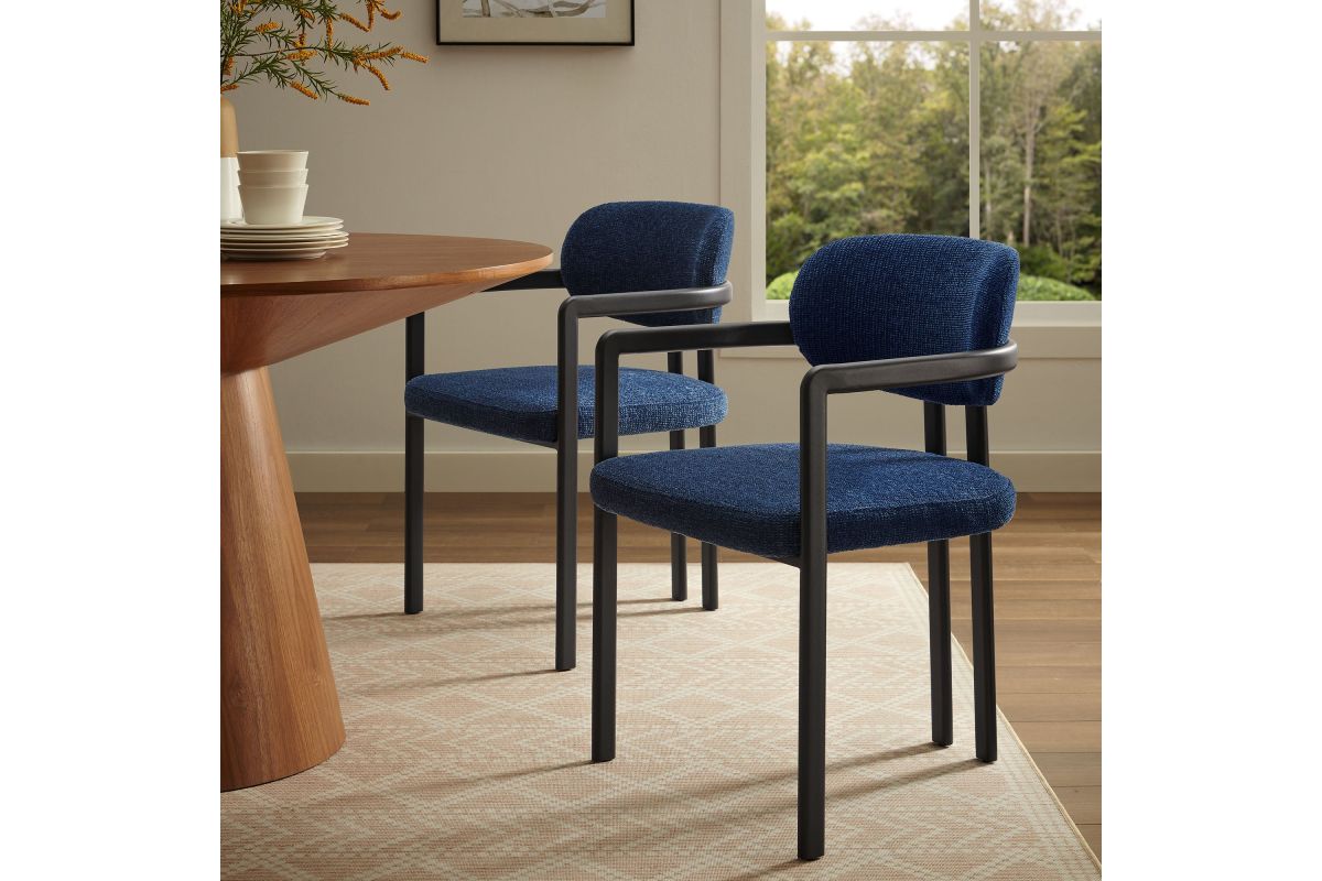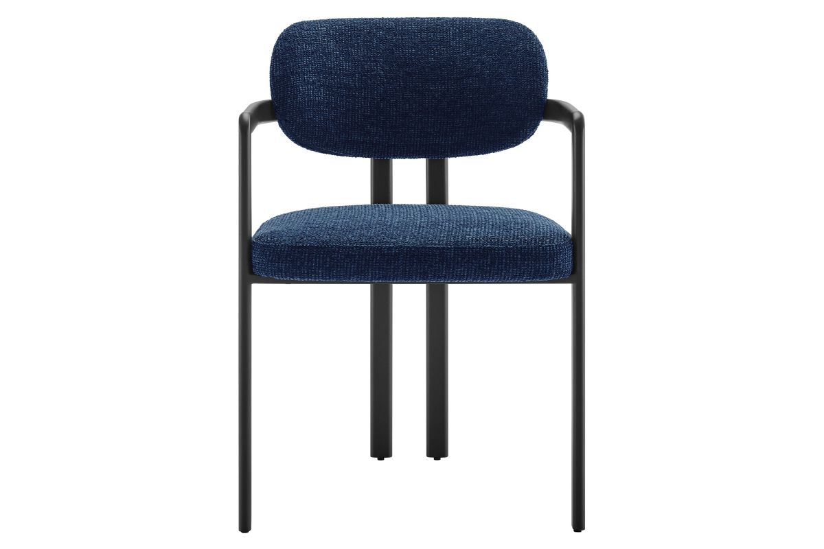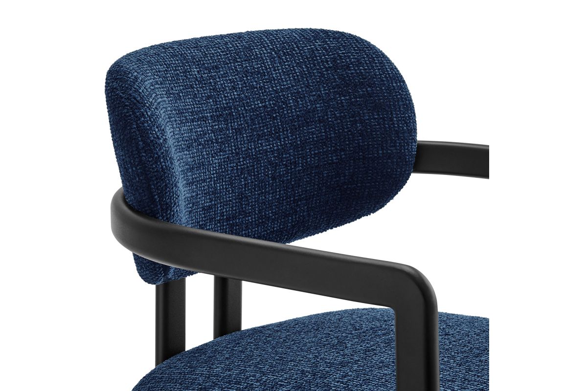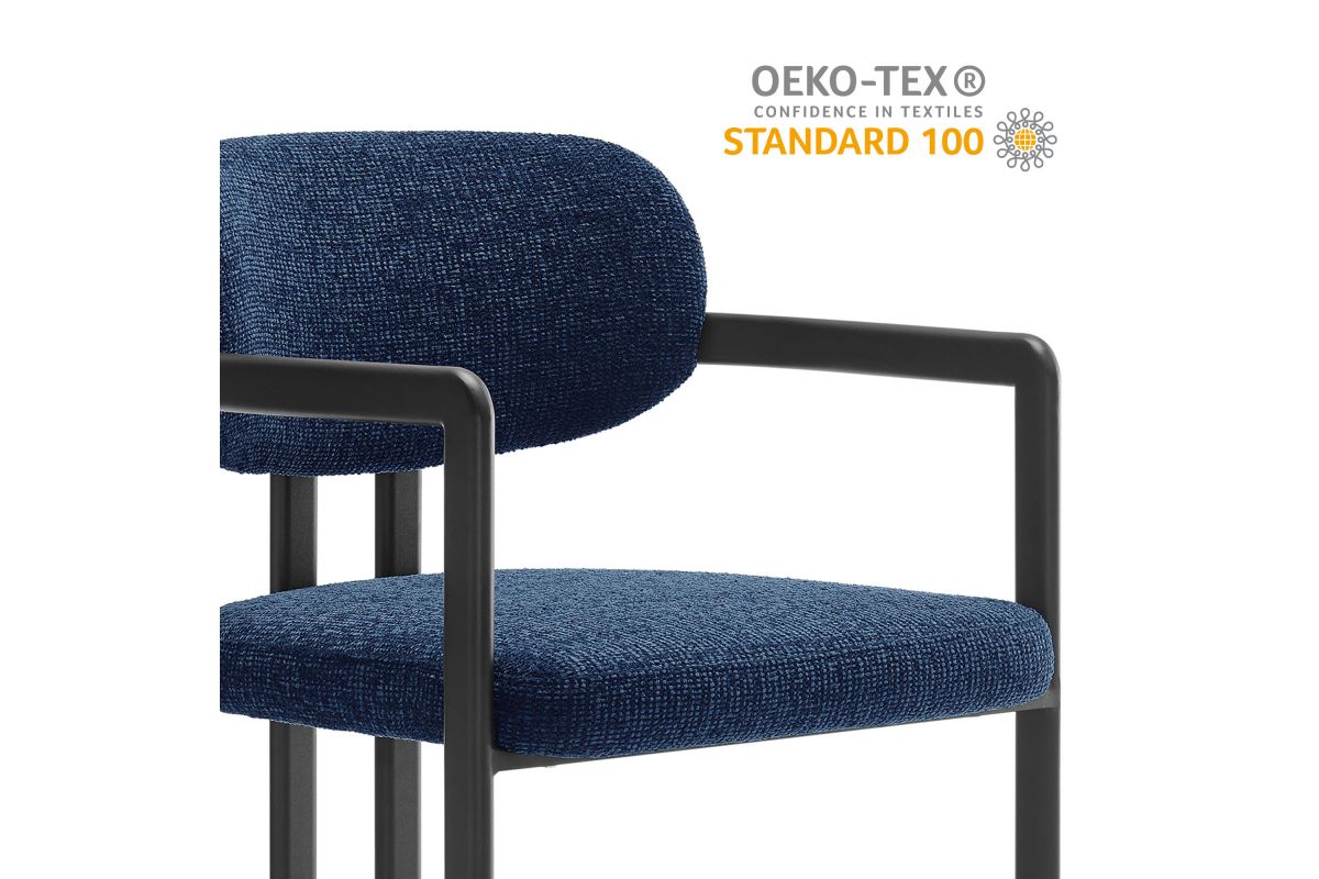Infuse your dining or living space with the modern sophistication of the Elio Dining Chair. Combining angular metal framing with a rounded barrel chair design, this open back dining chair is a harmonious balance of geometry and softness. Its powder-coated metal frame features clean lines and a sculptural silhouette, while the padded seat and backrest of this upholstered chair are covered in a richly textured woven fabric for a tactile, cozy feel. Better for you and the environment, the upholstery fabric is also OEKO-TEX� STANDARD 100 certified. The open-back design adds an airy elegance, making Elio equally suited as a dining chair, accent chair, or office chair. Fully assembled and equipped with adjustable non-marking floor glides, this modern barrel chair ensures hassle-free setup and floor protection. Whether placed in a contemporary dining room, a cozy breakfast nook, or a stylish workspace, the Elio Dining Chair makes a statement with its modern charm and versatile design. Weight Capacity: 300 lbs.