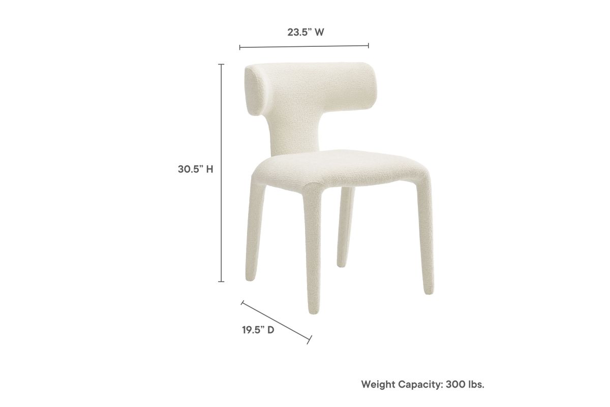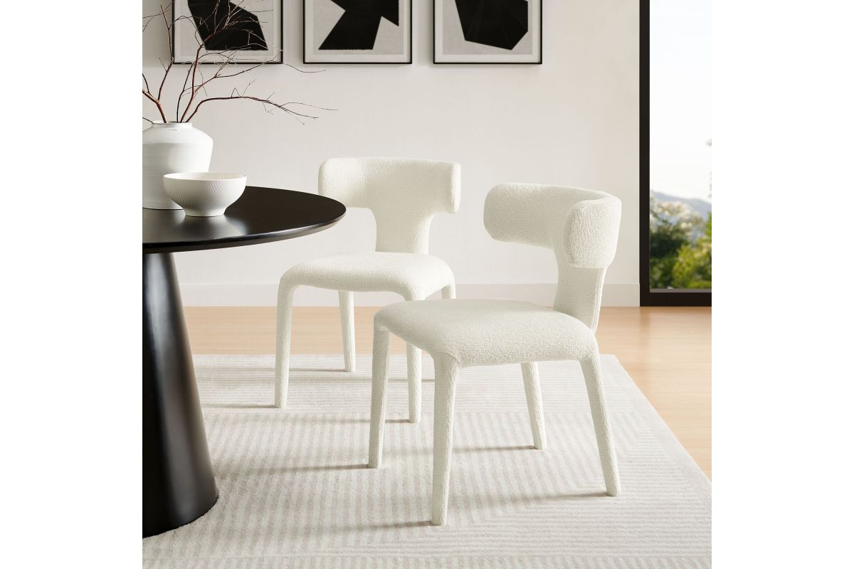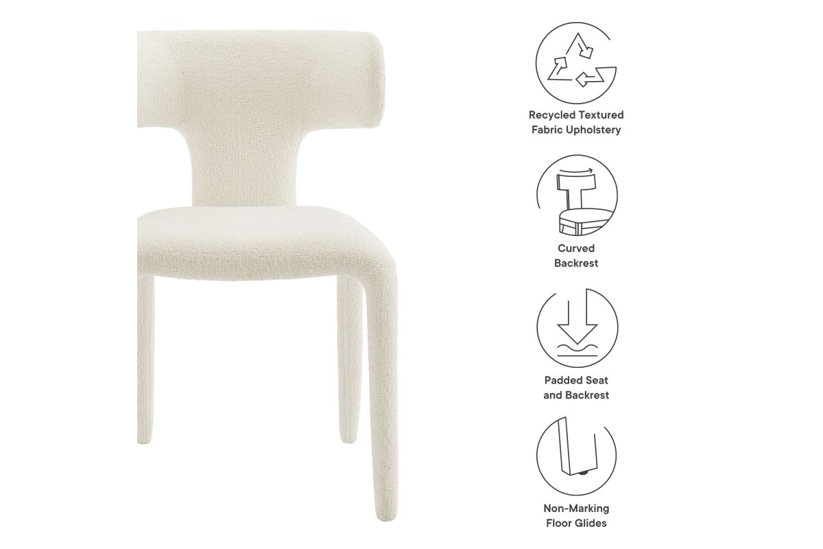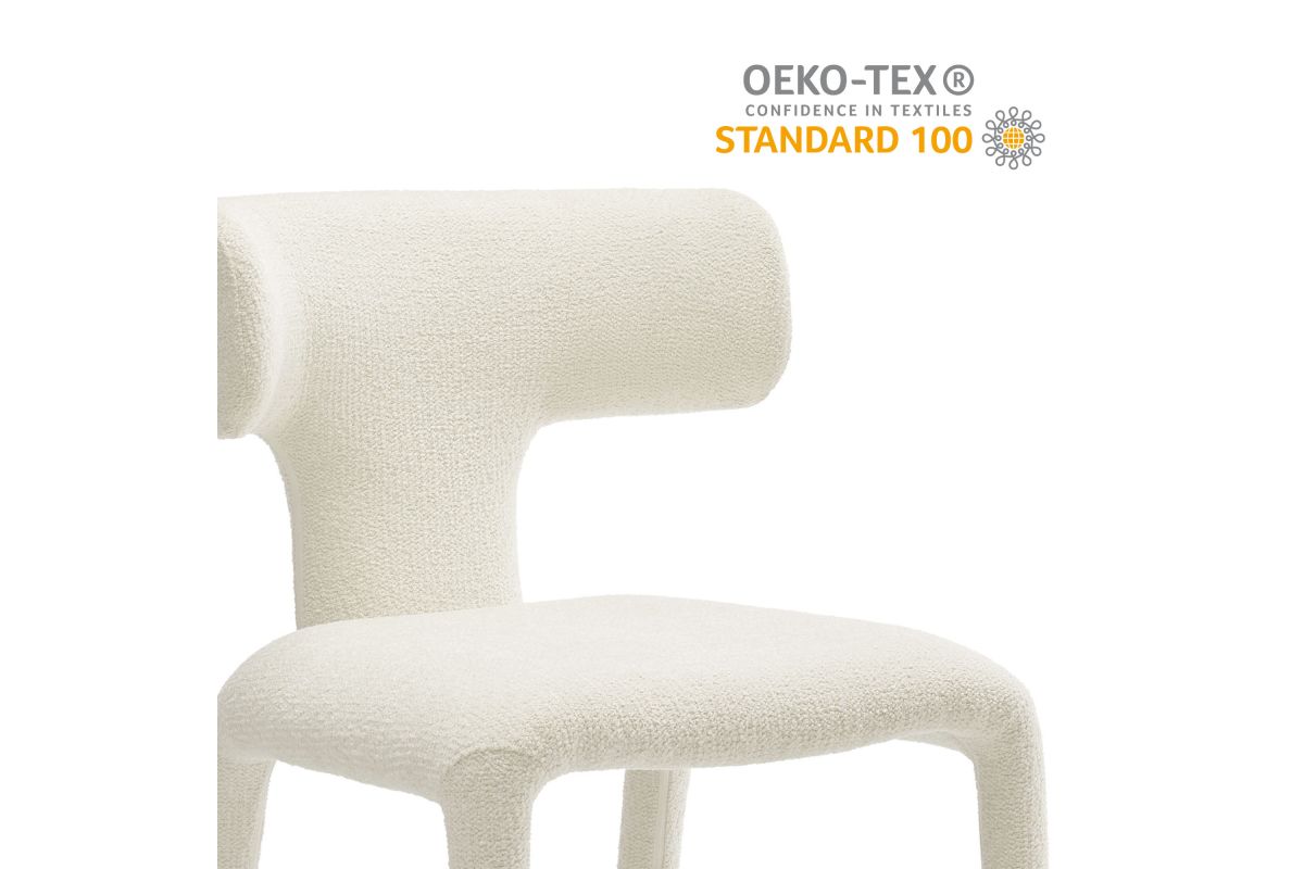 Introduce a sophisticated yet inviting charm to your dining or living area with the set of 2 Stellan Boucle Dining Chair. Fully covered in luxurious boucle fabric, this upholstered chair exudes cozy elegance with its textured depth and tactile appeal. Made from recycled plastic bottles, the upholstery fabric is also OEKO-TEX® STANDARD 100 certified. The curved back dining chair's sculptural silhouette is defined with rounded edges and splayed back legs, creating a modern yet timeless profile. Built on a sturdy metal frame hidden beneath the plush padding, this boucle side chair balances form and function beautifully. Non-marking floor glides protect your floors. Perfect as an armless dining chair, accent chair, or even a stylish guest or desk chair, Stellan is a versatile addition to any contemporary or modern space. Weight Capacity: 300 lbs.