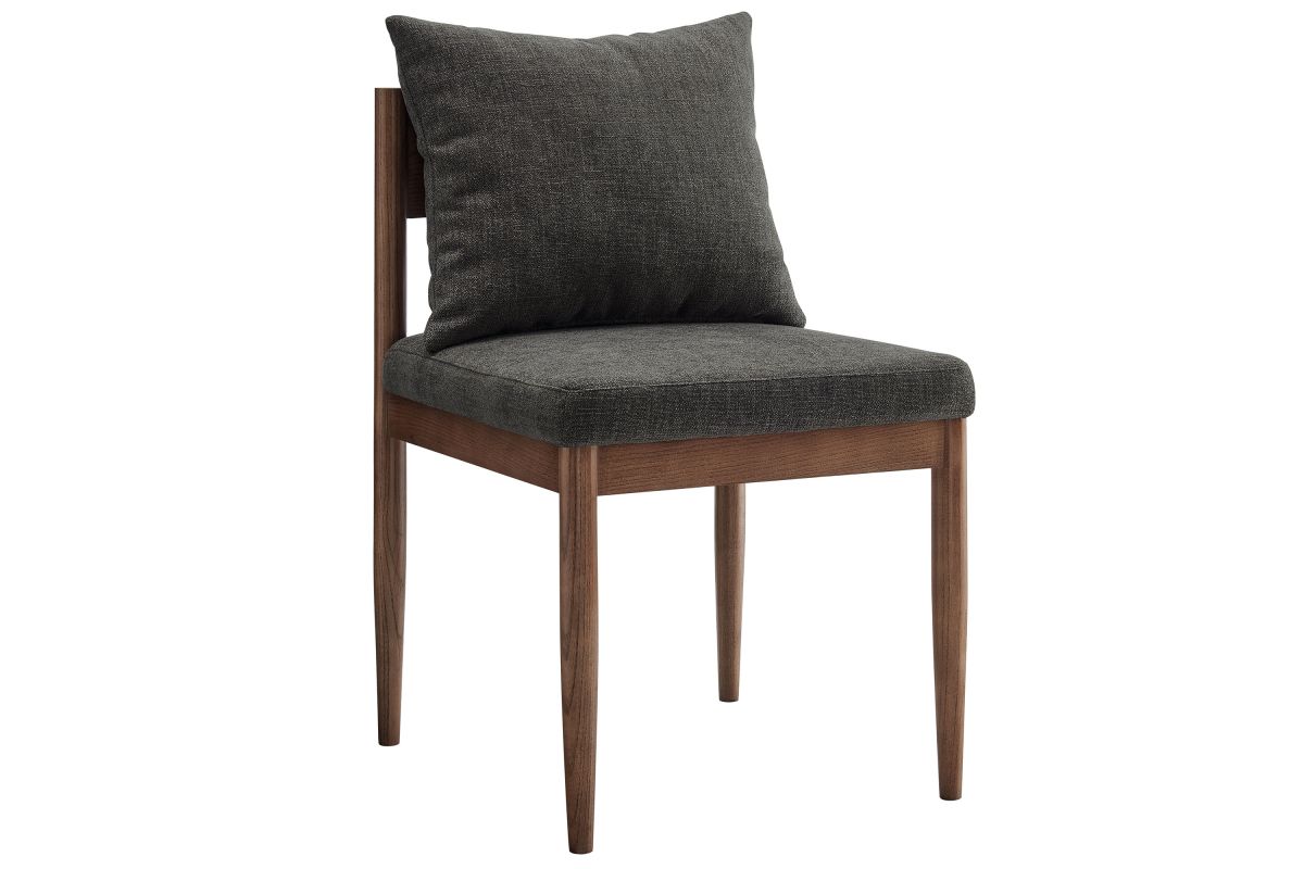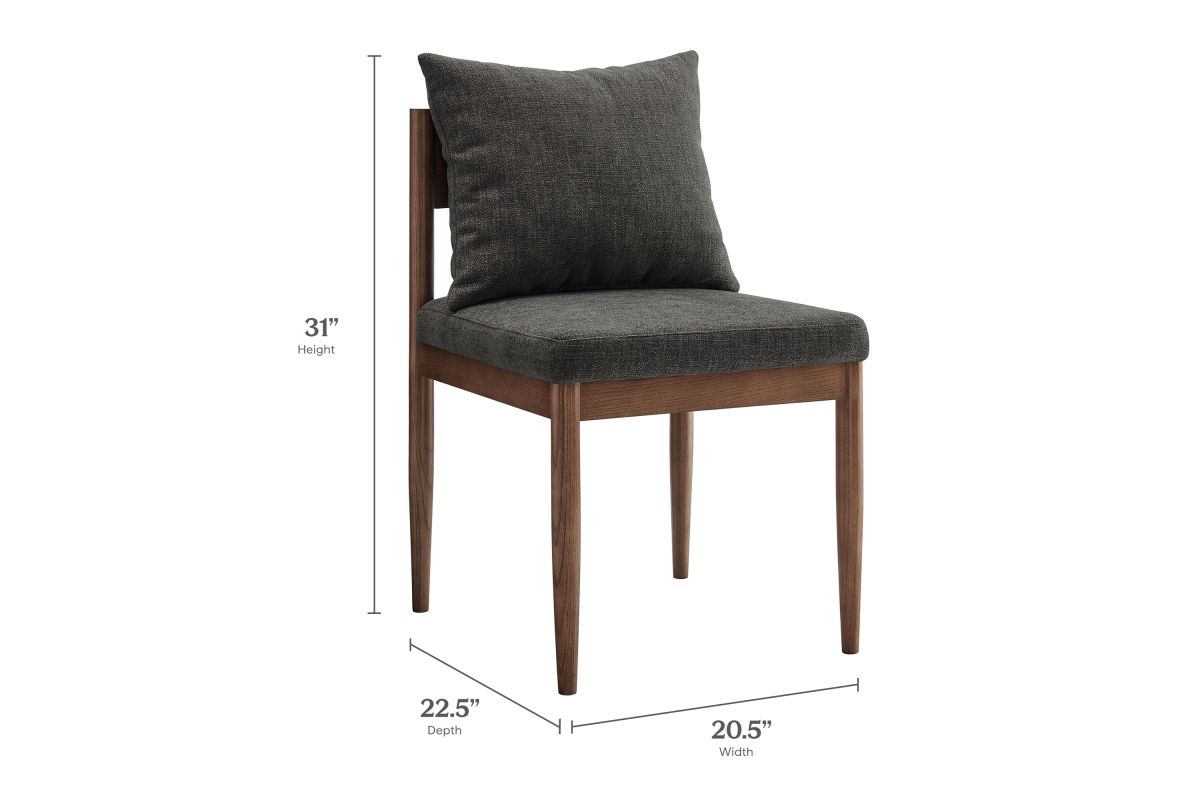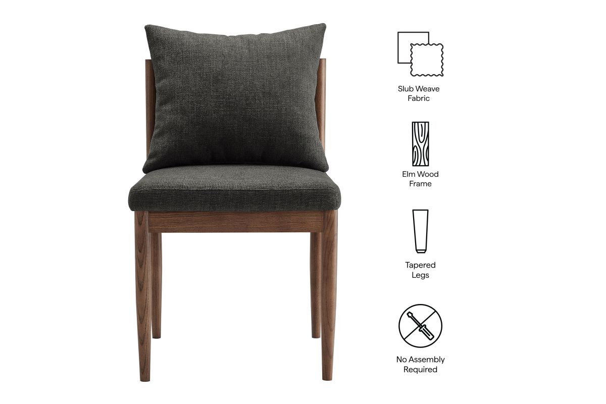 Blending modern elegance with timeless craftsmanship, the Remington Wood Dining Chair offers a refined seating experience. This armless dining chair features a solid elm wood frame with a rich finish, showcasing clean lines and an open back design The foam-padded seat and removable back pillow are wrapped in a slub weave fabric, adding texture and comfort to dining, kitchen, or living spaces. Tapered legs bring a Scandinavian touch, while non-marking foot glides protect floors. Whether as a dining room chair, upholstered side chair, or accent chair, Remington's sophisticated design complements any contemporary setting. Arrives fully assembled. Weight Capacity: 300 lbs.