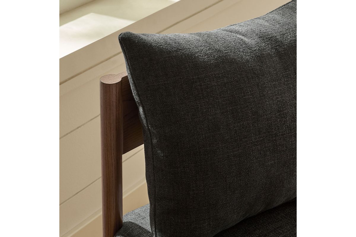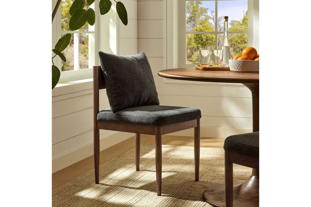 - Solid Elm Wood FrameFoam-Padded SeatRemovable Back Pillow with Slub Weave FabricOpen Back DesignTapered Mid-Century LegsNon-Marking Floor GlidesFully Assembled